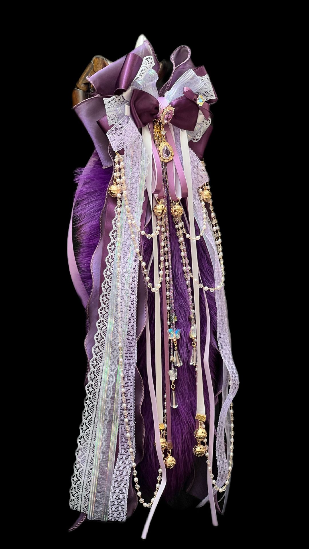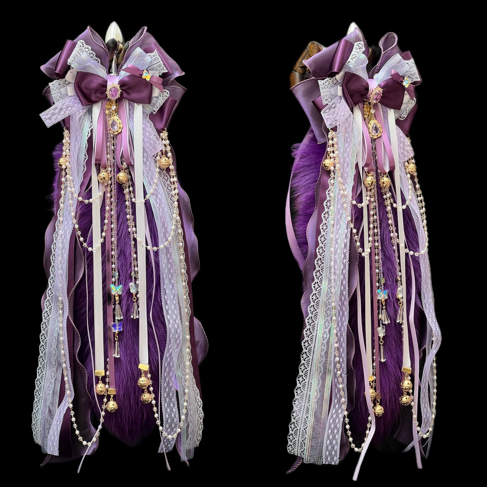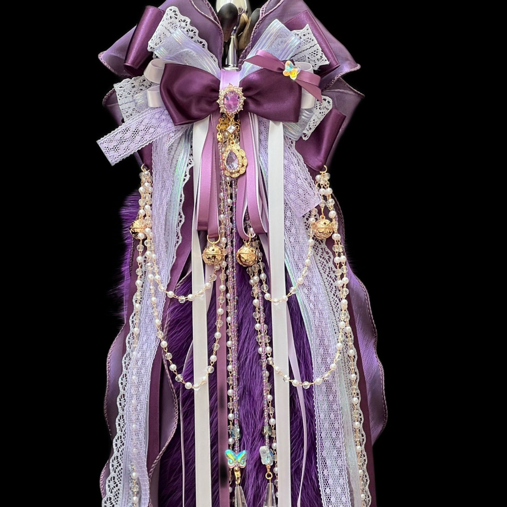 40CM深紫色狐狸真毛尾巴,原创手作重工蝴蝶结绑带可拆卸。
