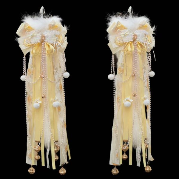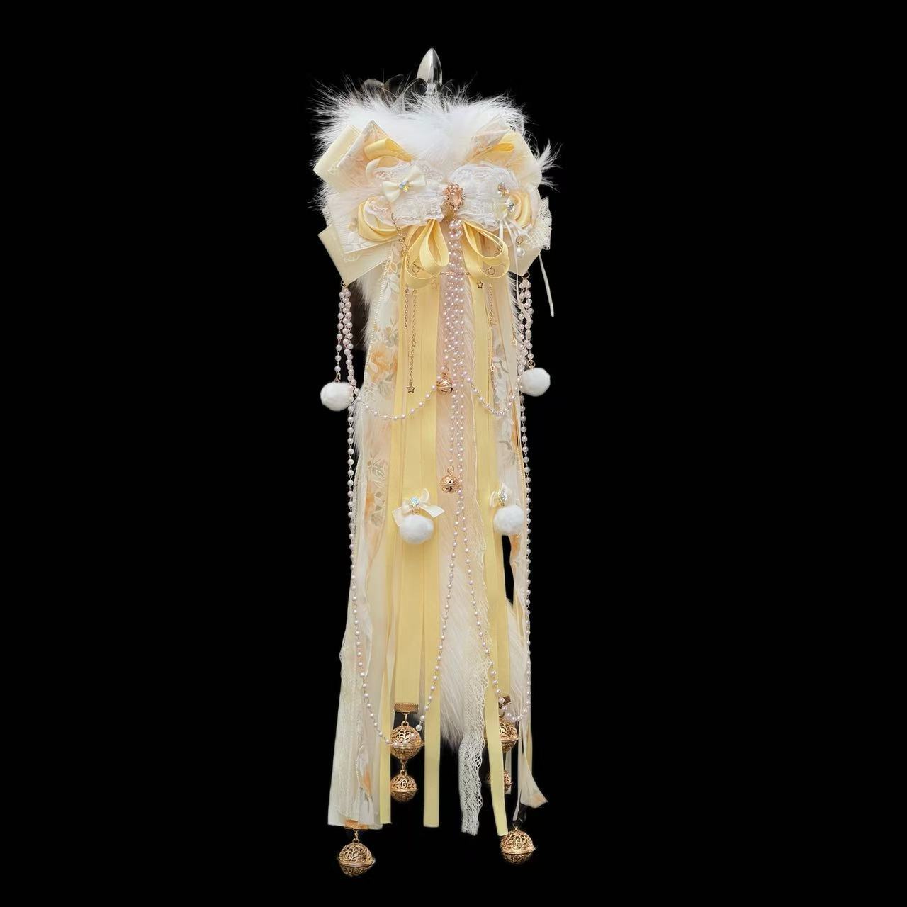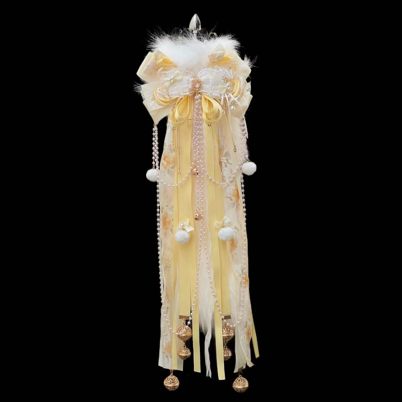 Handmade Milky yellow bowknot fixed non-removable, 1.2CM brass bell, 2.1 2.6CM Palace Bell, imitation pearl chain.