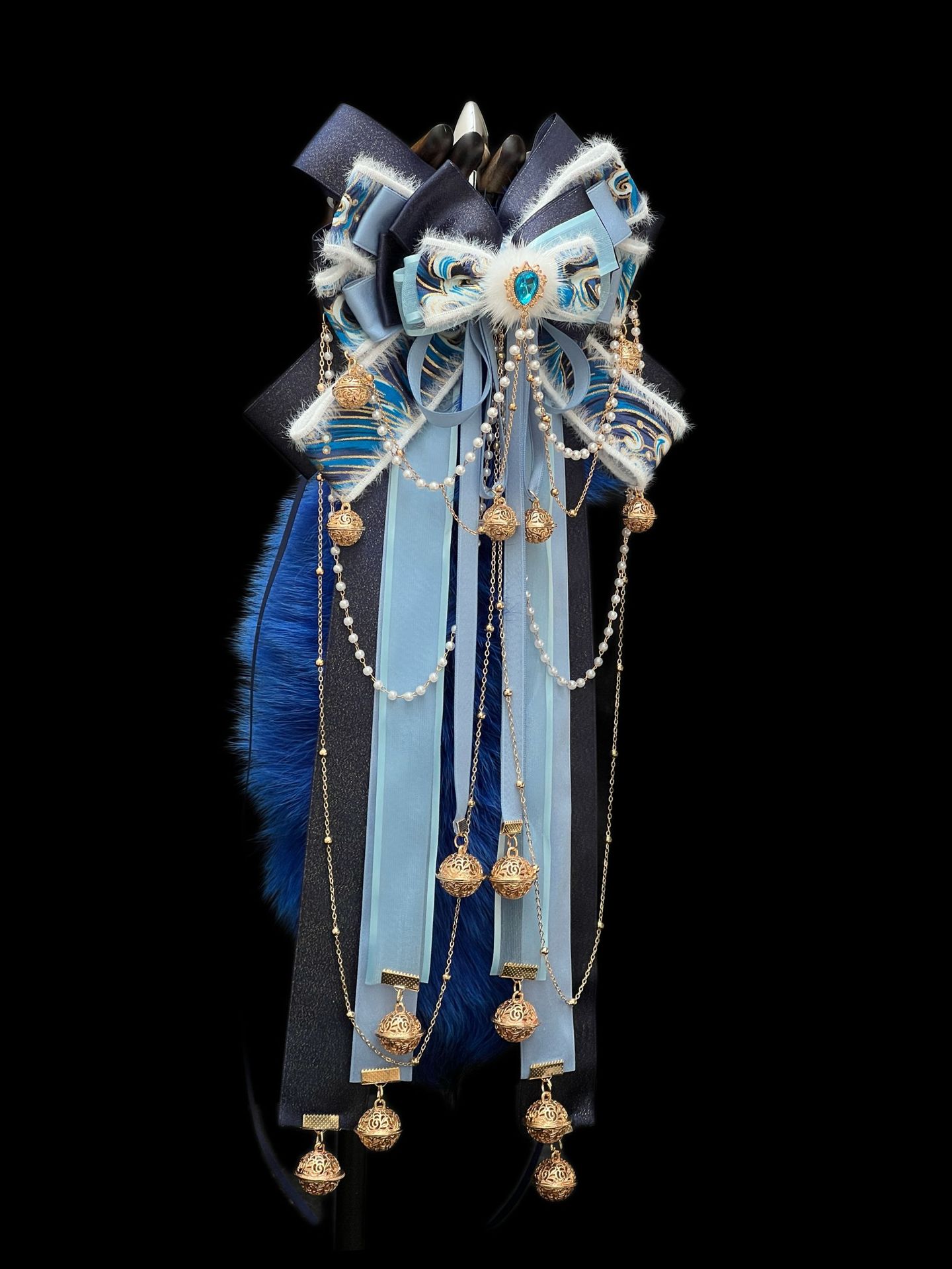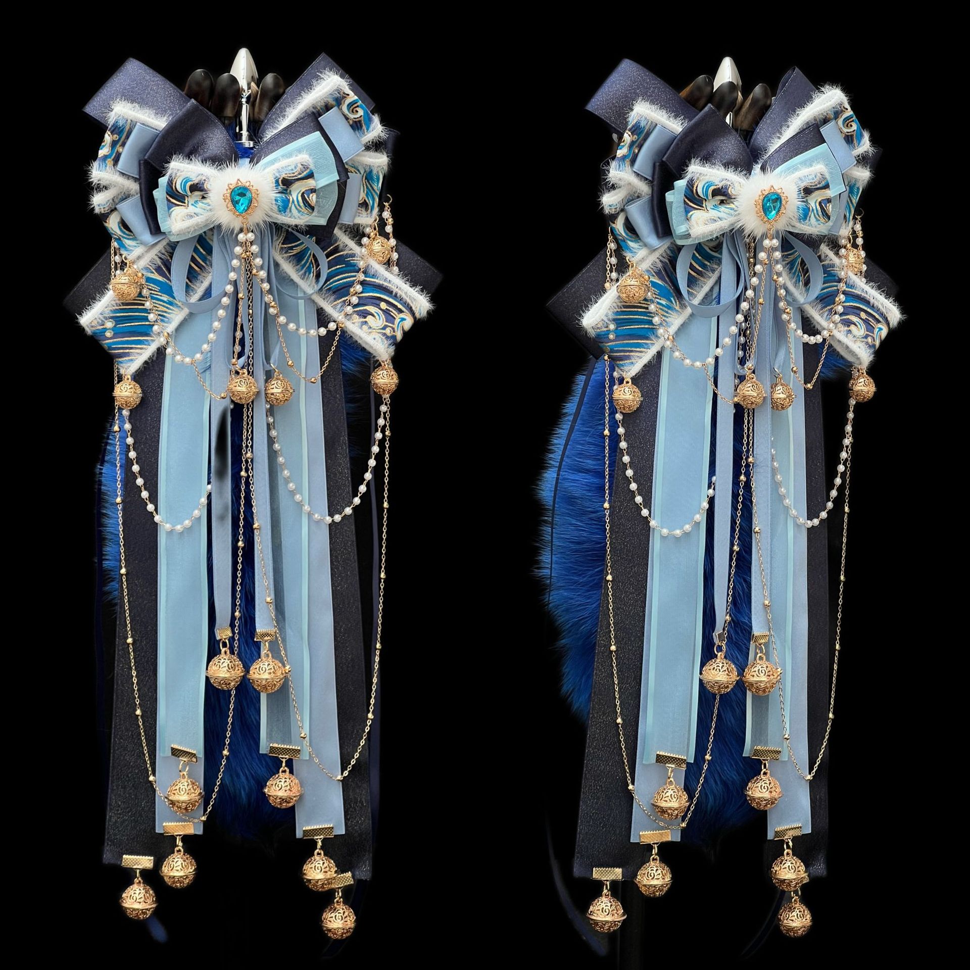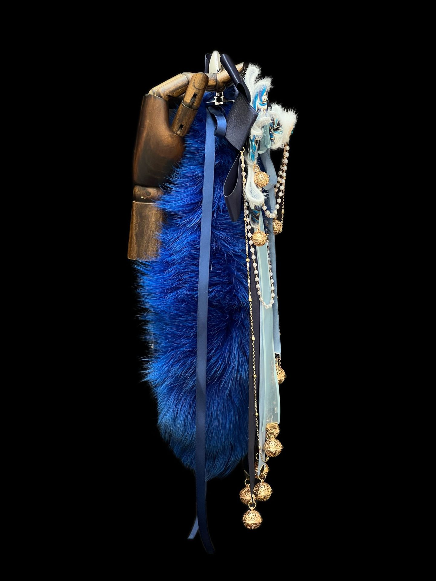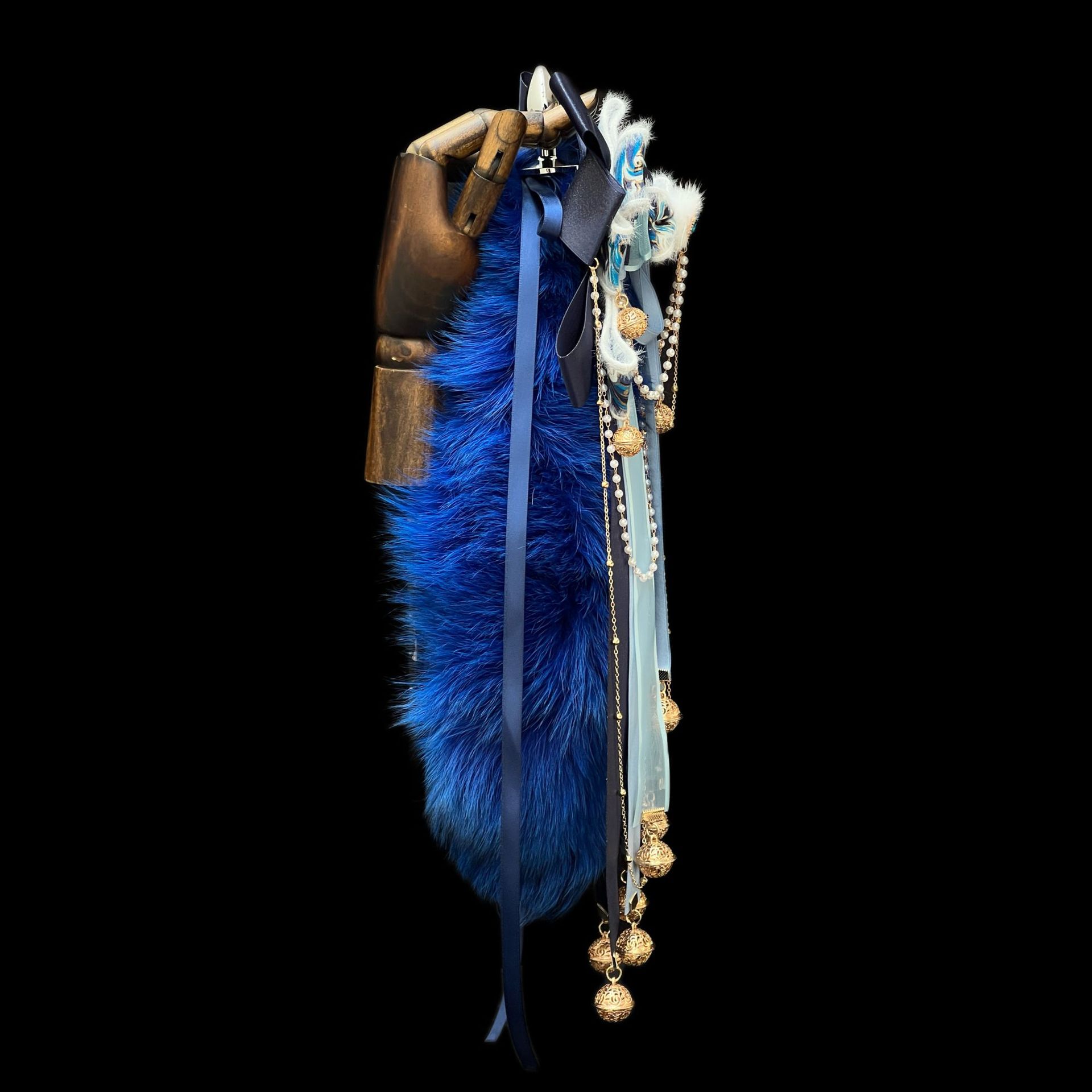 40CM克莱因蓝色狐狸真毛尾巴,原创手作新中式蝴蝶结绑带可拆卸。
