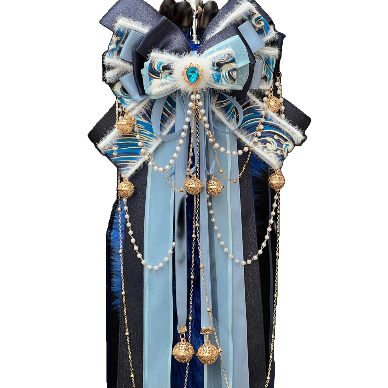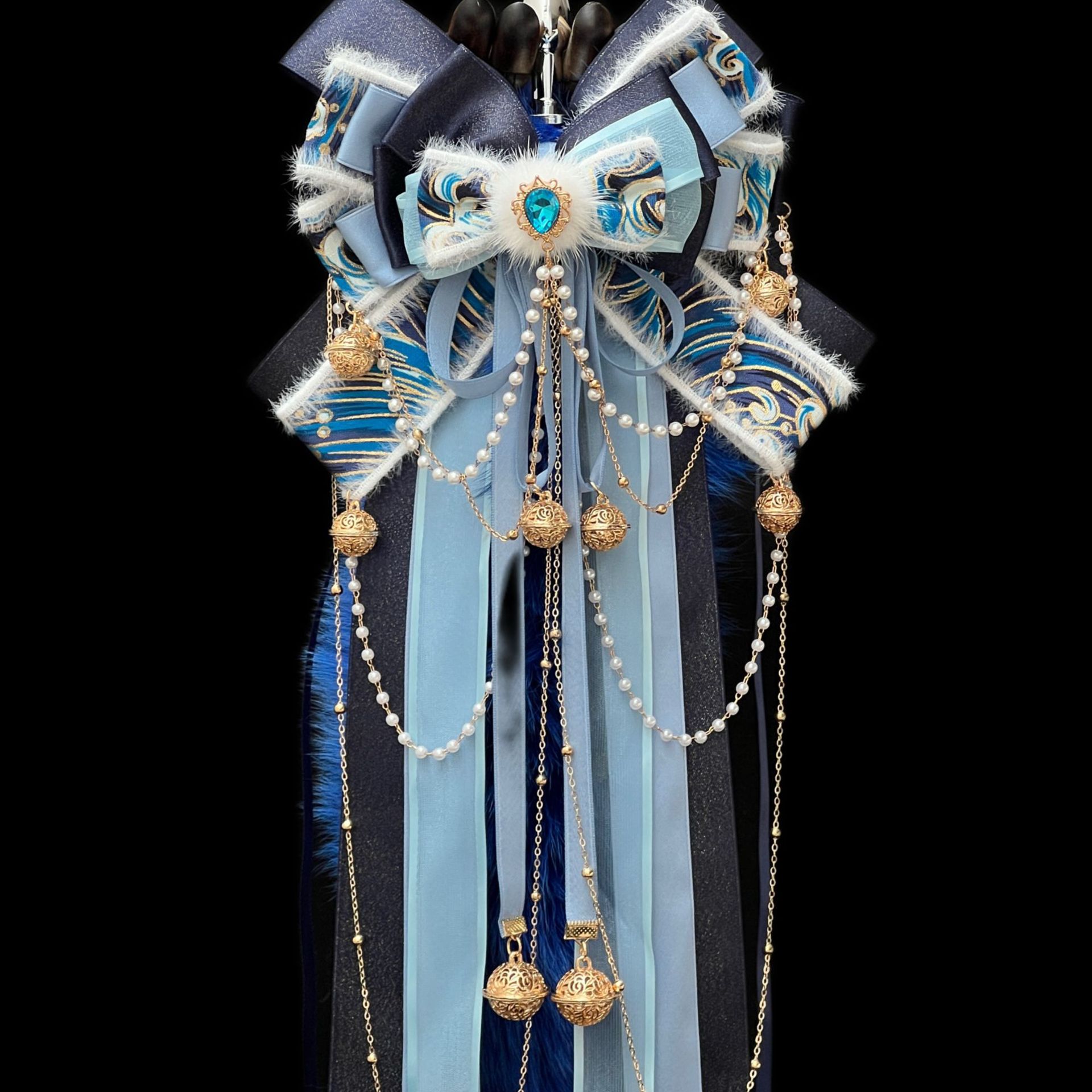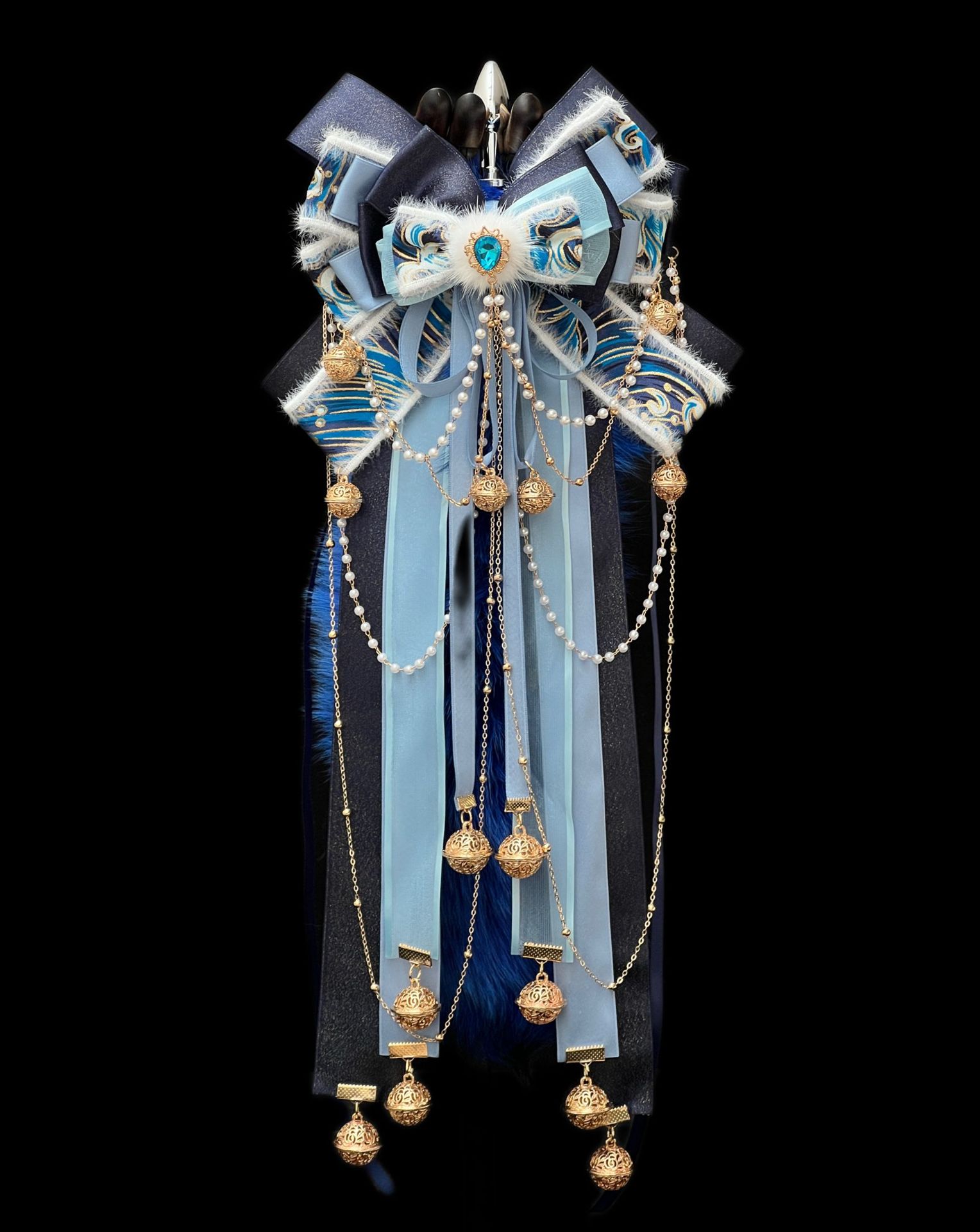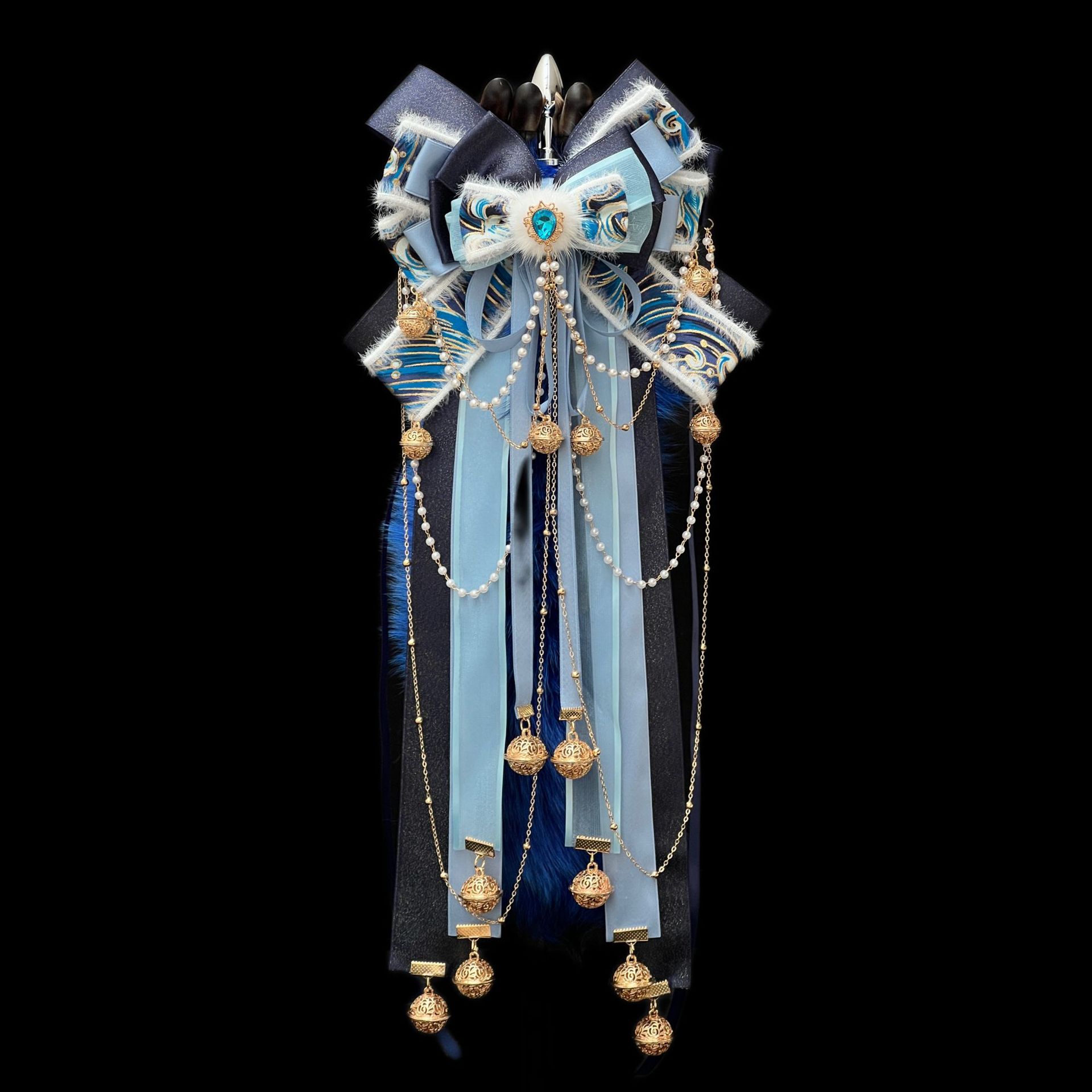 40CM克莱因蓝色狐狸真毛尾巴,原创手作新中式蝴蝶结绑带可拆卸。
