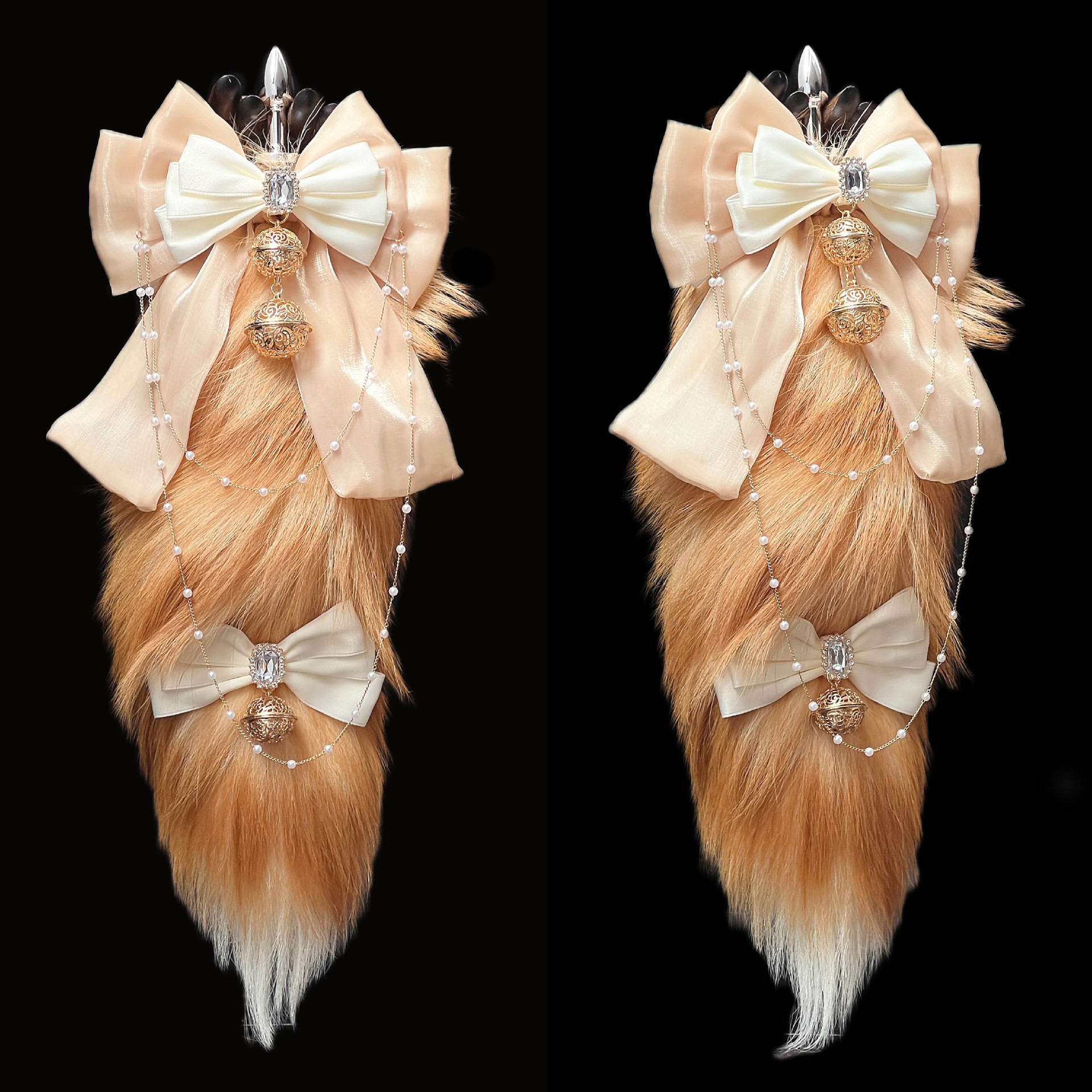 40CM light gold fox real hair tail anal plug head detachable SM sex toys hand bow palace bell ring
