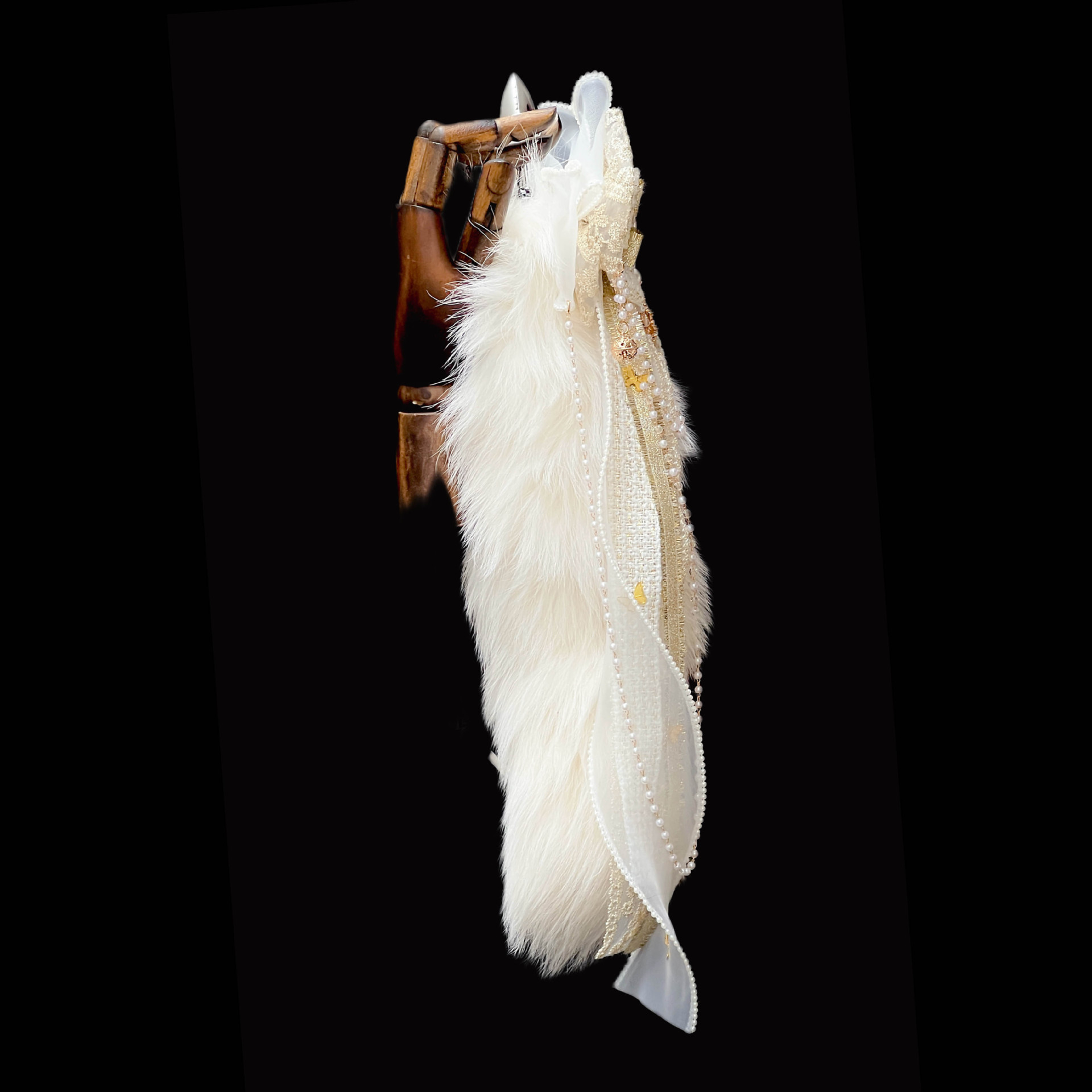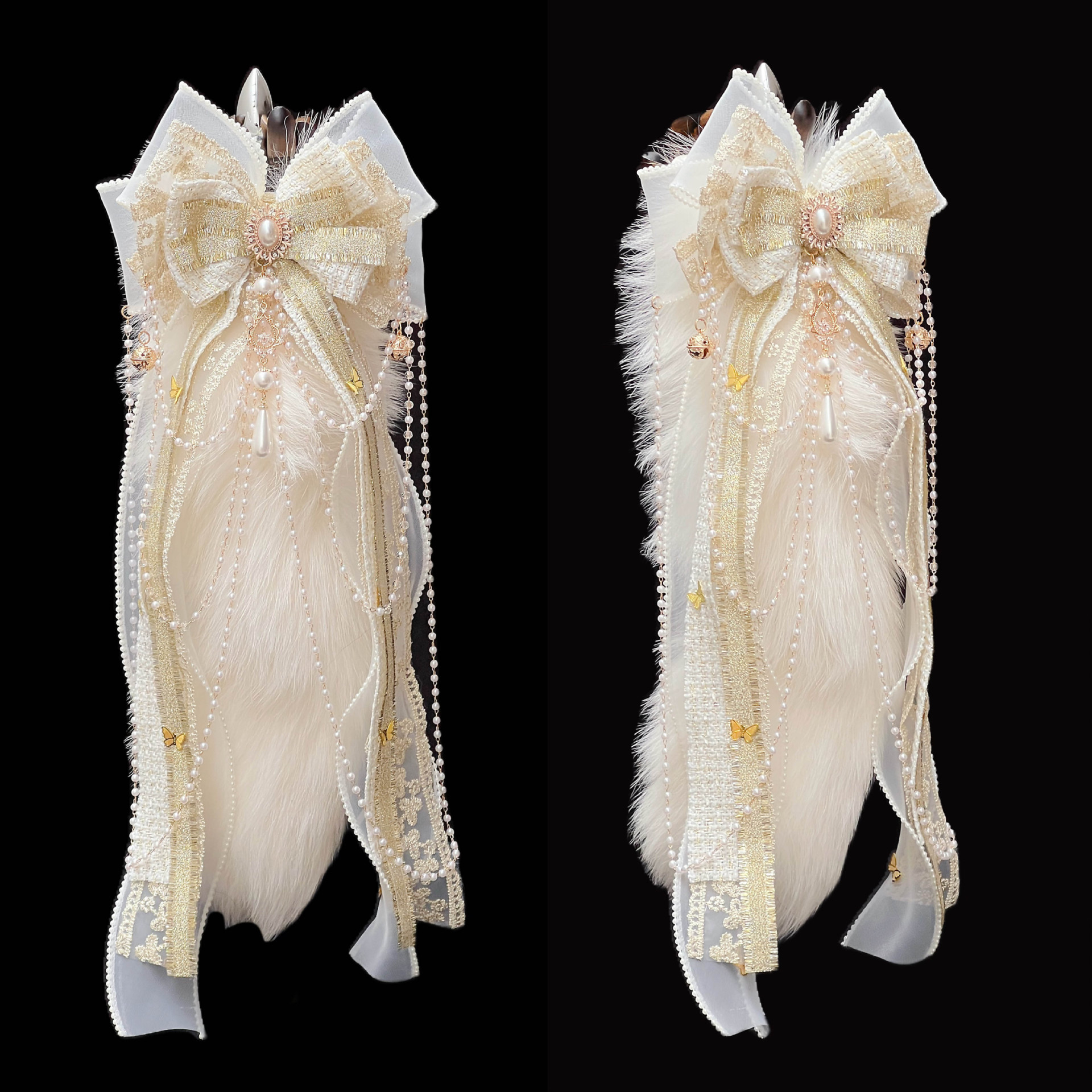 **40CM Milk White Fox Real Wool Tail Butt Plug – Handmade Retro Bow & Bell Ring with Shell Pearls**