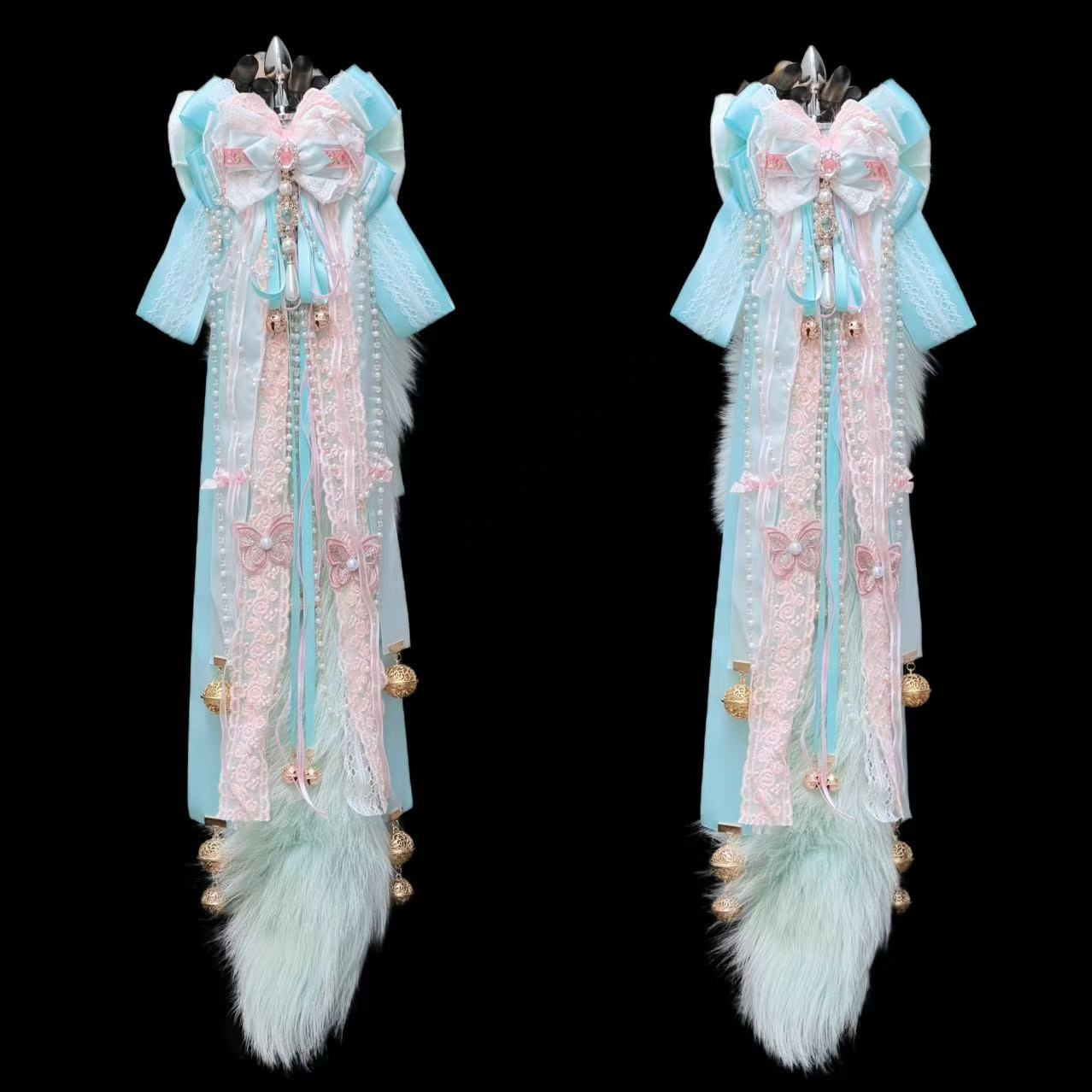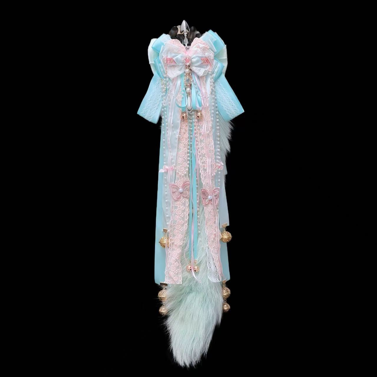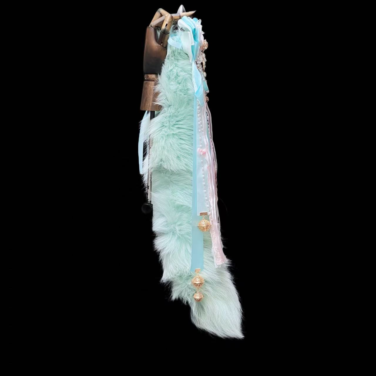 60cm Mint Green Fox Real Wool Tail with Pink Bow Bell