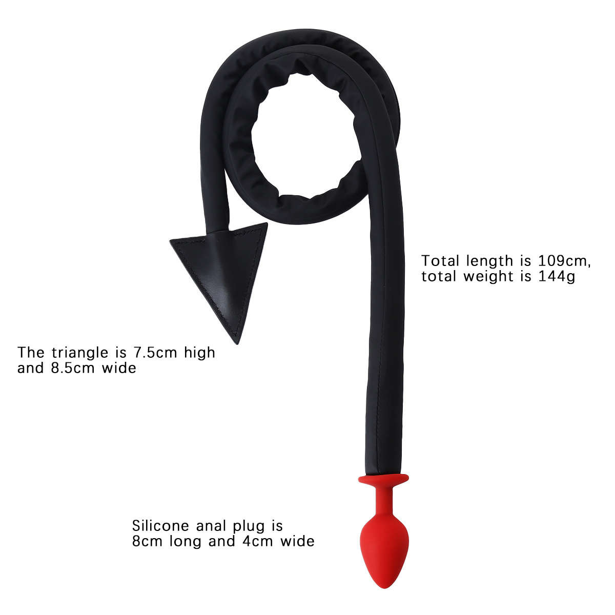 This product is made of silicone. The anal plug is made of red silicone and has a triangular design at the end of the tail. Anal plug size: diameter approximately 40mm. Tail size: total length approximately 109cm. Weight is approximately 144g.