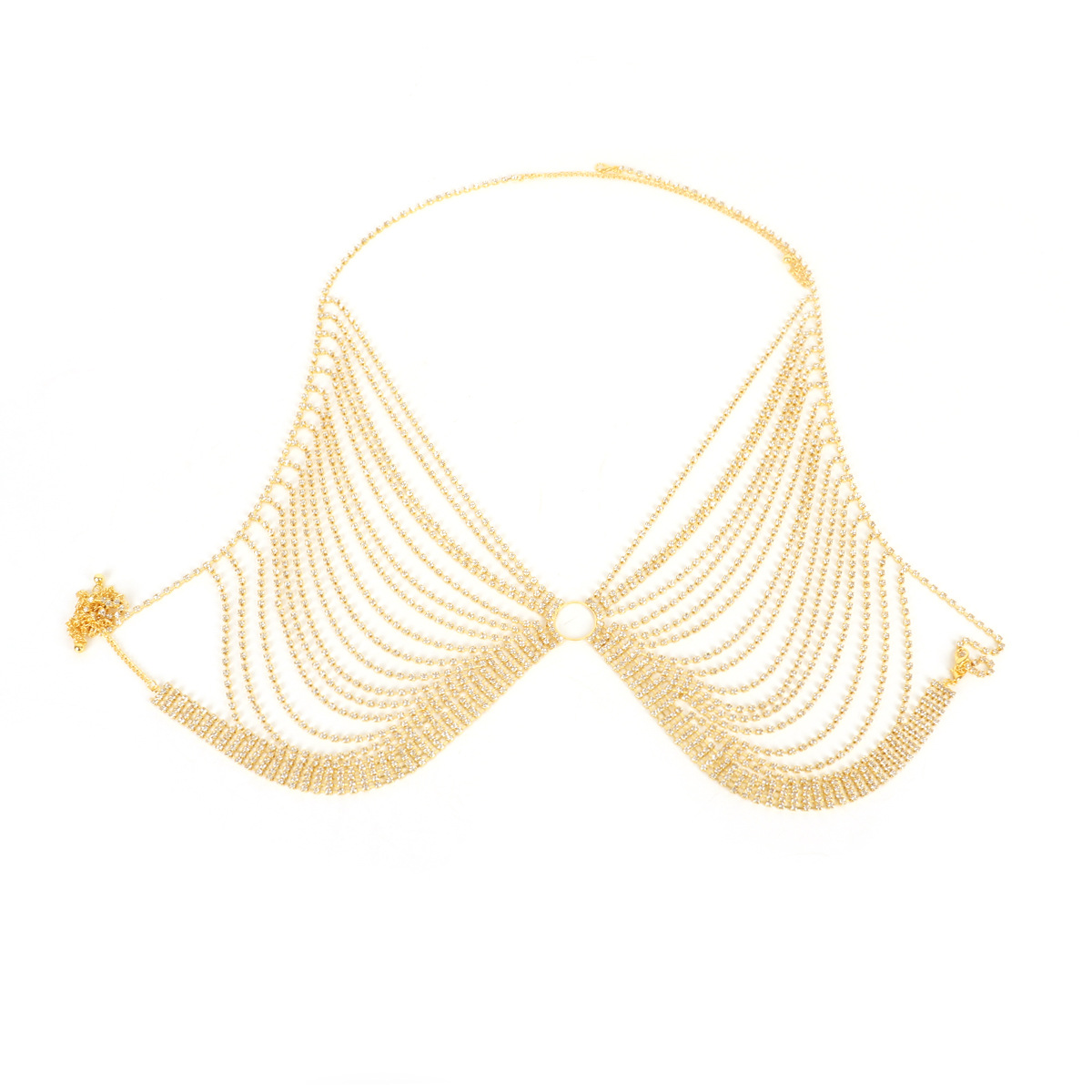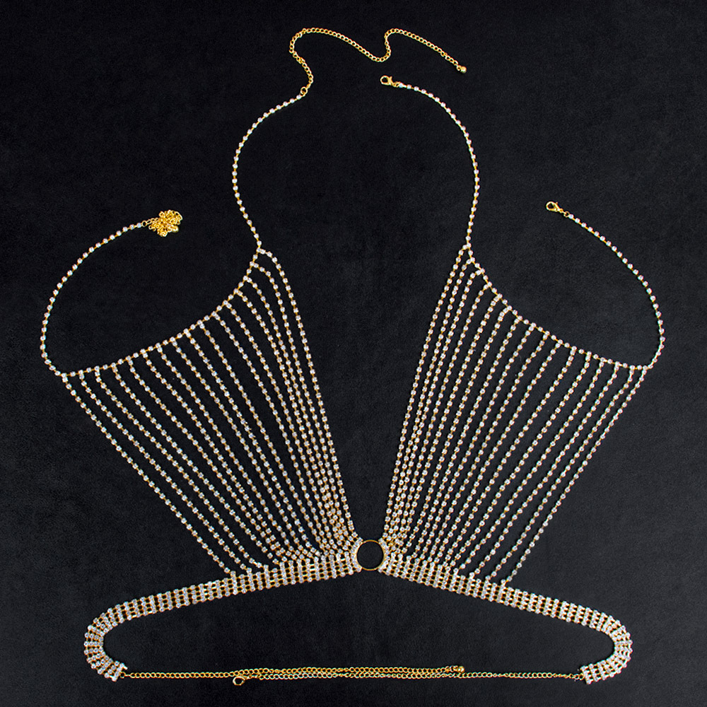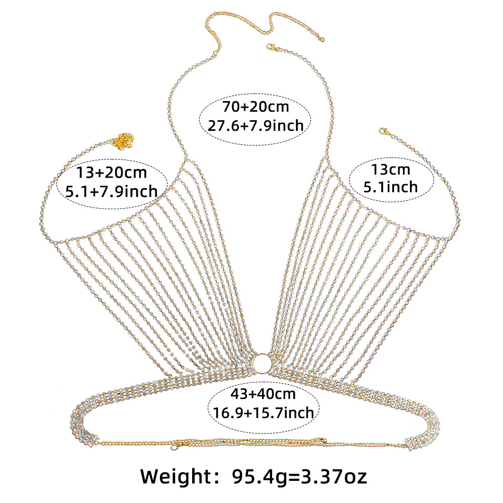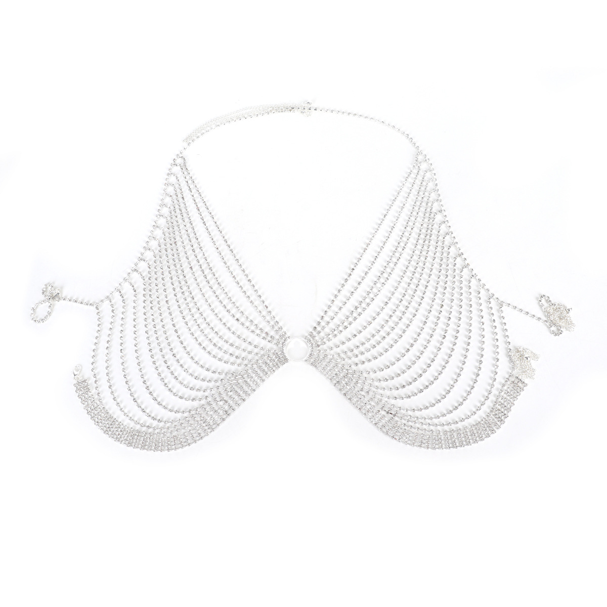 A dazzling chest chain that elevates any outfit. This geometric, rhinestone-studded body chain adds a touch of sexy, nightclub-ready glamour. Perfect for bikinis or evening wear, its simple yet shiny design makes a bold fashion statement.