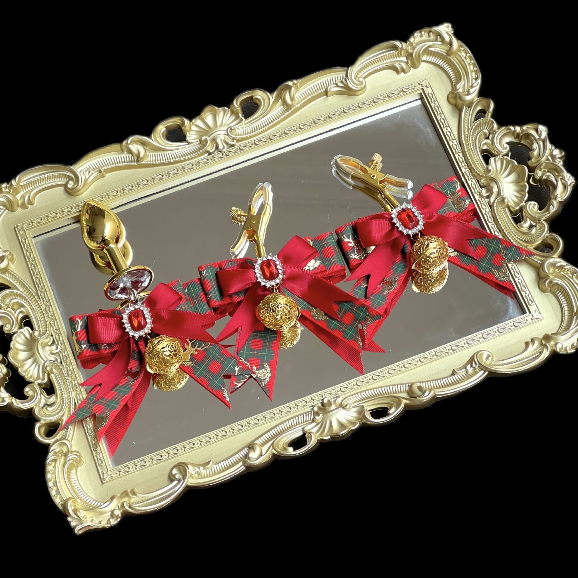 Christmas Elk Fantasy Set: Unleash your inner holiday vixen with this playful set. Featuring handmade nipple clamps adorned with festive bows and bells, a luxurious 40cm fox tail butt plug, and a matching ring. Crafted for adult play, this set adds a touch of naughty Christmas cheer to intimate moments.