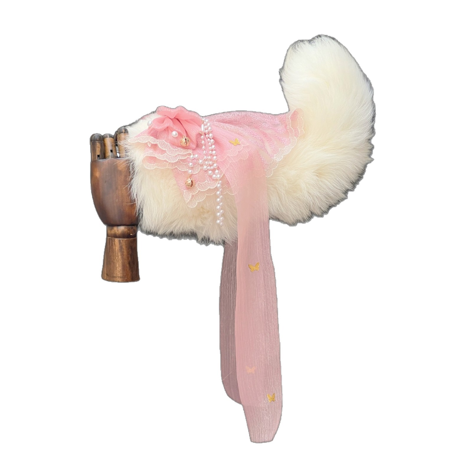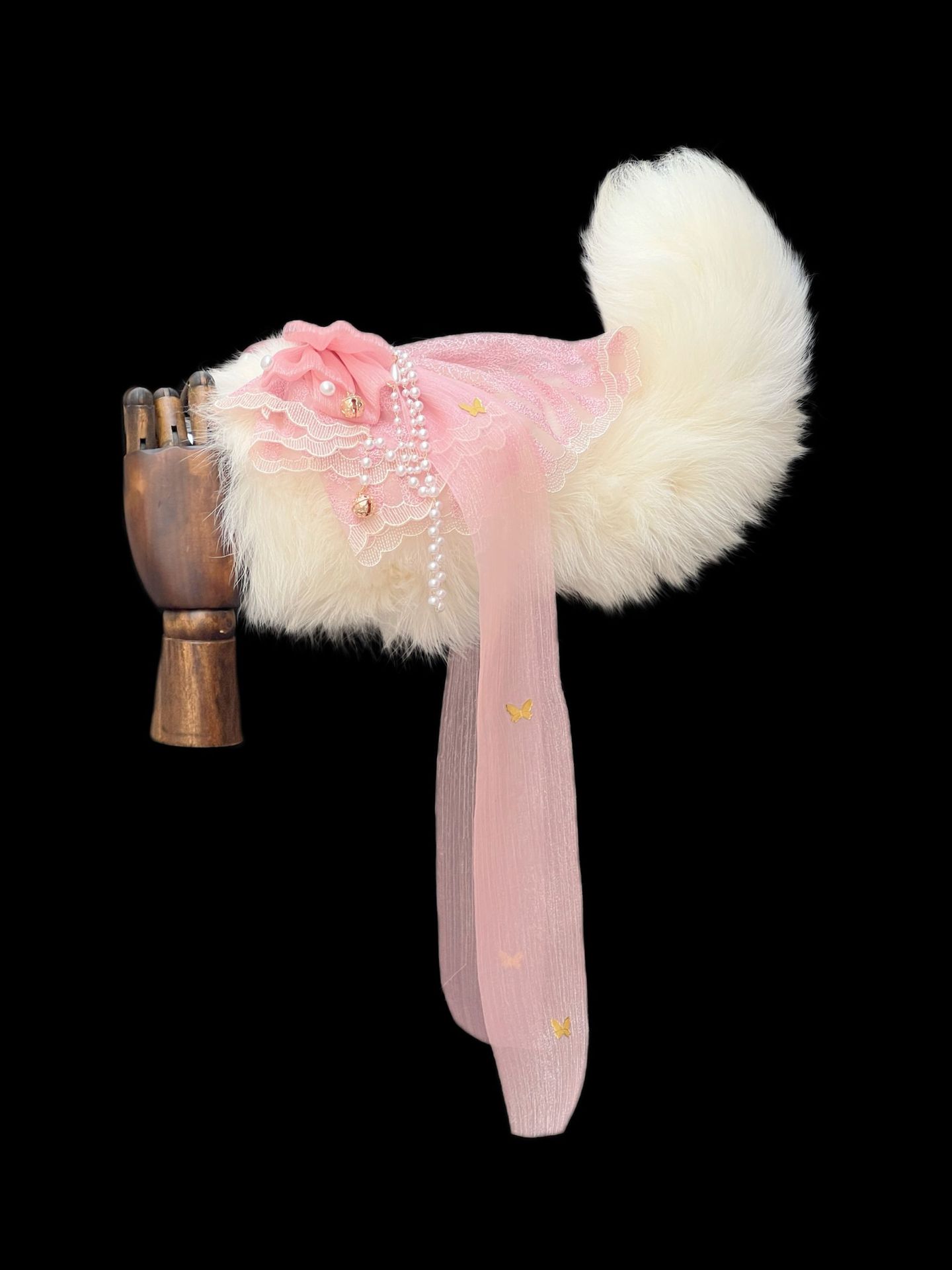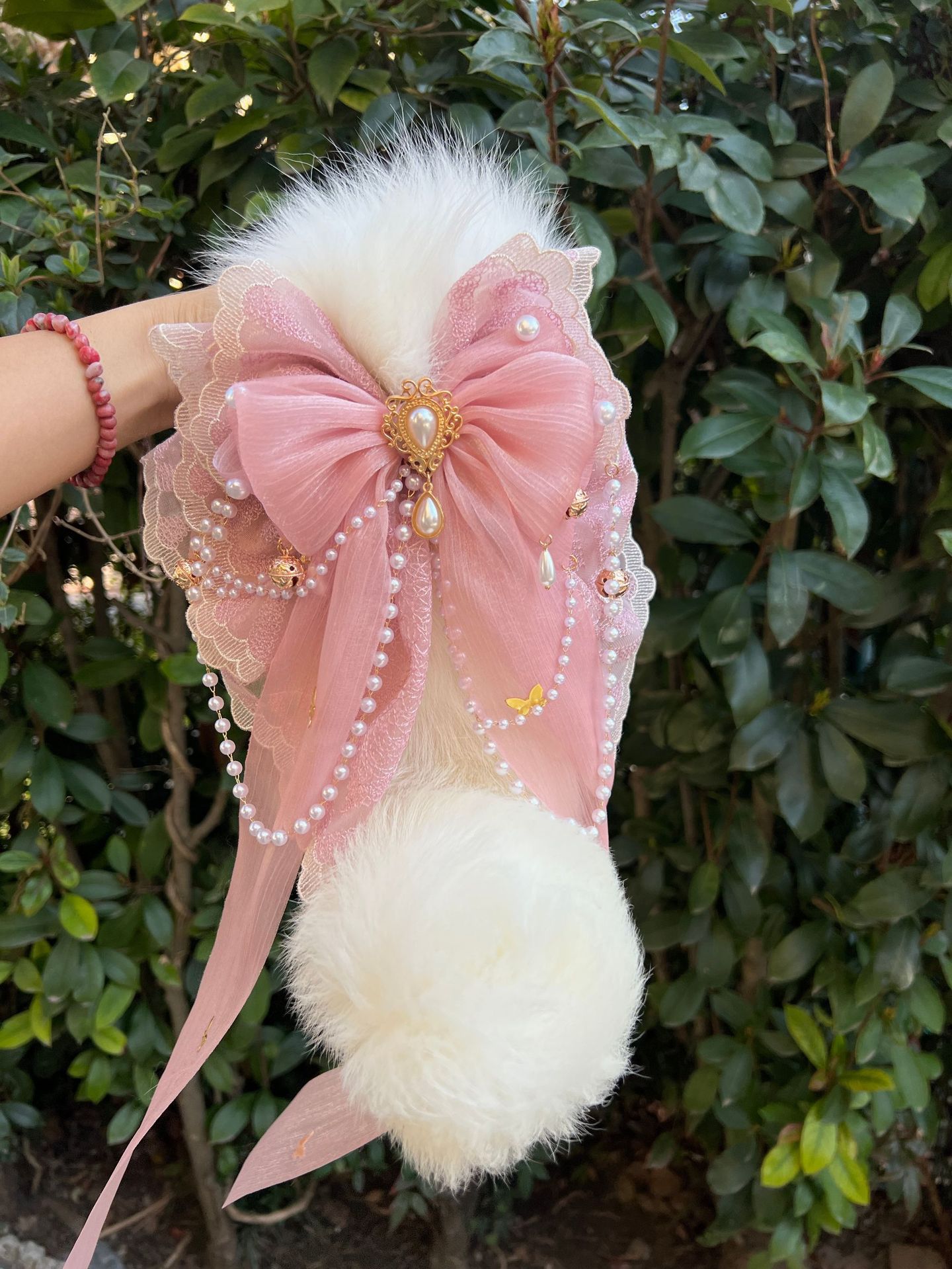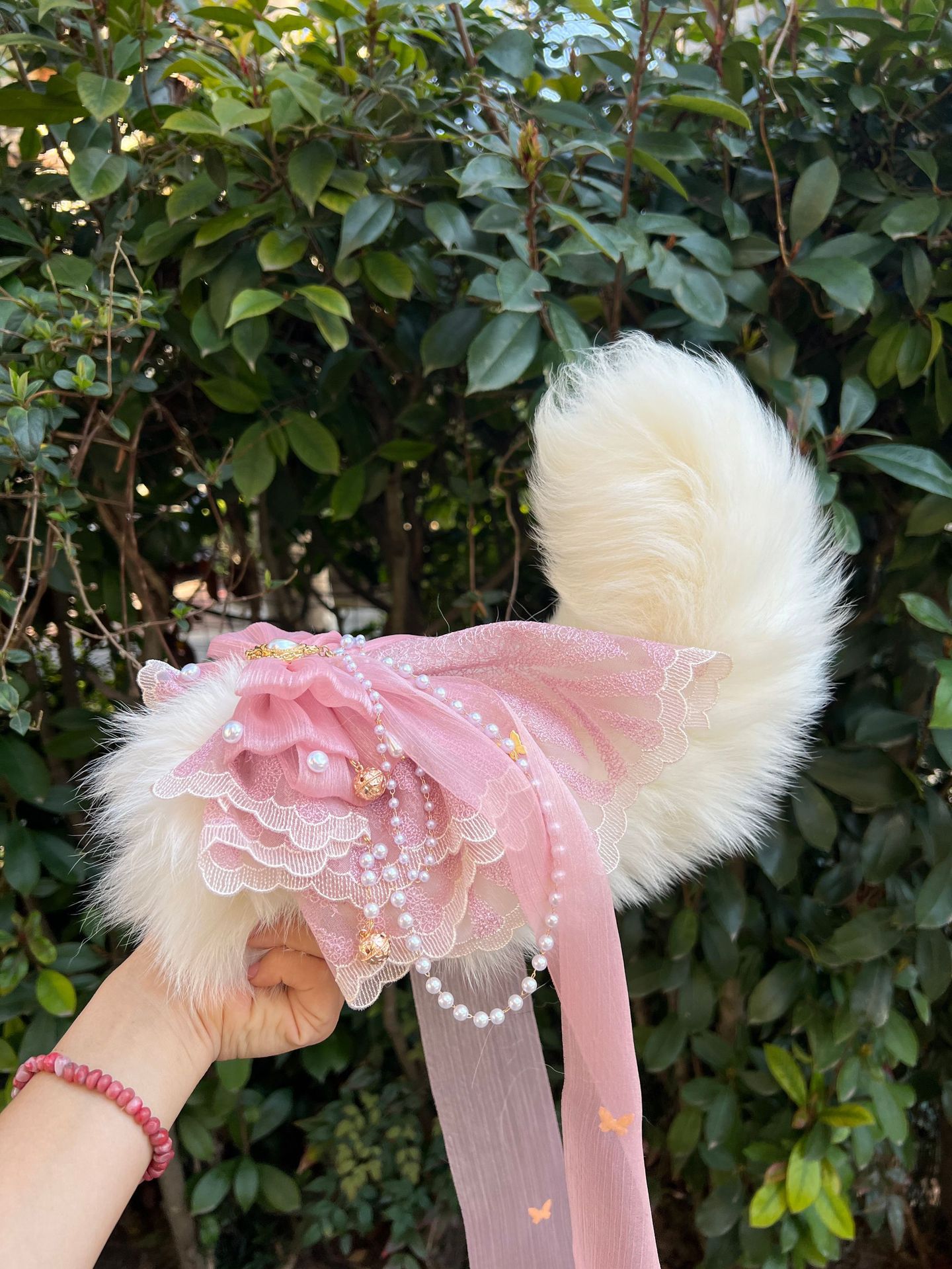Voice-Controlled Pink Fox Tail Butt Plug with Lace Bow and Bell