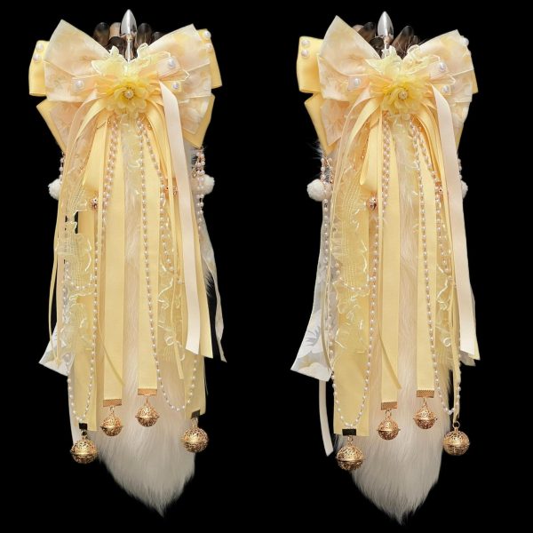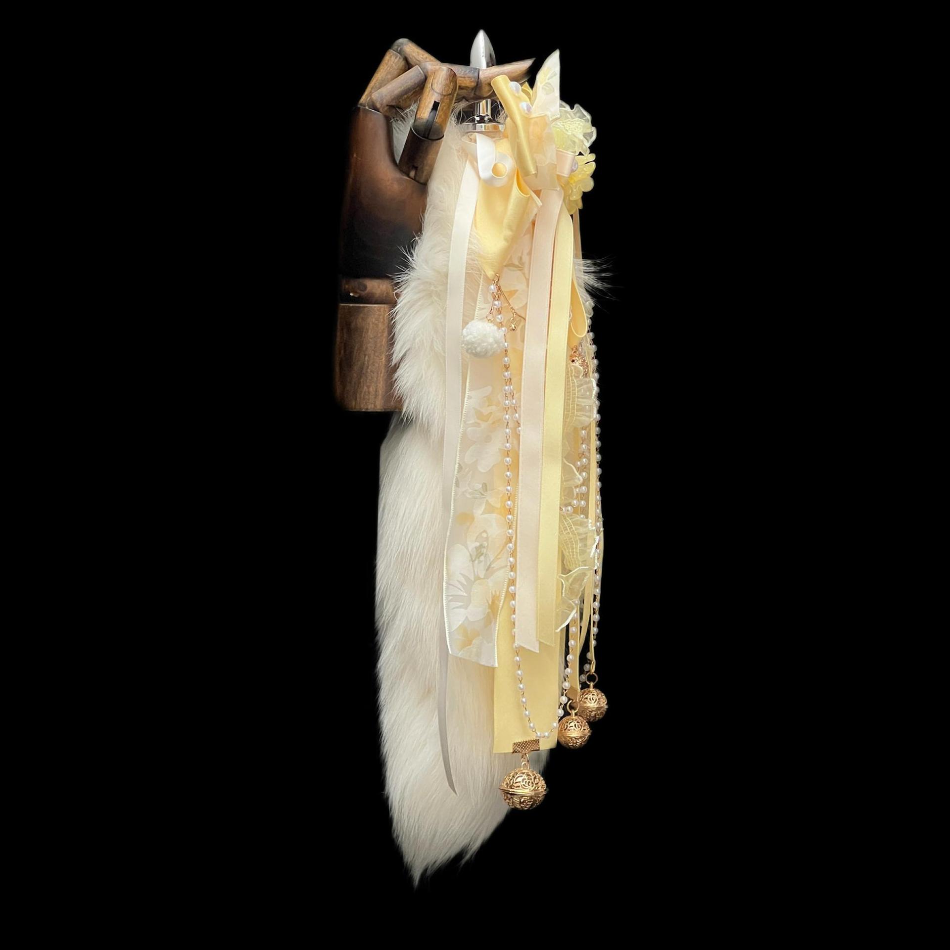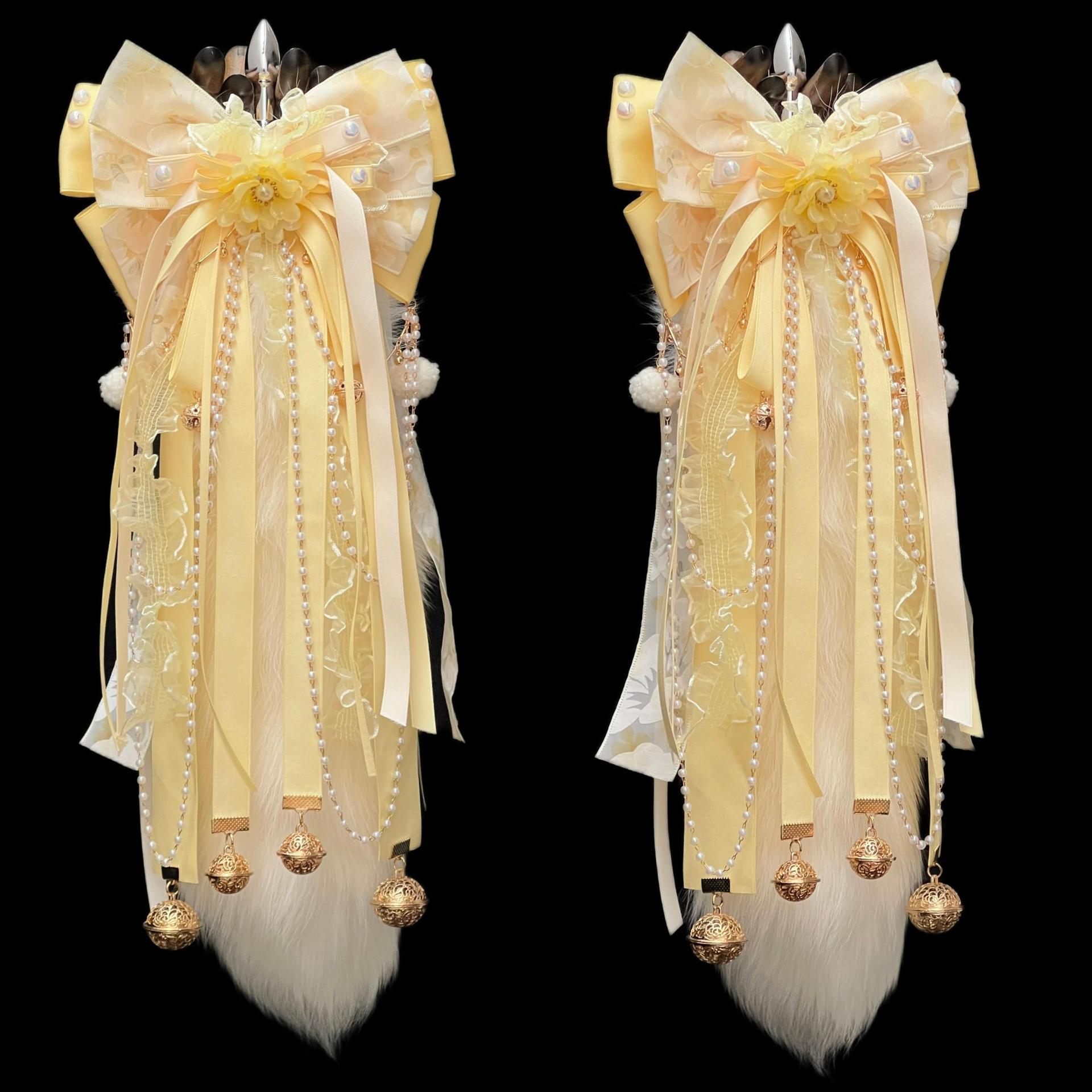 Golden Osmanthus Fox Tail Anal Plug – Handmade Light Yellow Fur with Bell Bow