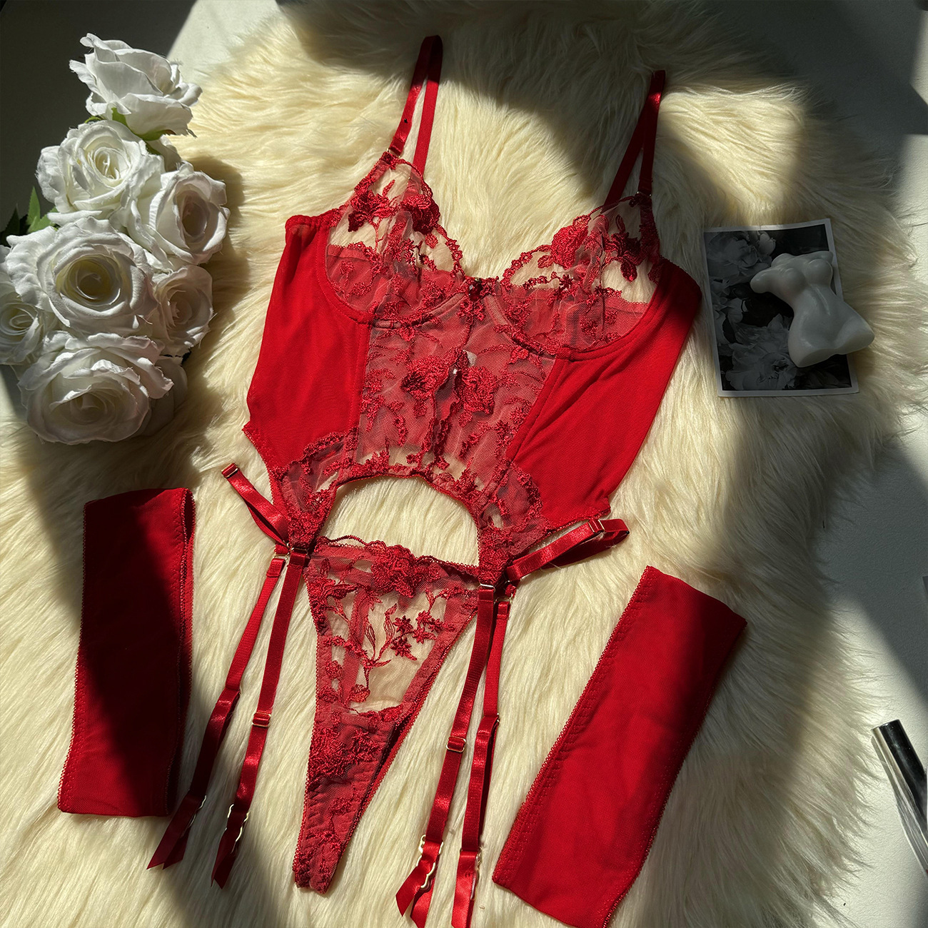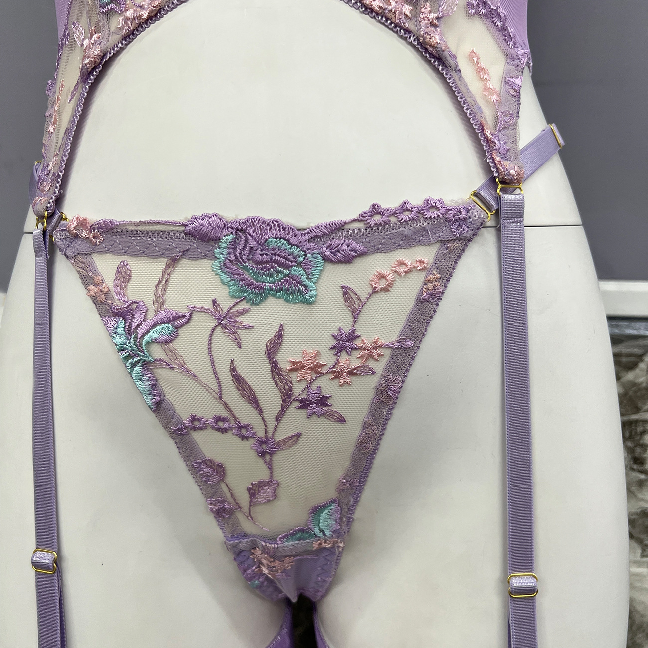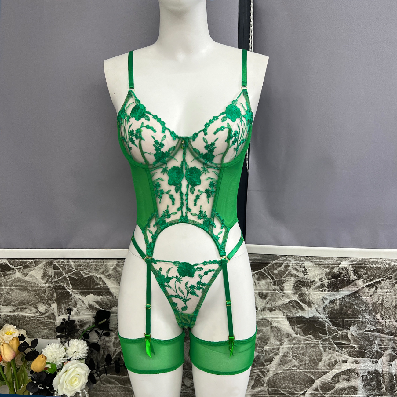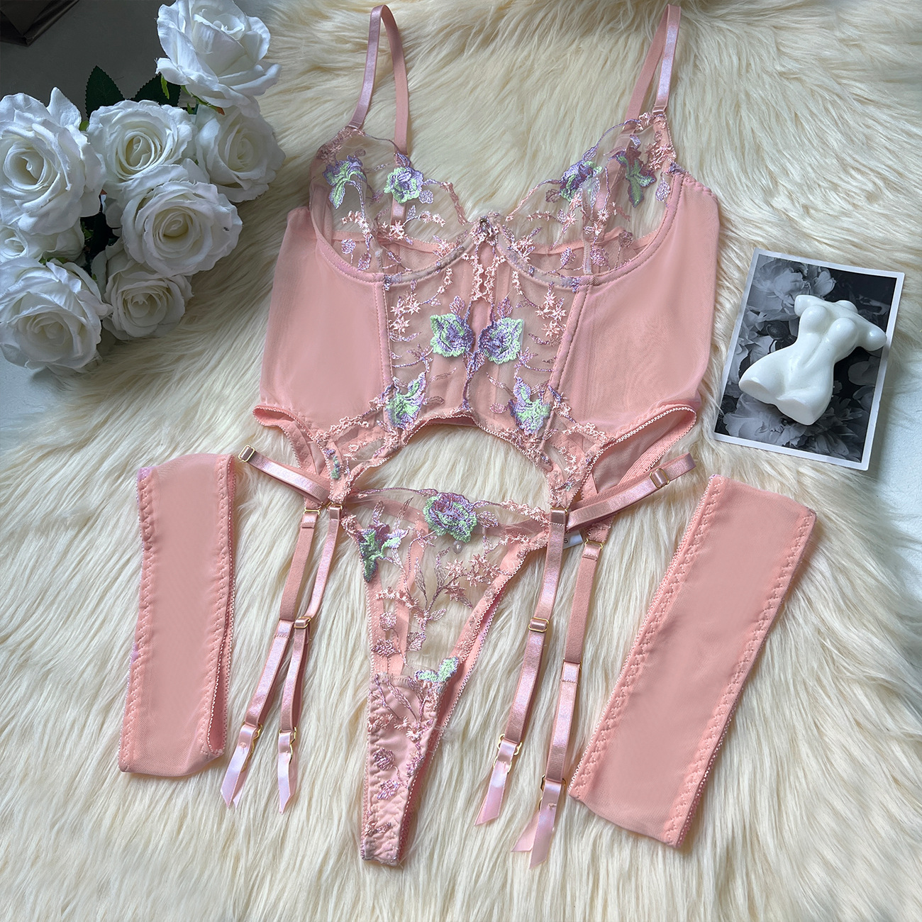 Sultry DIER lingerie: a three-piece set featuring delicate mesh and intricate embroidery for a captivating, see-through effect. Unleash your inner confidence with this alluring and uniquely designed perspective suit.