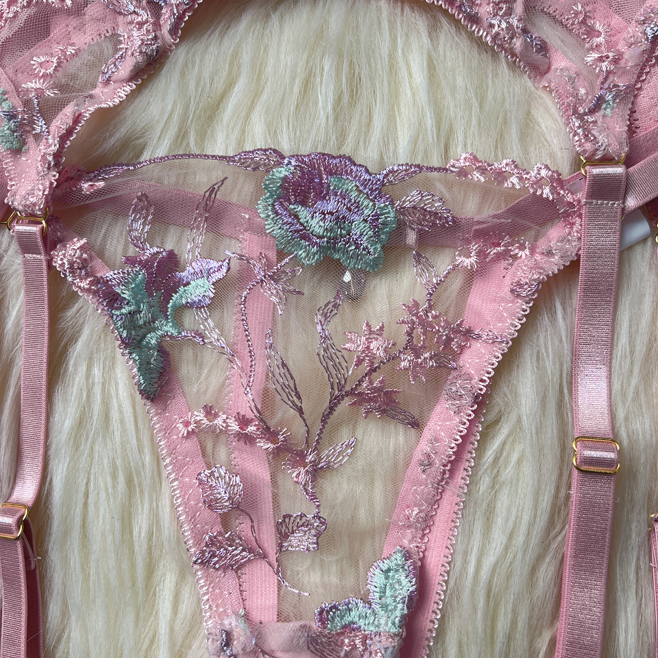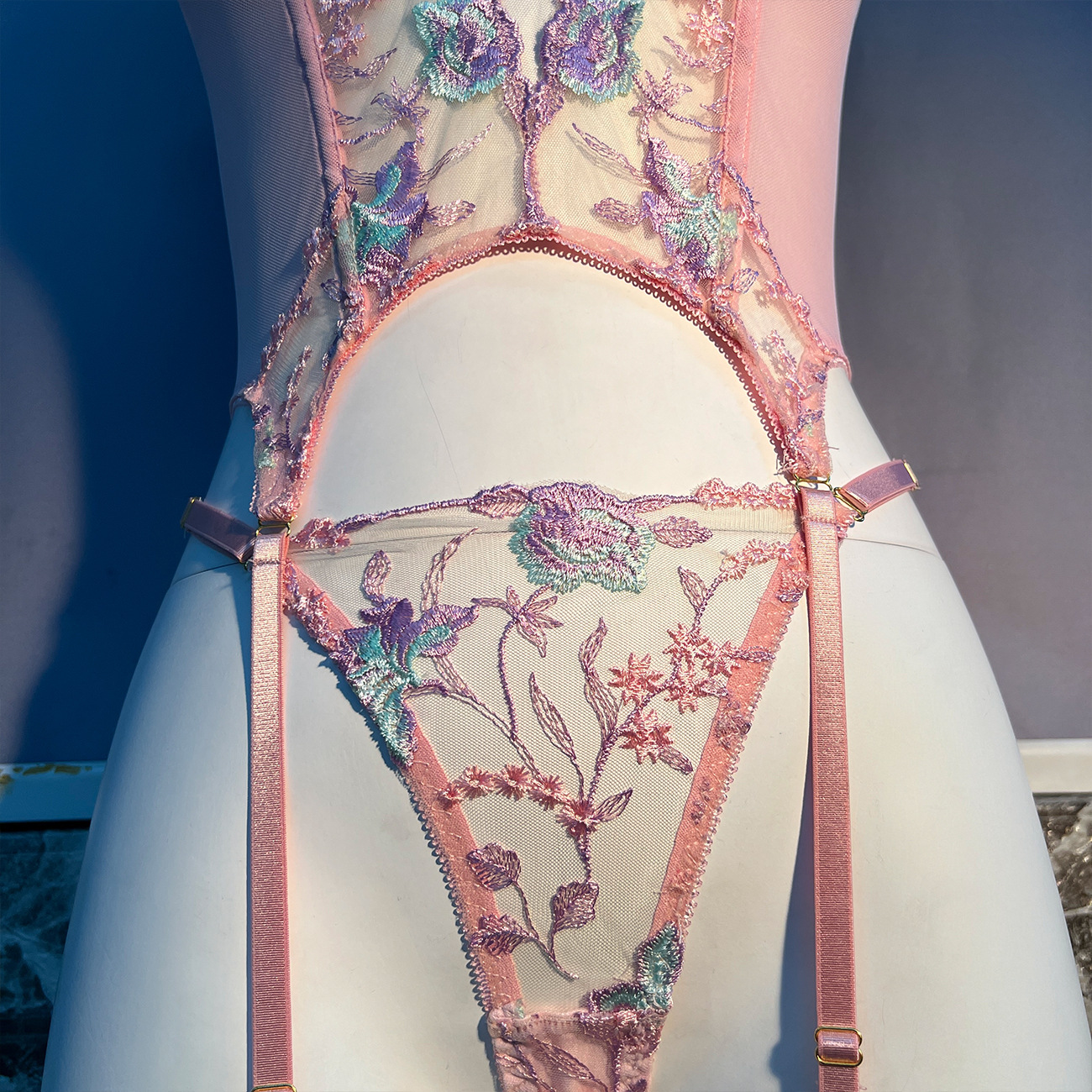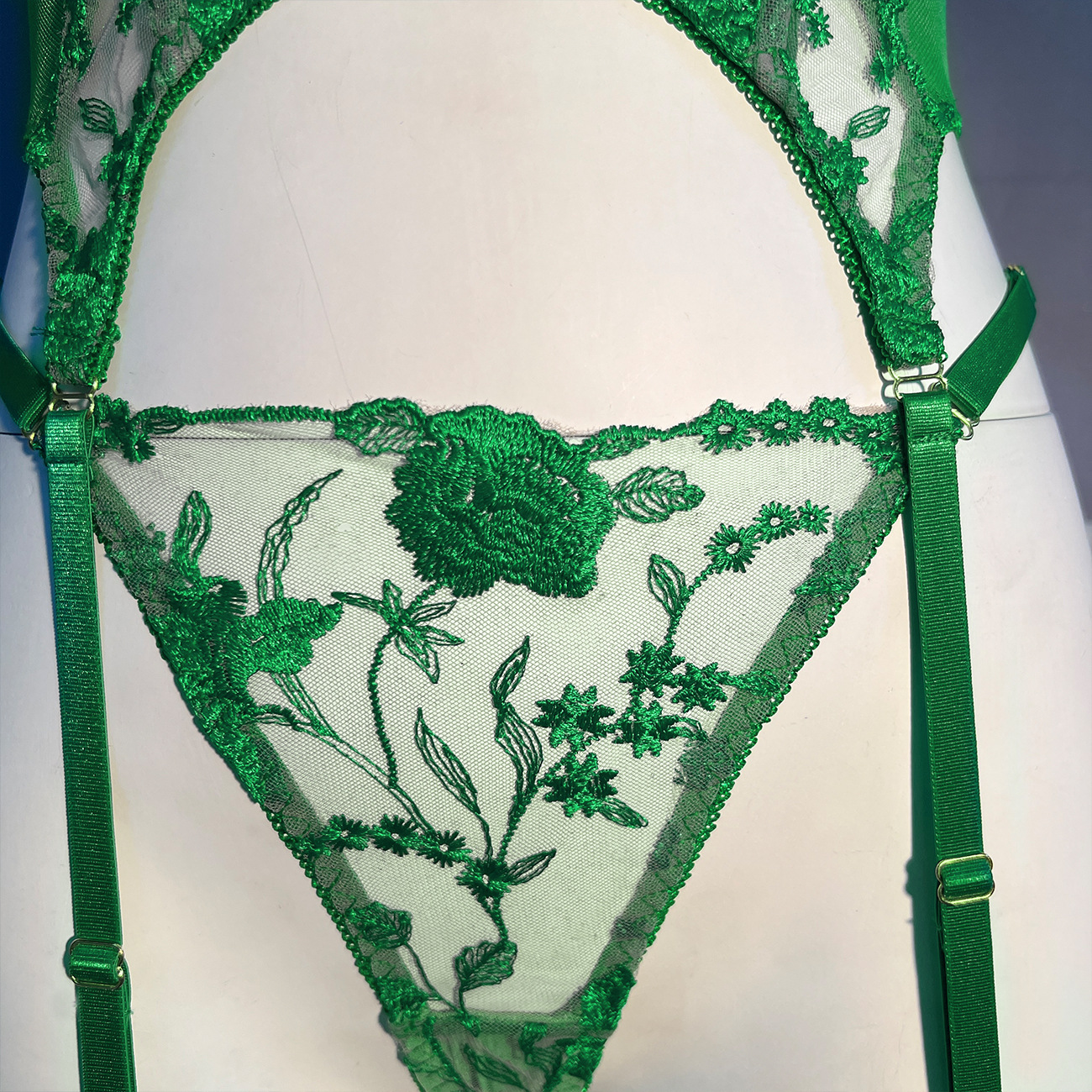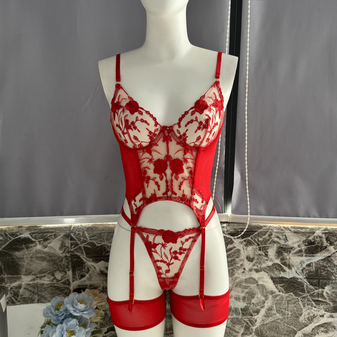 Sultry DIER lingerie: a three-piece set featuring delicate mesh and intricate embroidery for a captivating, see-through effect. Unleash your inner confidence with this alluring and uniquely designed perspective suit.