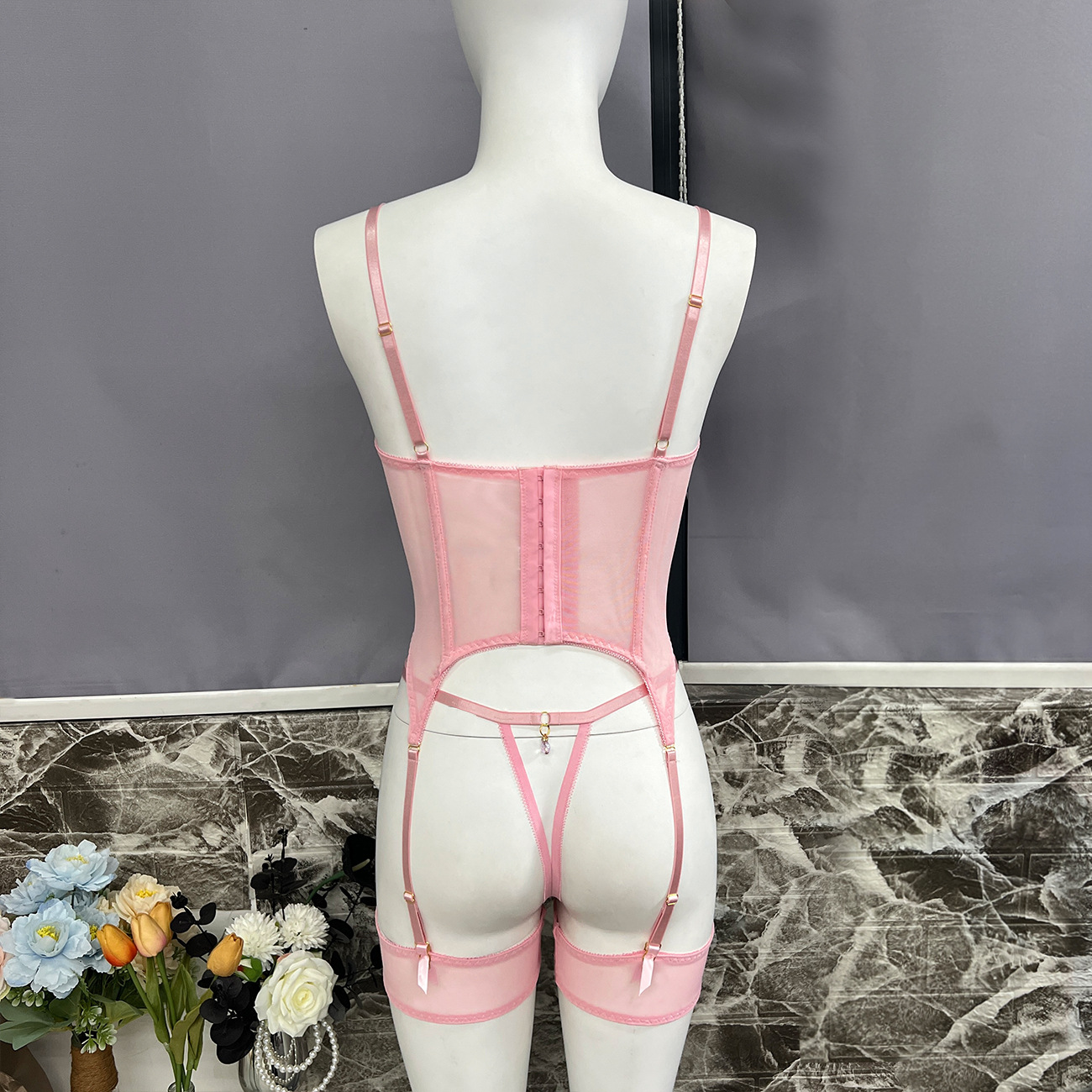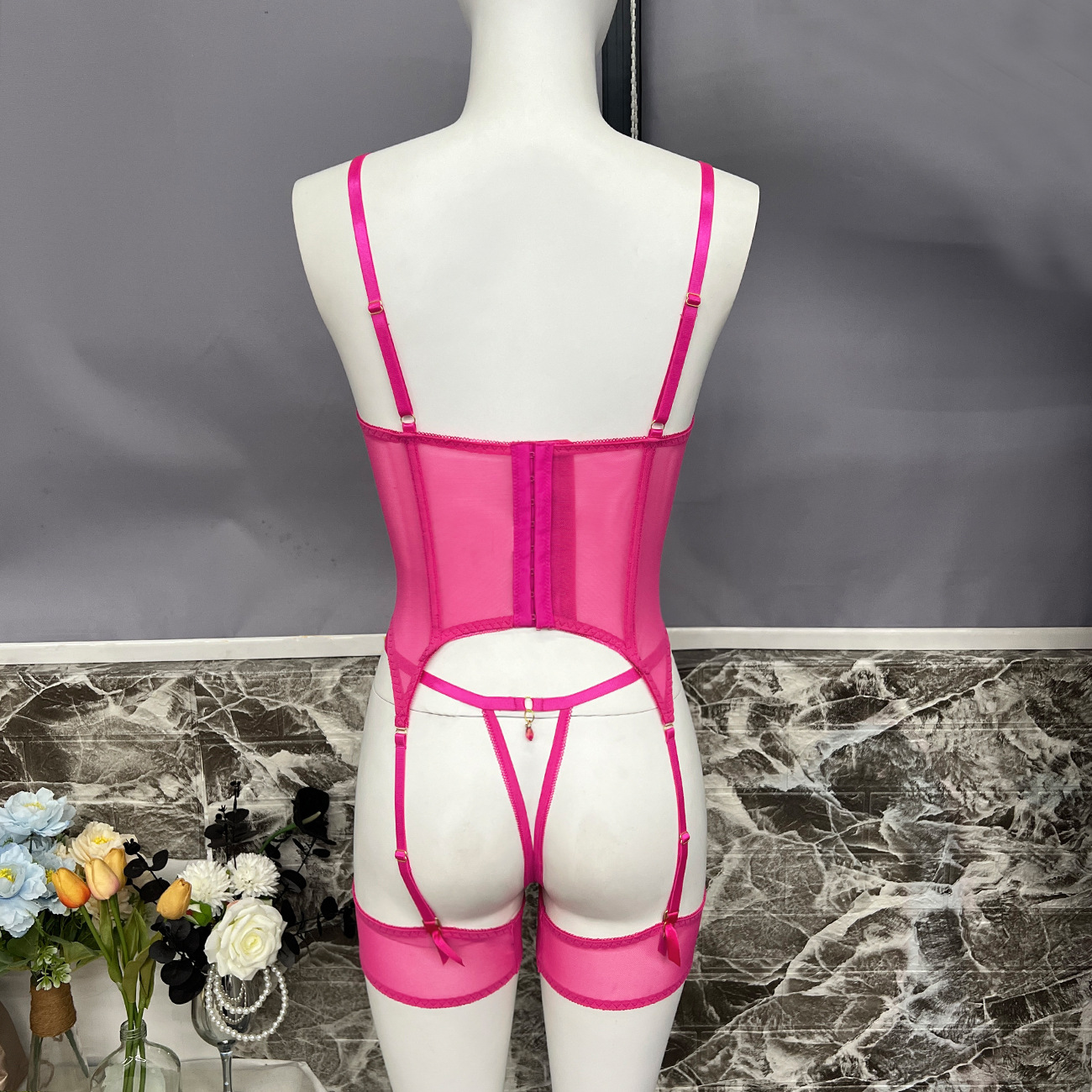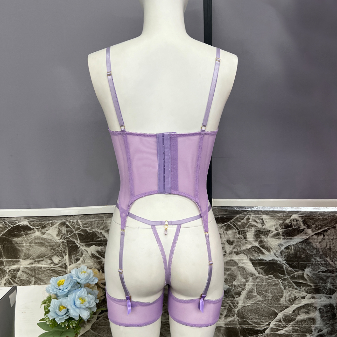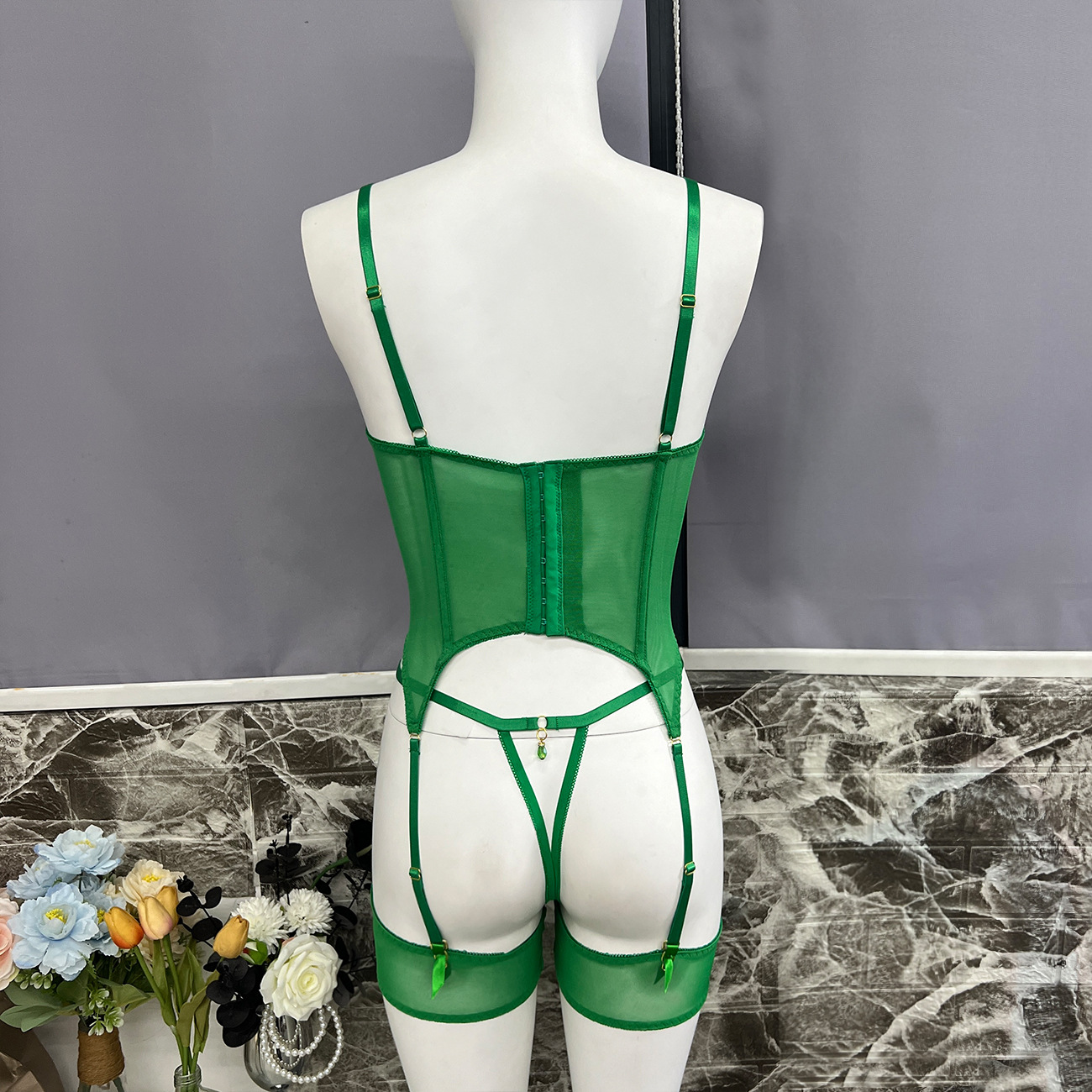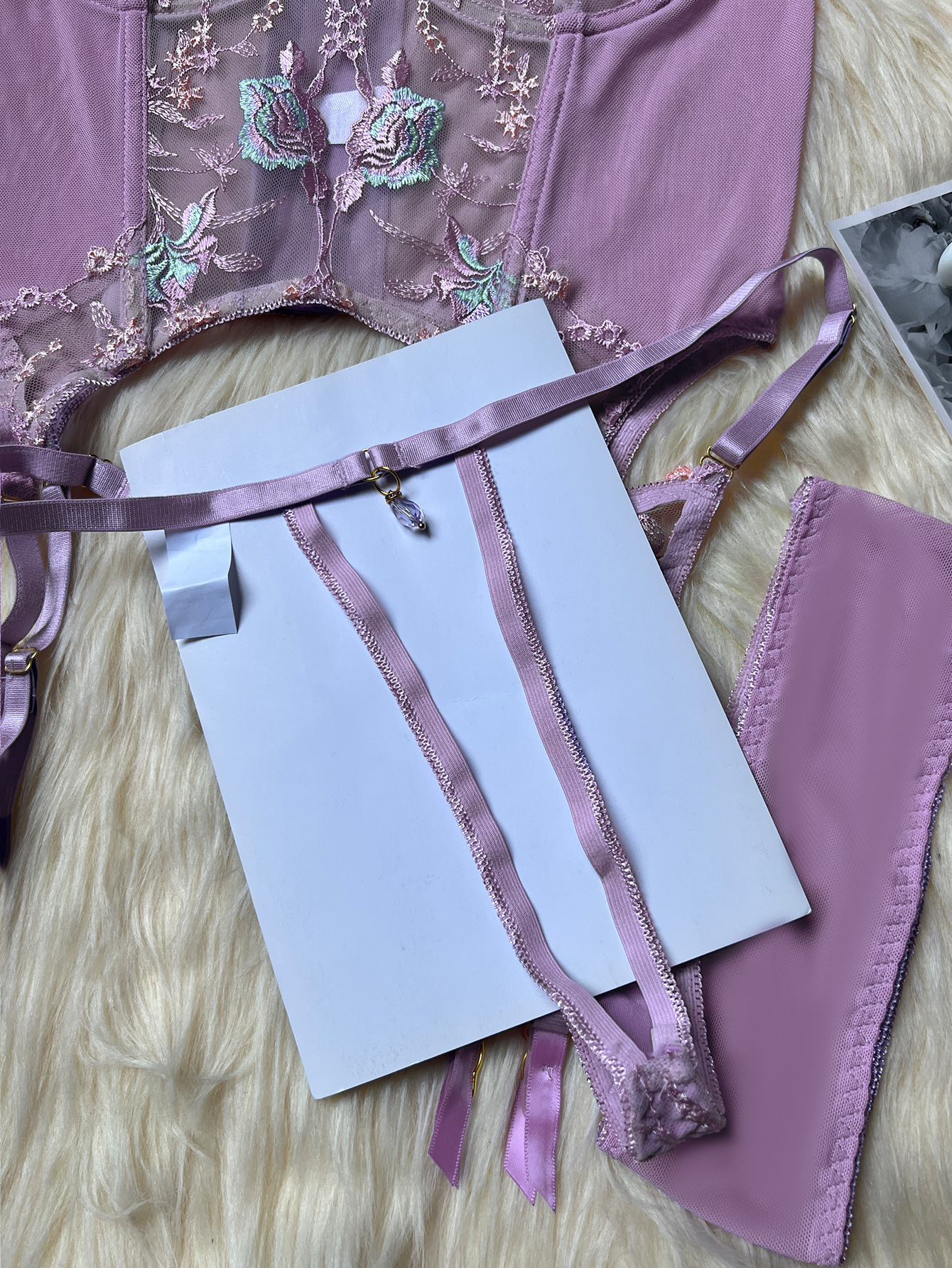 Sultry DIER lingerie: a three-piece set featuring delicate mesh and intricate embroidery for a captivating, see-through effect. Unleash your inner confidence with this alluring and uniquely designed perspective suit.