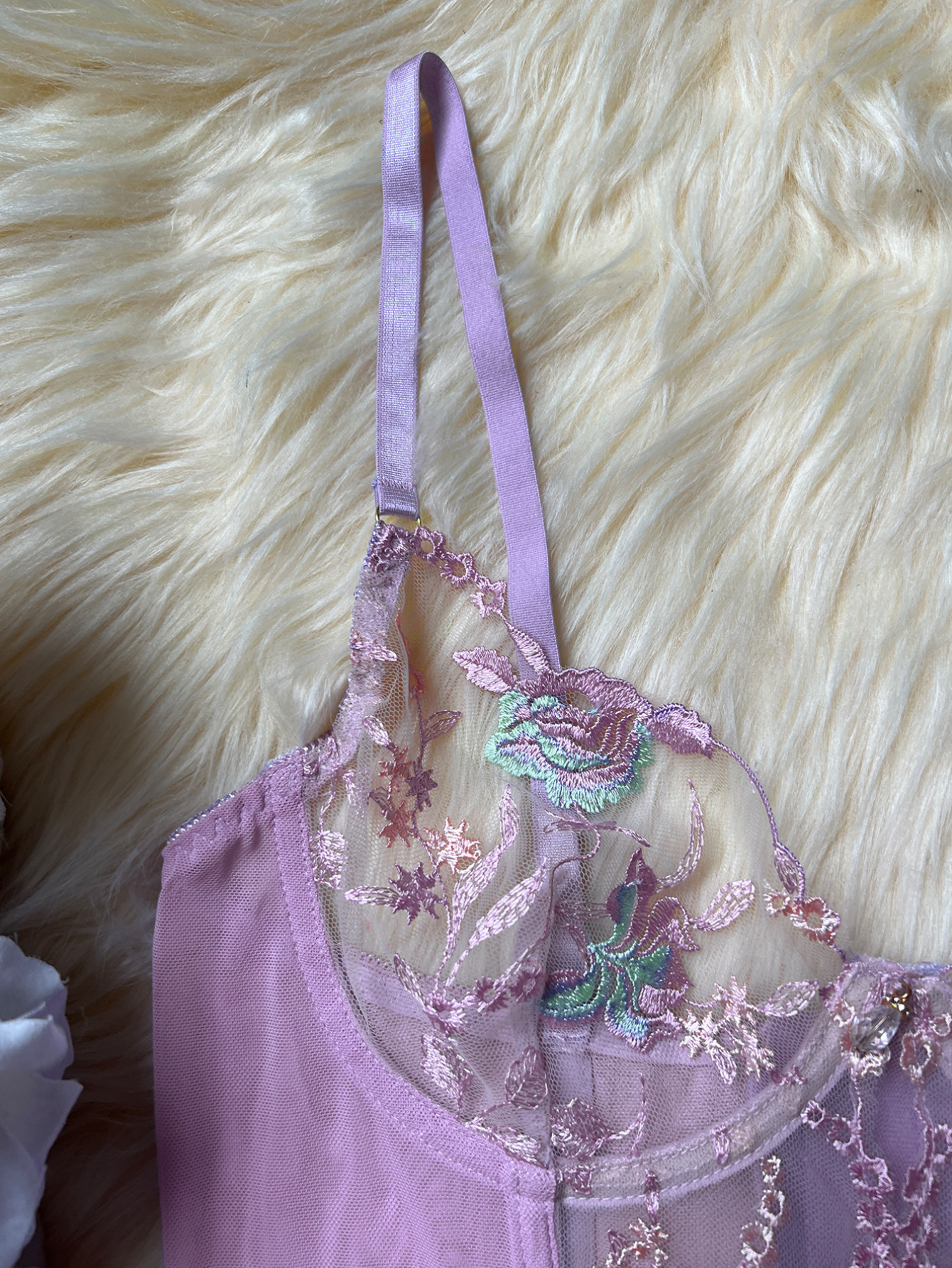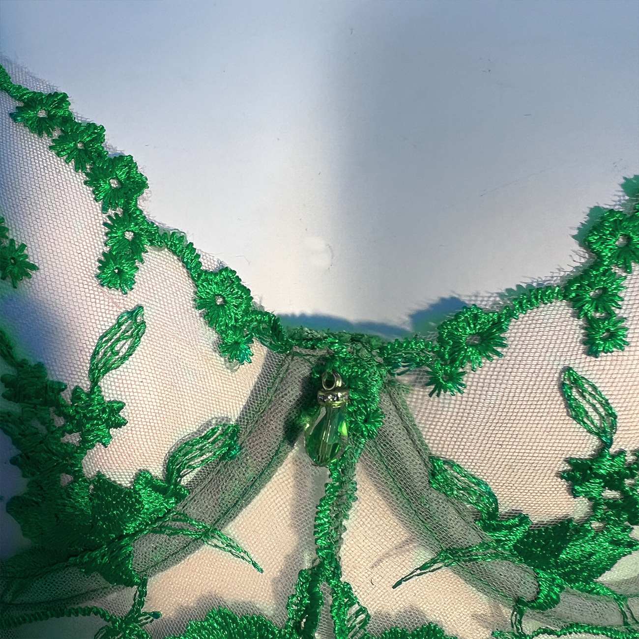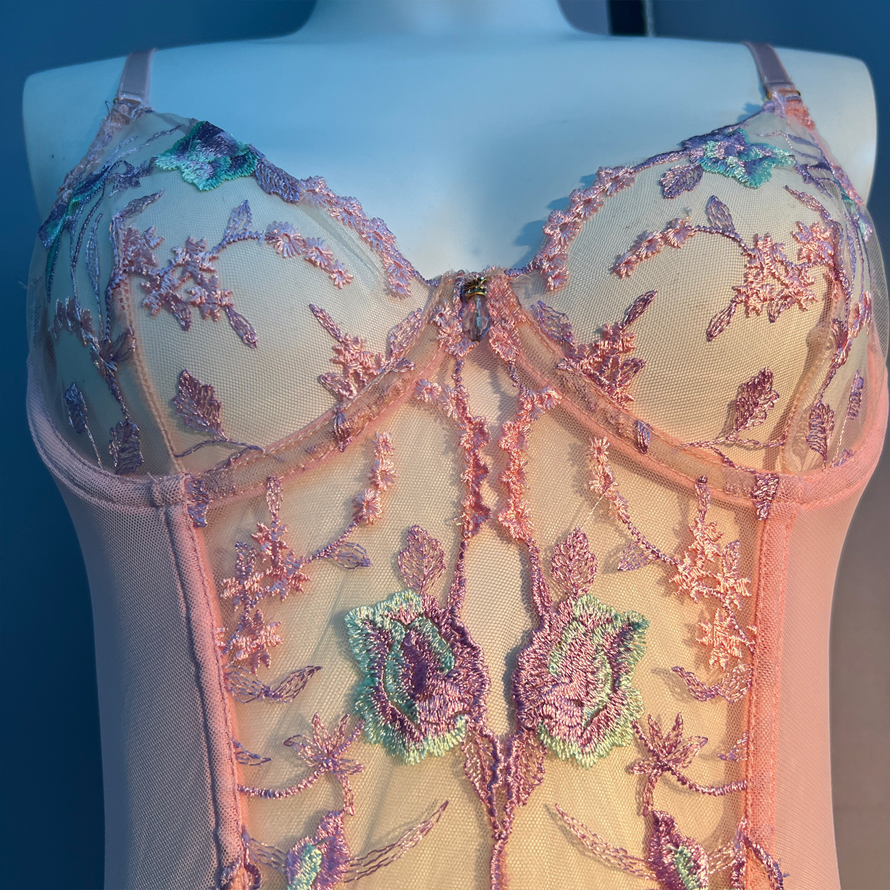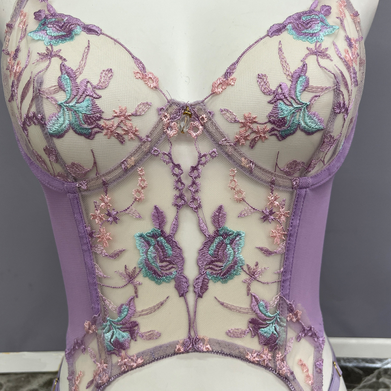 Sultry DIER lingerie: a three-piece set featuring delicate mesh and intricate embroidery for a captivating, see-through effect. Unleash your inner confidence with this alluring and uniquely designed perspective suit.