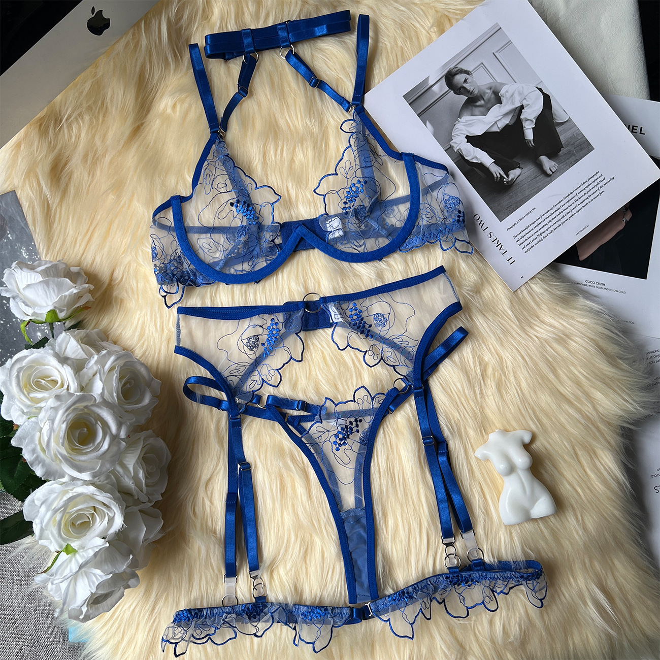 This DIER bra set offers a seductive and confident look with its mesh design and heavy embroidery. It provides alluring temptation while offering support and shaping. The unique combination of delicate mesh and bold embroidery creates a striking and unforgettable aesthetic.