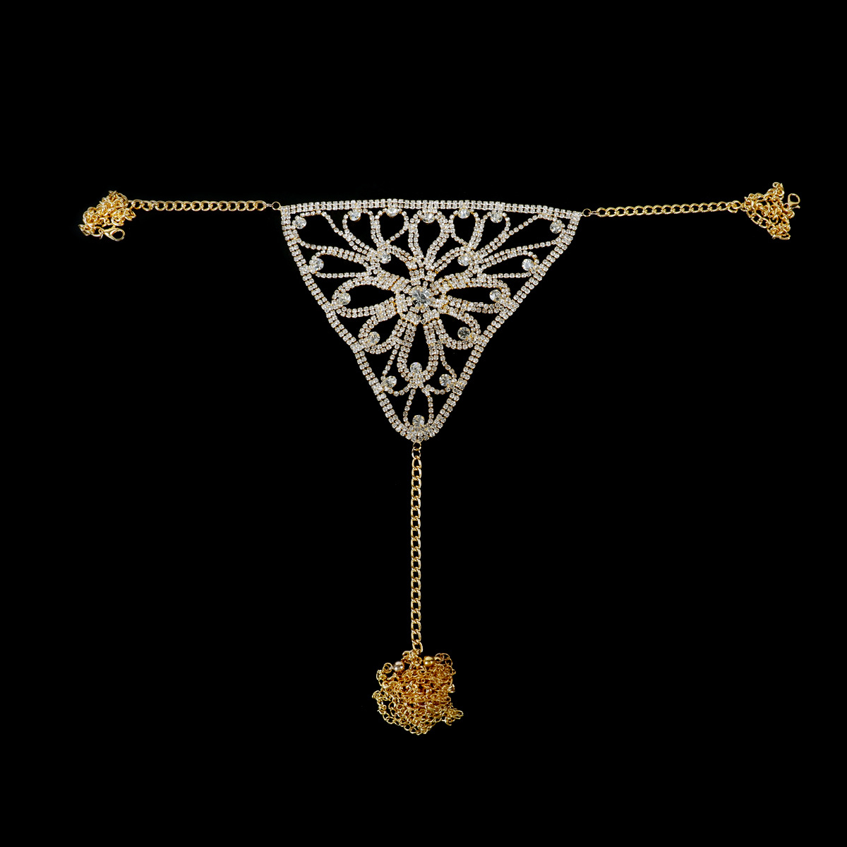 Crafted with meticulous attention to detail, this body chain features a dazzling array of high-quality rhinestones, strategically placed to catch and reflect light with every move. The intricate design drapes elegantly across your body, accentuating your curves and creating a mesmerizing silhouette. The delicate rhinestone thong adds a touch of provocative allure, making it the perfect accessory for those who dare to be bold.