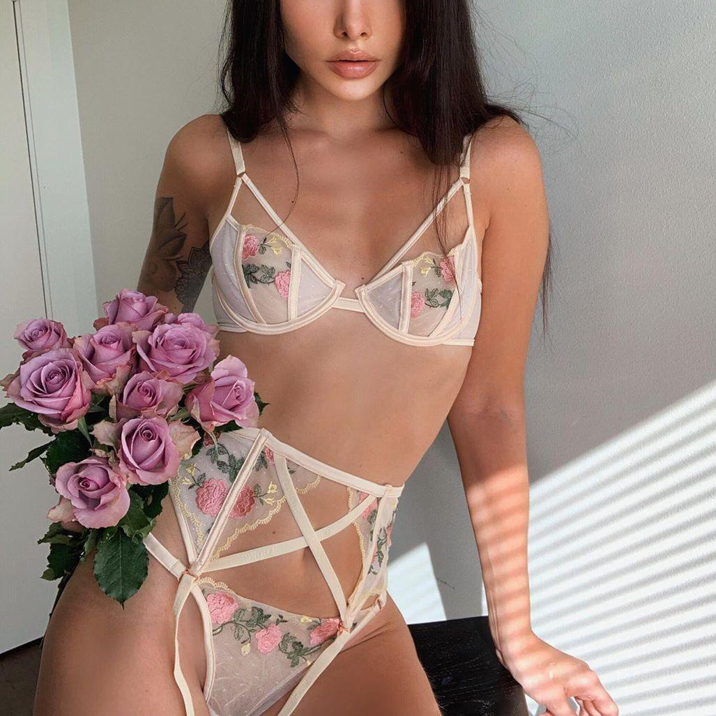 The “Ethereal Embrace” set features intricate, heavy-craft embroidery that dances across delicate lace mesh. Each stitch is meticulously placed, creating a breathtaking visual texture that is both captivating and sophisticated. The bra, panties, and garter belt are adorned with this exquisite embroidery, ensuring a cohesive and luxurious look.