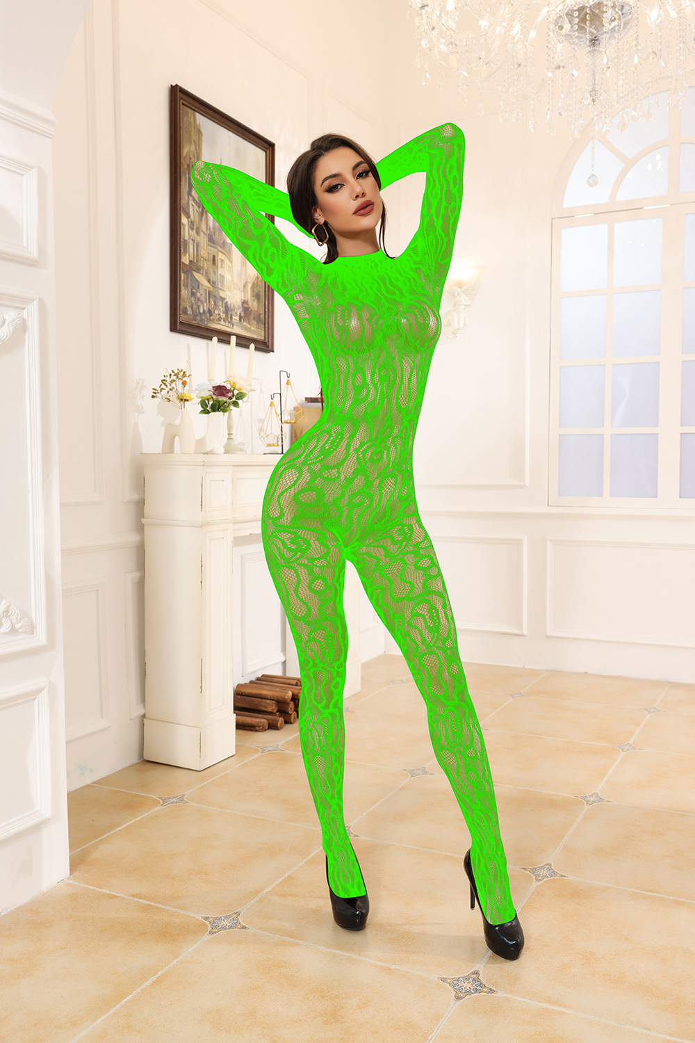 This sexy, one-piece mesh jumpsuit features a unique jacquard pattern, long sleeves, and a hollow design, offering a provocative and stylish look. Its European and US-inspired quality ensures a comfortable and durable fit, making it a standout piece for confident self-expression.