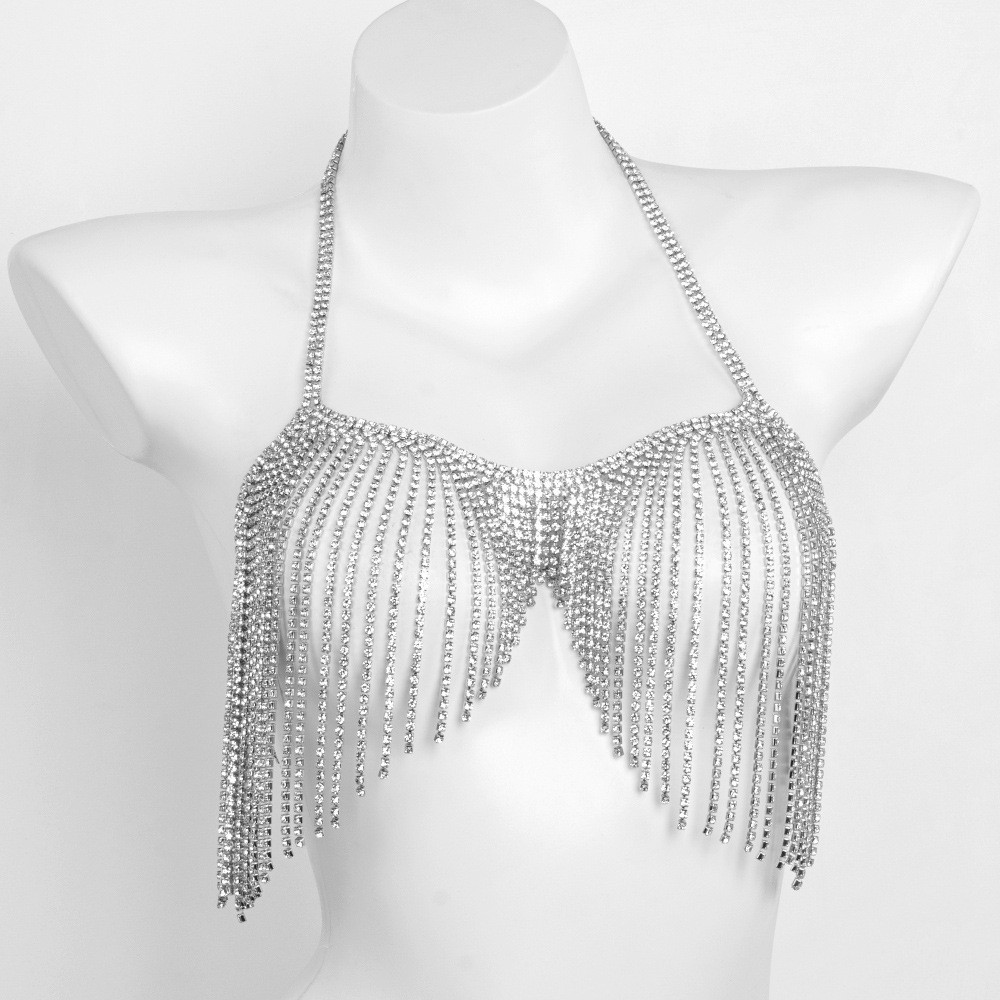 Dazzling rhinestone underwear chain bikini set perfect for nightclubs, beaches, or adding a touch of sexy glamour. This two-piece body chain accessory elevates any look with its shimmering crystals, offering a unique and eye-catching statement piece.