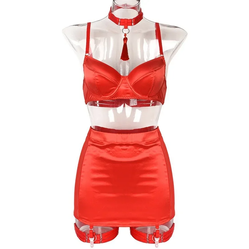 This lingerie set combines European and American styles for a seductive look. Features include supportive steel rings, a flattering design for the bust and rear, a tempting small coverage cut, a unique hanging neck and tassel detail, and a daring split design, offering a confident and alluring silhouette.