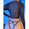 This provocative three-piece lingerie set features a daring combination of a halter neck, bondage-inspired accents, and a revealing fishnet design. It offers a seductive and alluring look, emphasizing a bold and confident style for intimate moments.