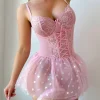 Sultry European/American lingerie featuring a steel-ring bra for enhanced lift and support, seductive sheer pink mesh, dazzling sequins, and a playful bow accent. This piece combines alluring transparency with glamorous details for a confident and captivating look.