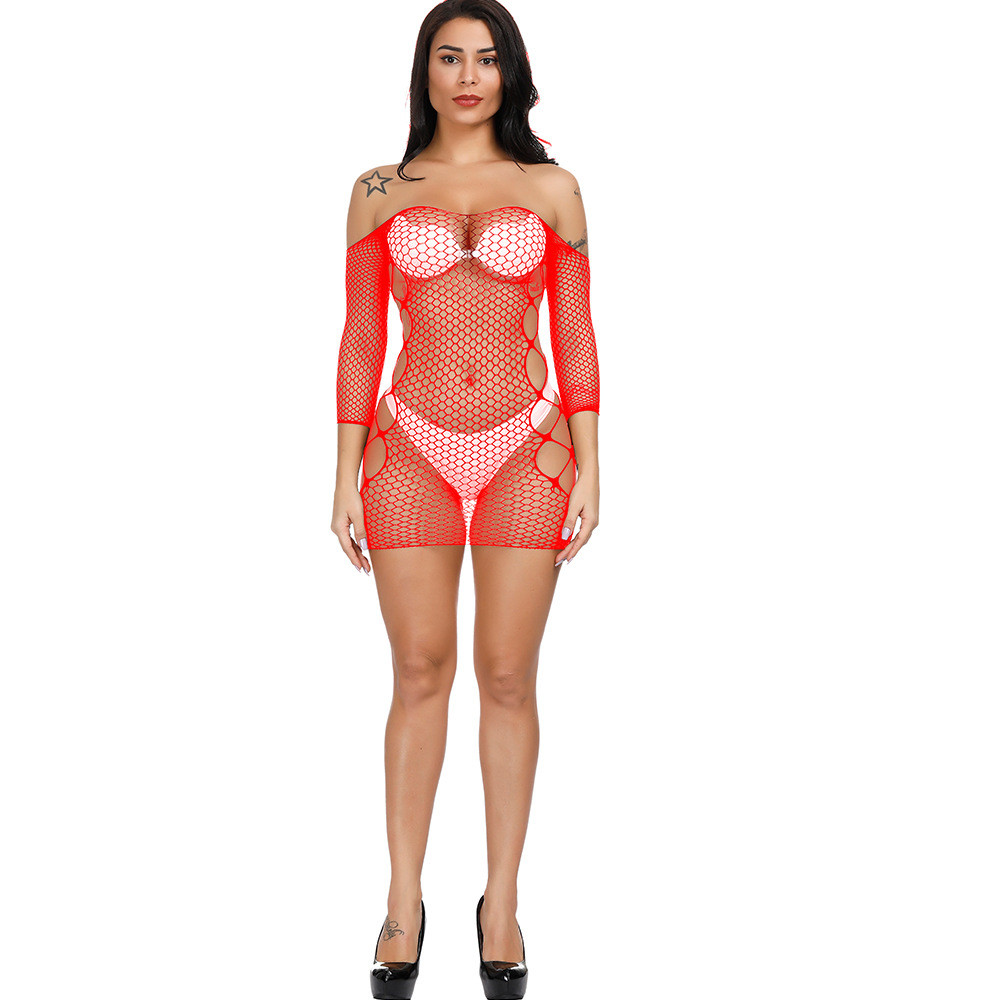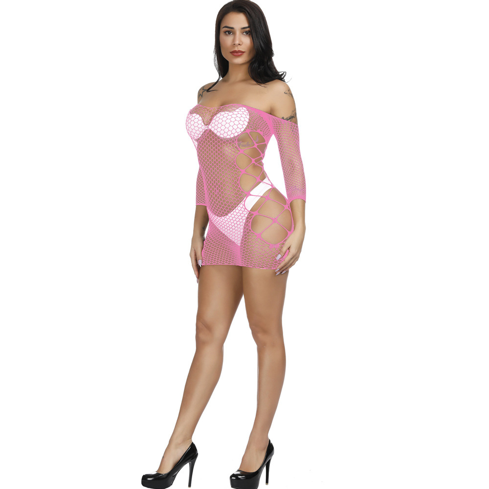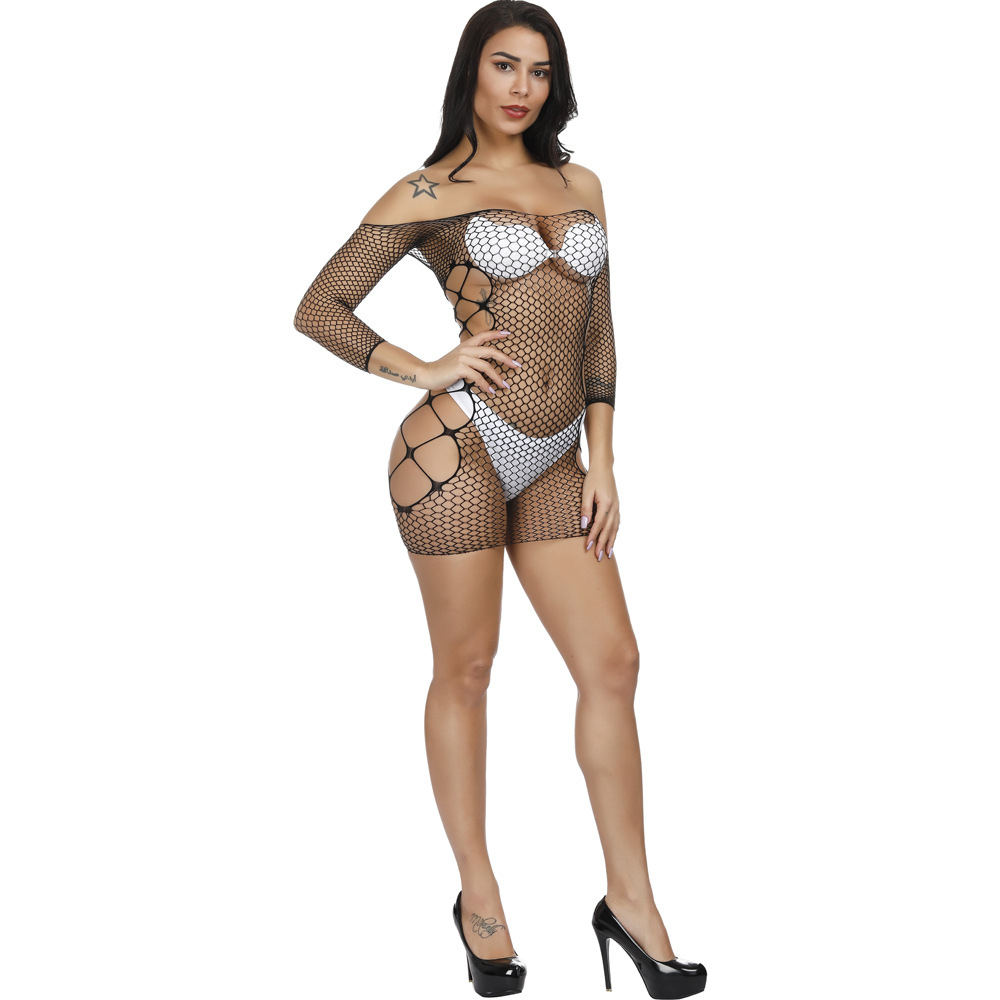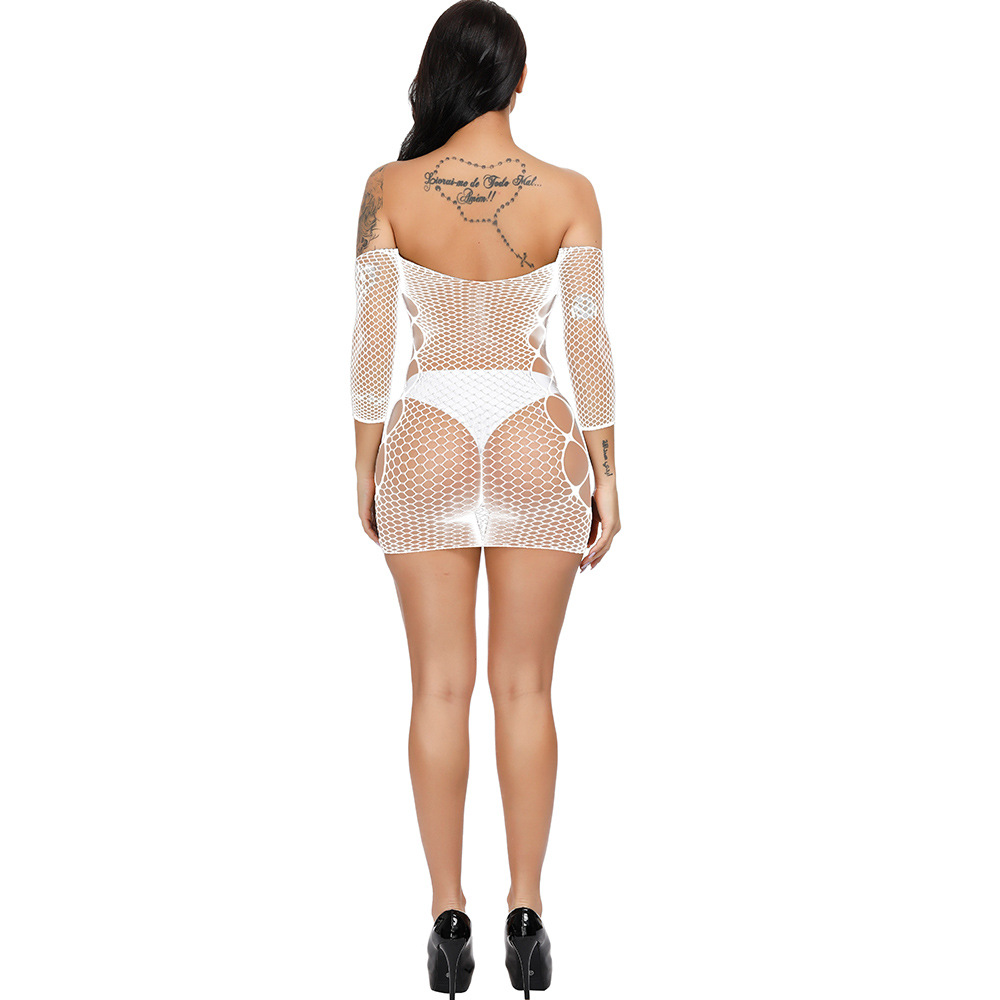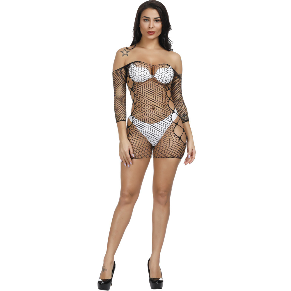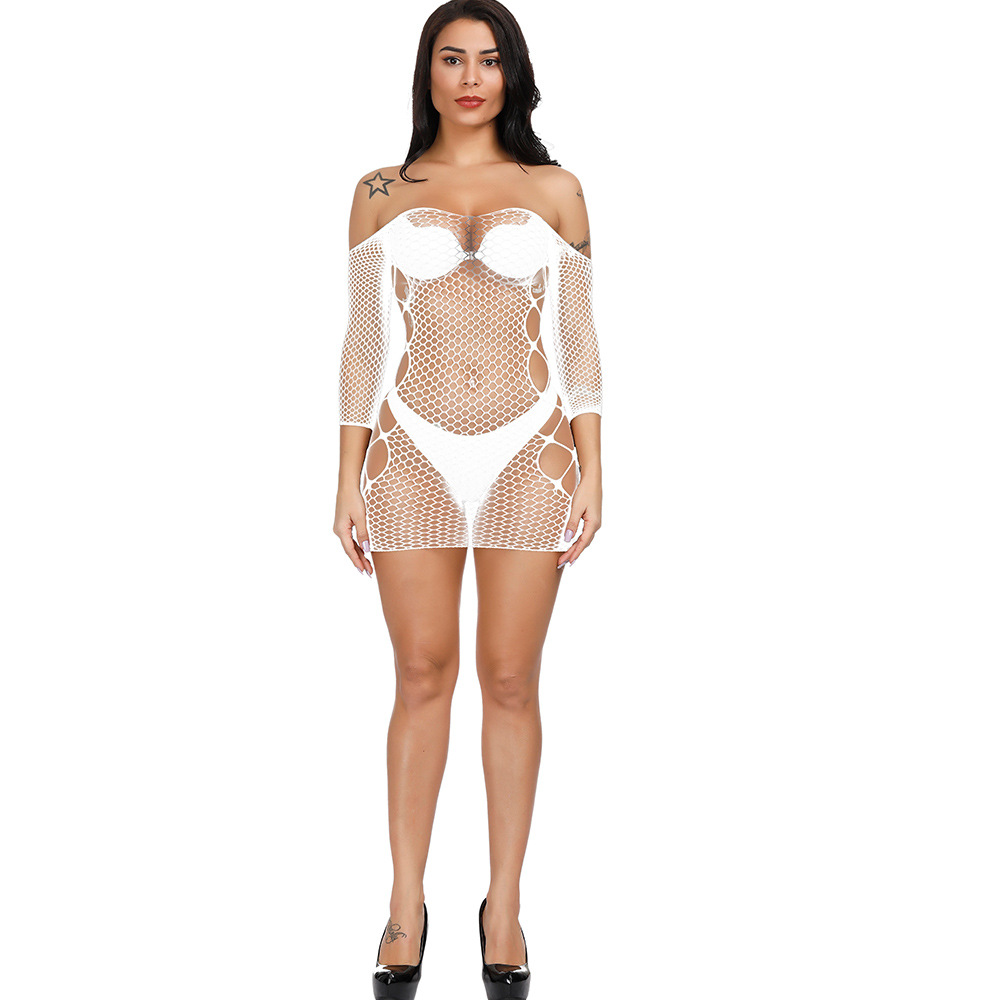 This sexy lingerie set features a European and American-inspired jacquard sling, a provocative mesh skirt, net stockings, and hollow transparent tights. It offers a daring and alluring look, emphasizing sensuality and confidence through its intricate design and revealing silhouette. The unique combination of textures and patterns creates a visually captivating and unforgettable experience.