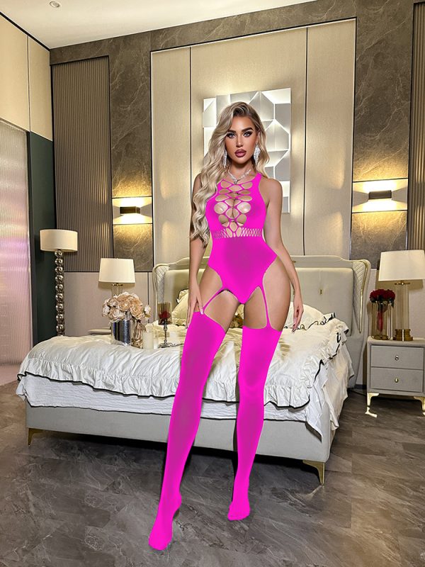 A seductive European/American-style bodysuit featuring a daring hollow-out design, see-through mesh, and strategic cutouts to ignite passion. This foreign trade piece offers a provocative and alluring silhouette, emphasizing sensuality and confidence. Its unique design guarantees a captivating and unforgettable experience.