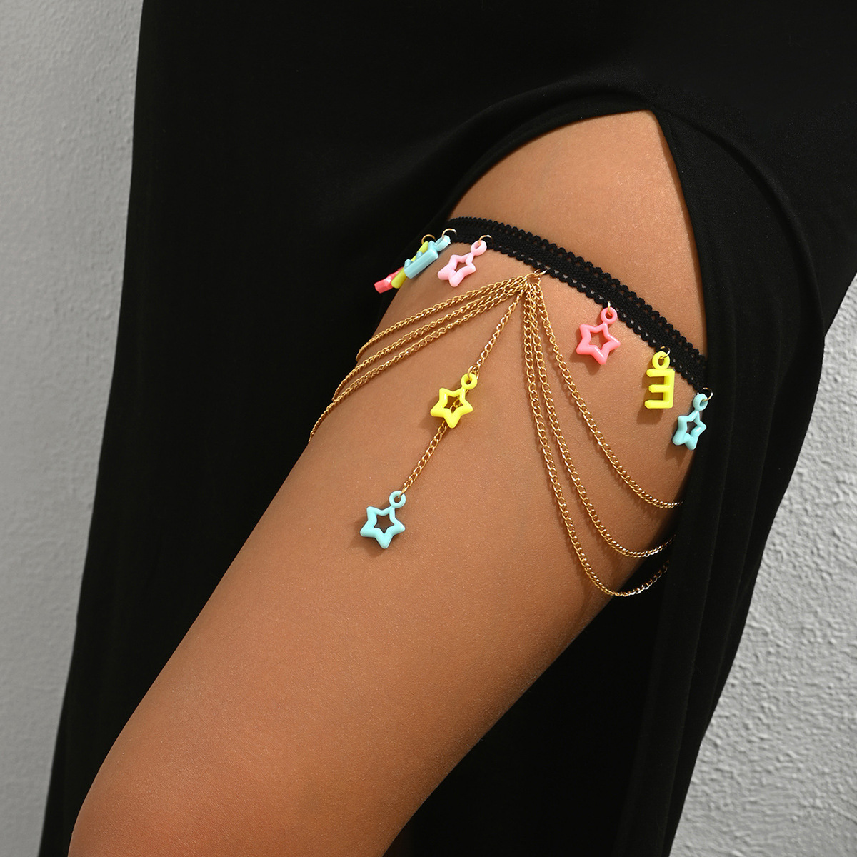 Trendy dopamine-inspired thigh ring featuring a star and hollow chain design. Adds a pop of color and playful edge to summer outfits. Unique and eye-catching accessory for a confident, stylish look.