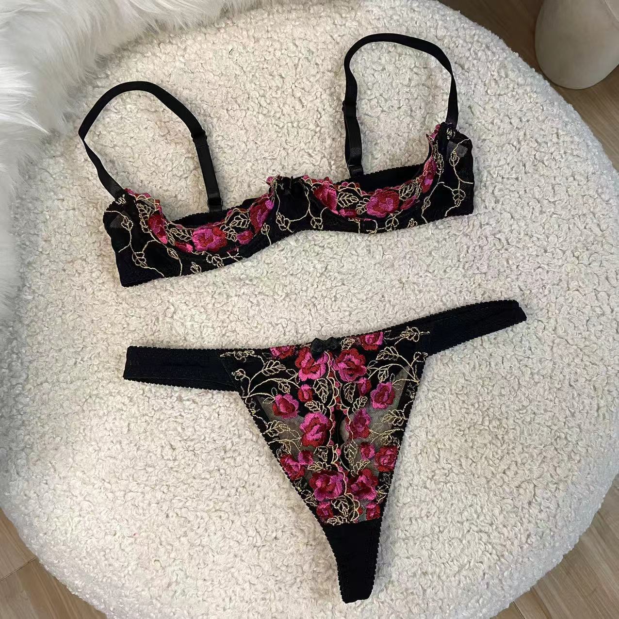 Exquisite Embroidery Plus Cotton Bra Set with Open Panties – Breast Support