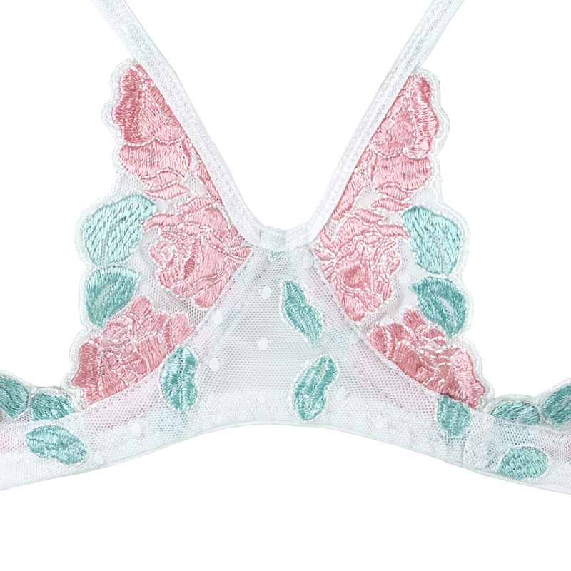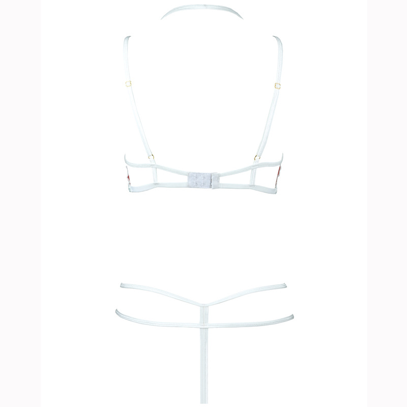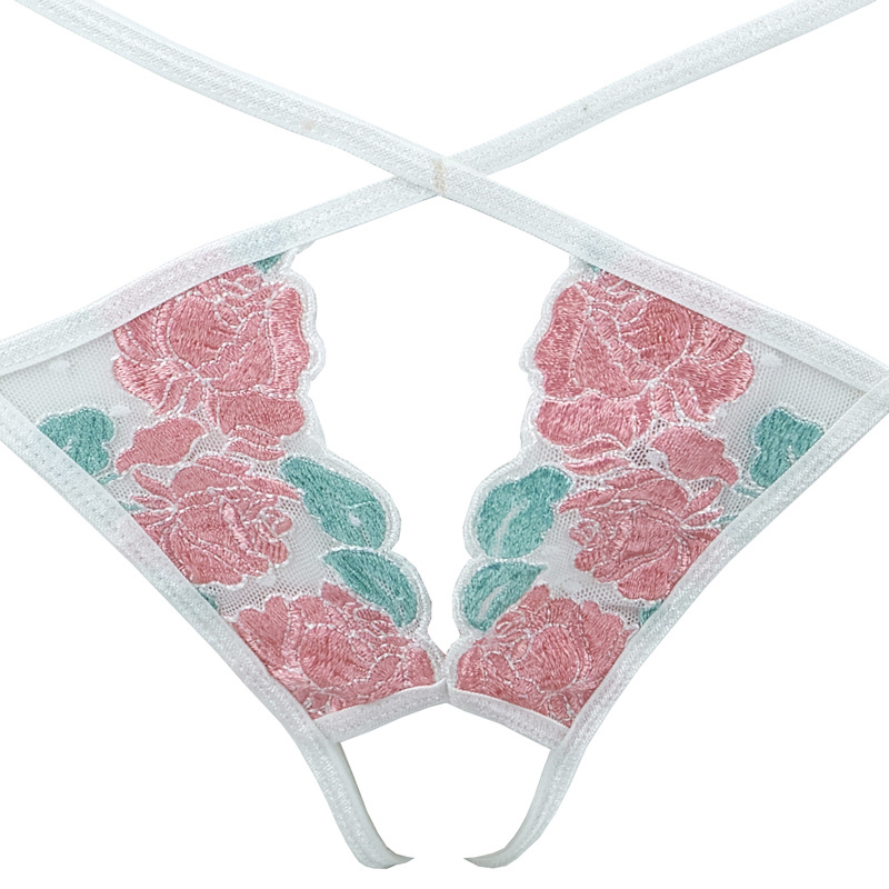 White Rose Embroidered Mesh Steel Bracket Open Crotch Bra Set for Women