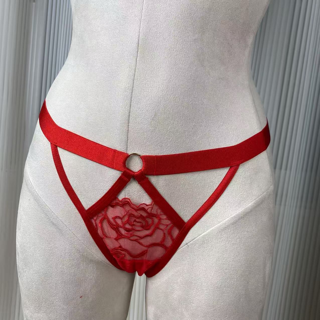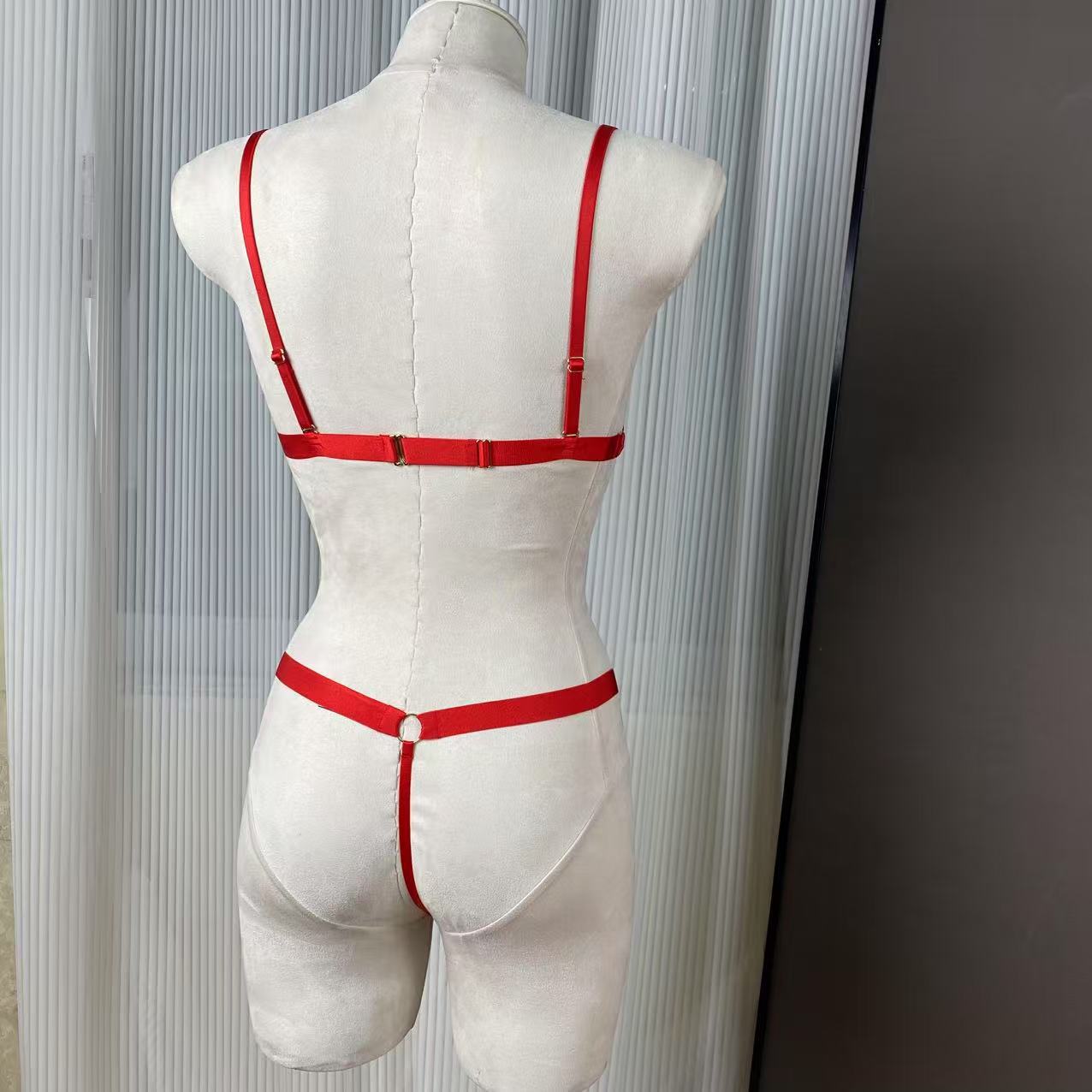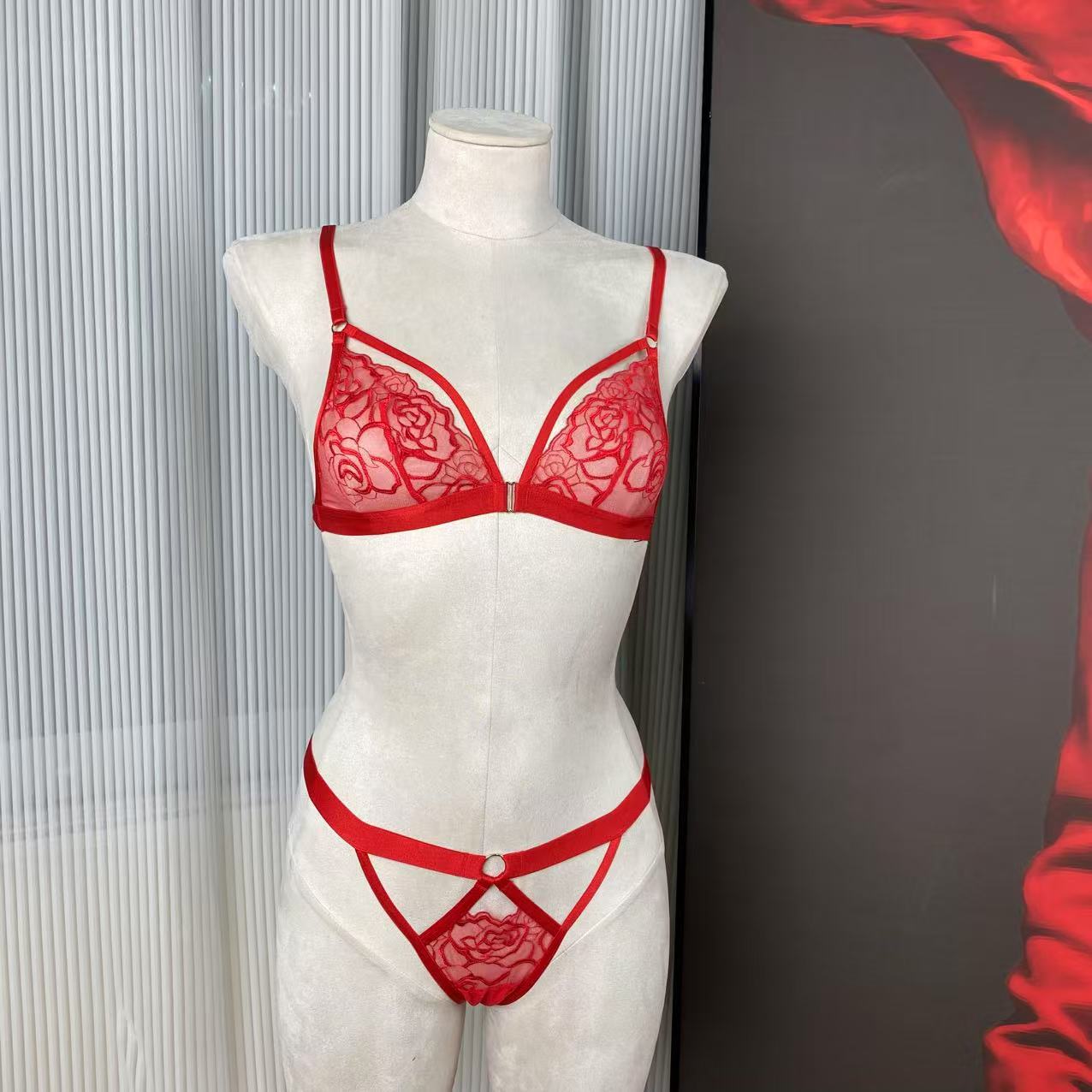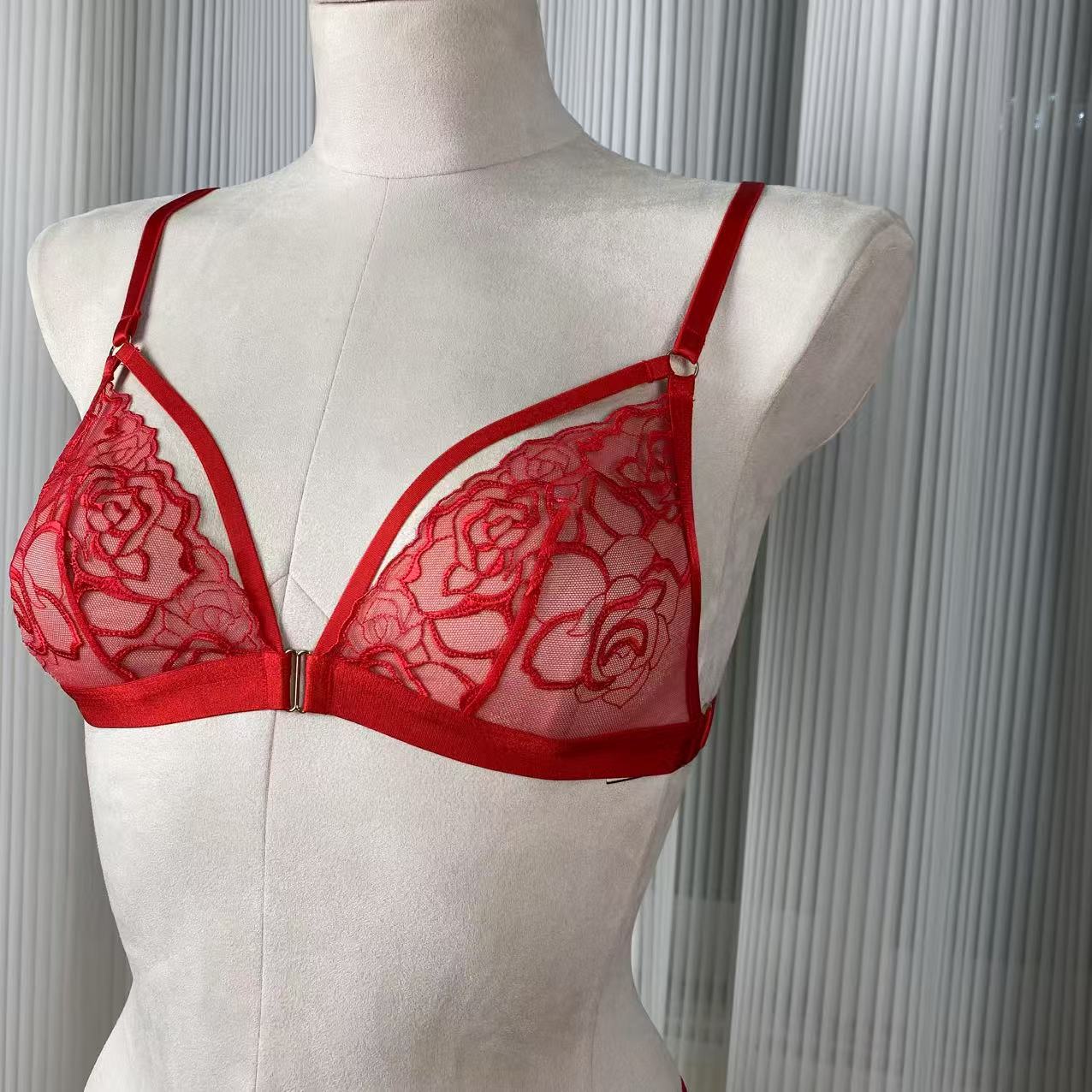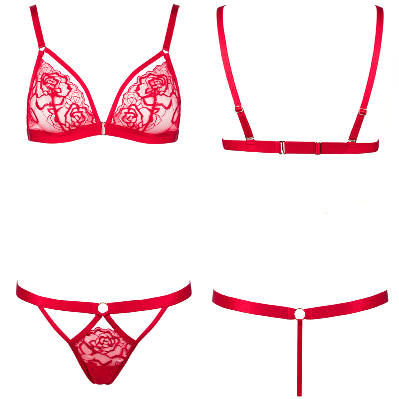 Red Rose Embroidered Halter Neck Diamond Chain French Triangle Cup Cut Out Low Waist Panty Set for Women