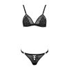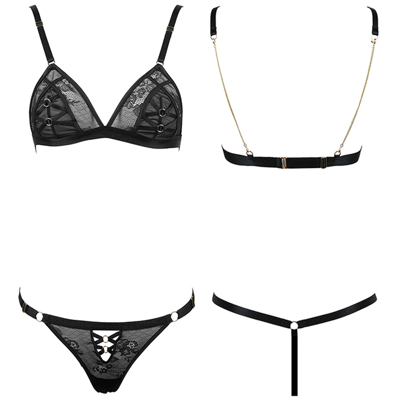 Black Lace Triangle Cup Wireless Bra & Low Waist Thong Set with Gold Chain Strap