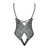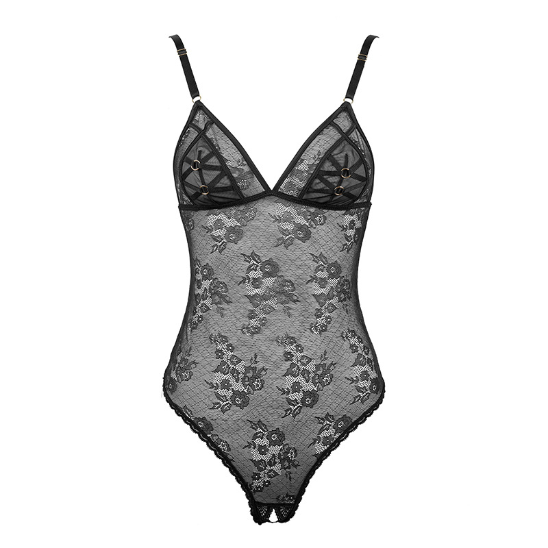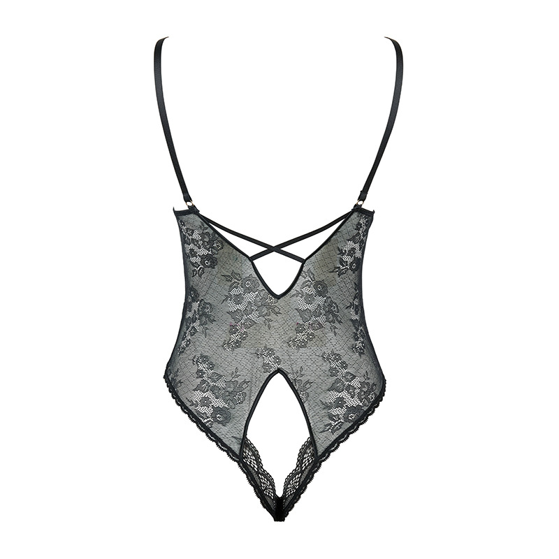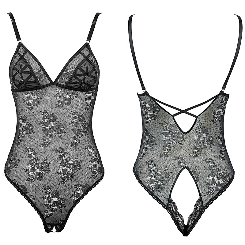 Black Lace See-Through Jumpsuit Pajamas with Open Crotch and Temptation Straps for Women