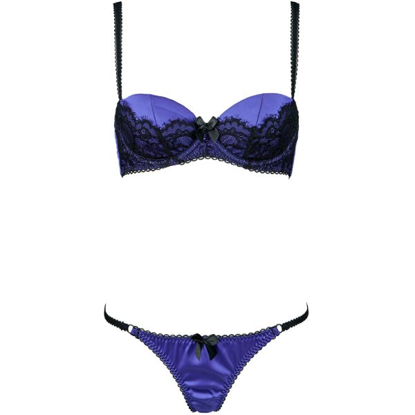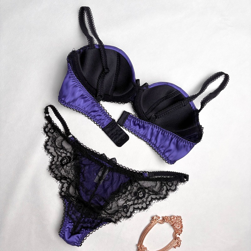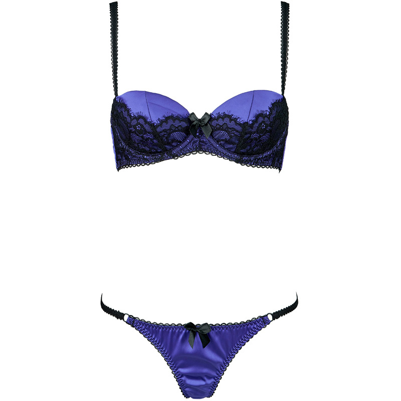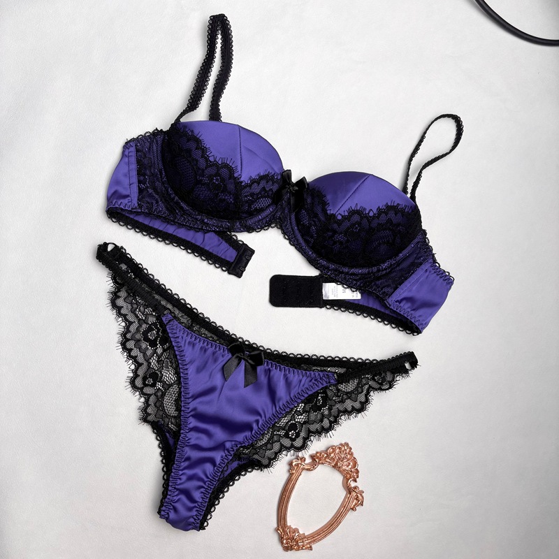 Sexy Satin Lace Patchwork Cotton Cup Low Waist Bra & Briefs Set