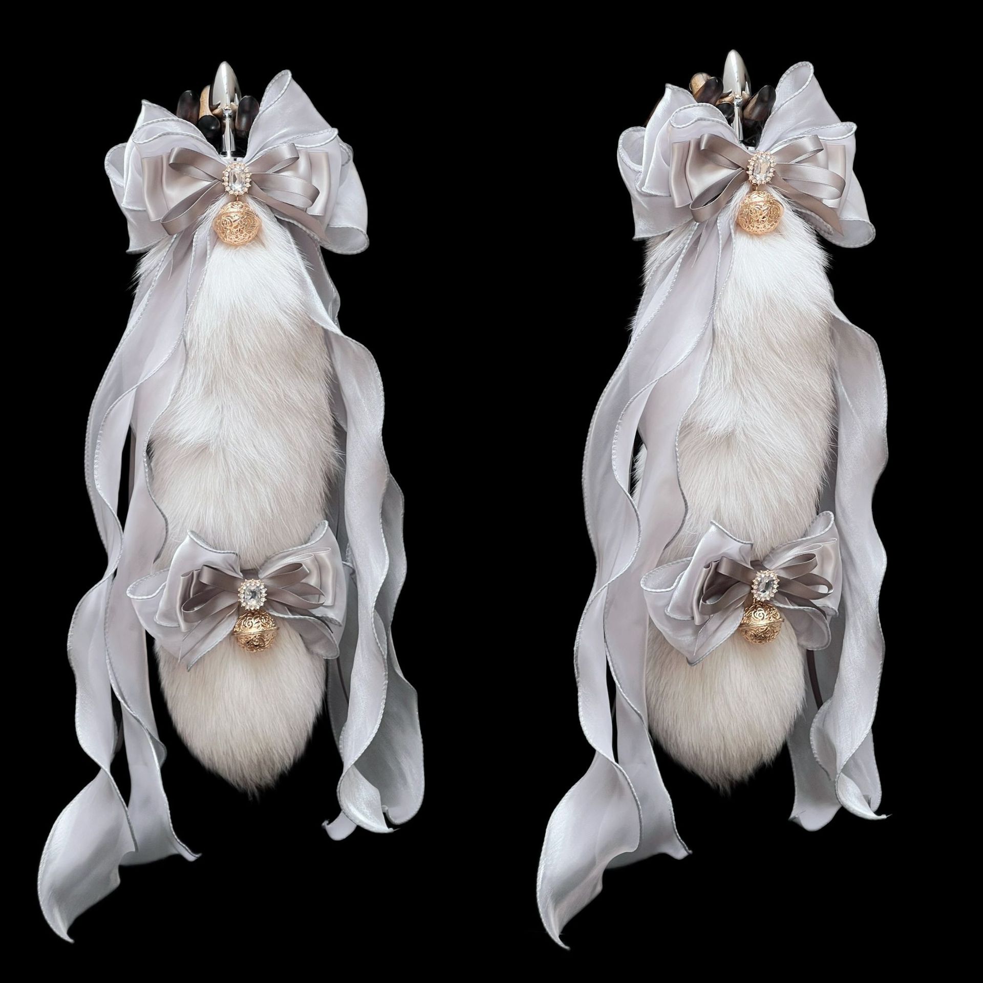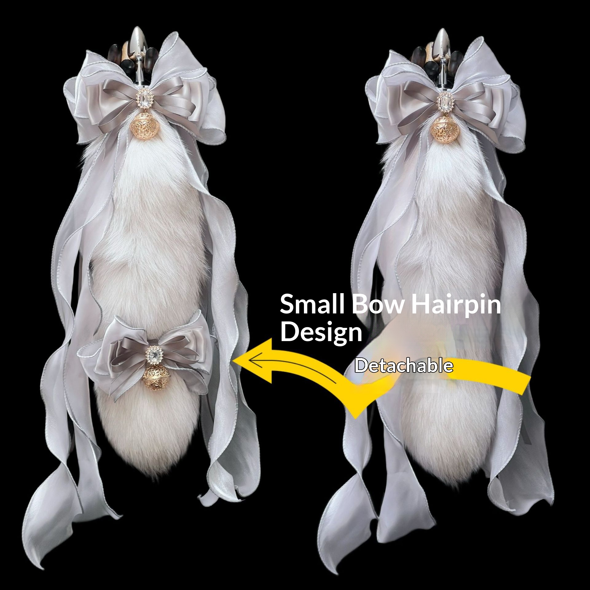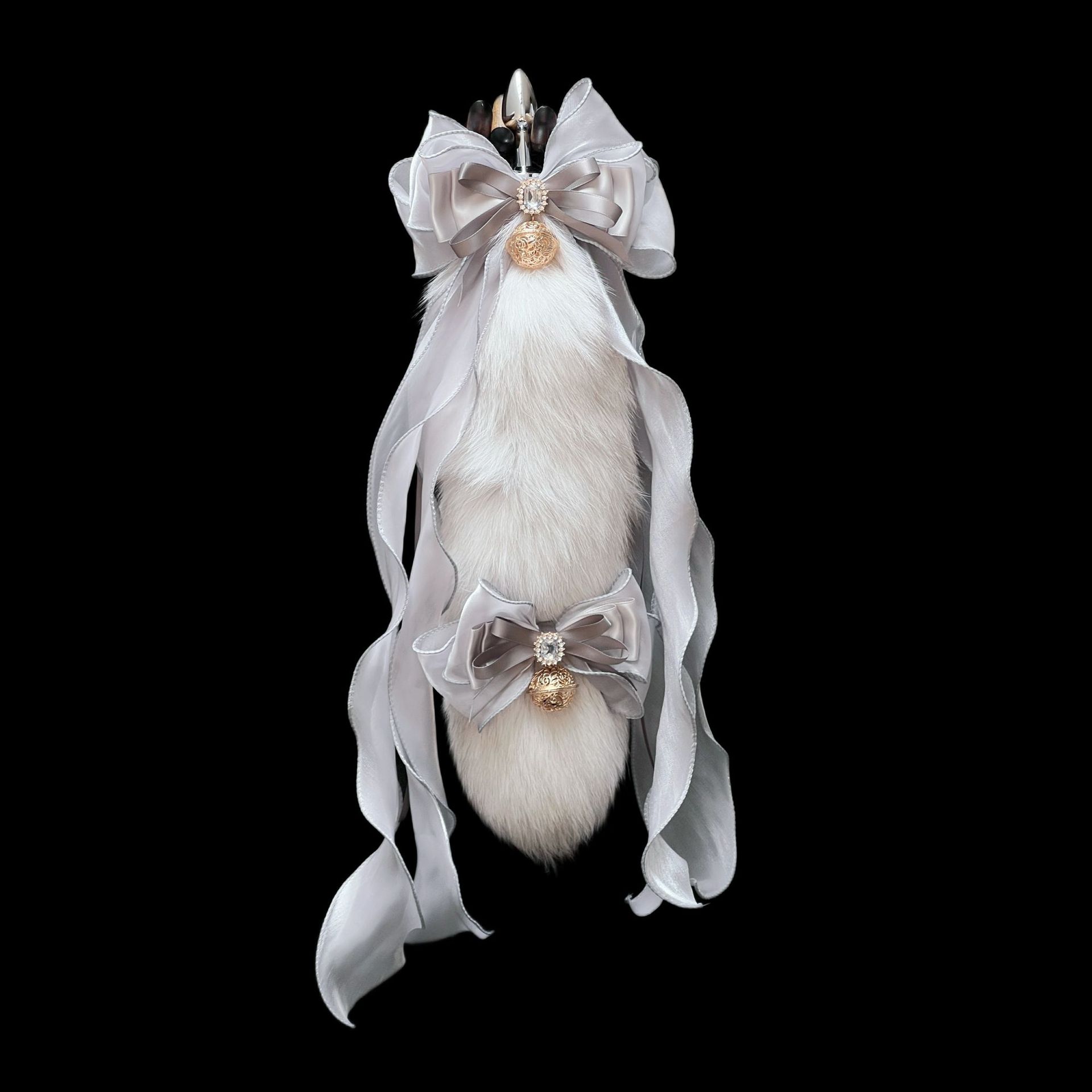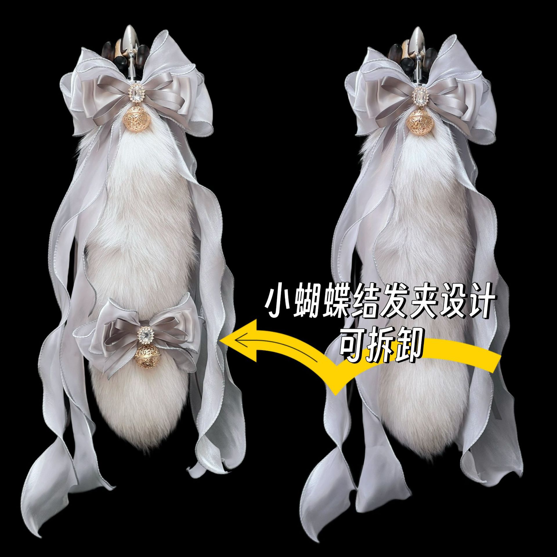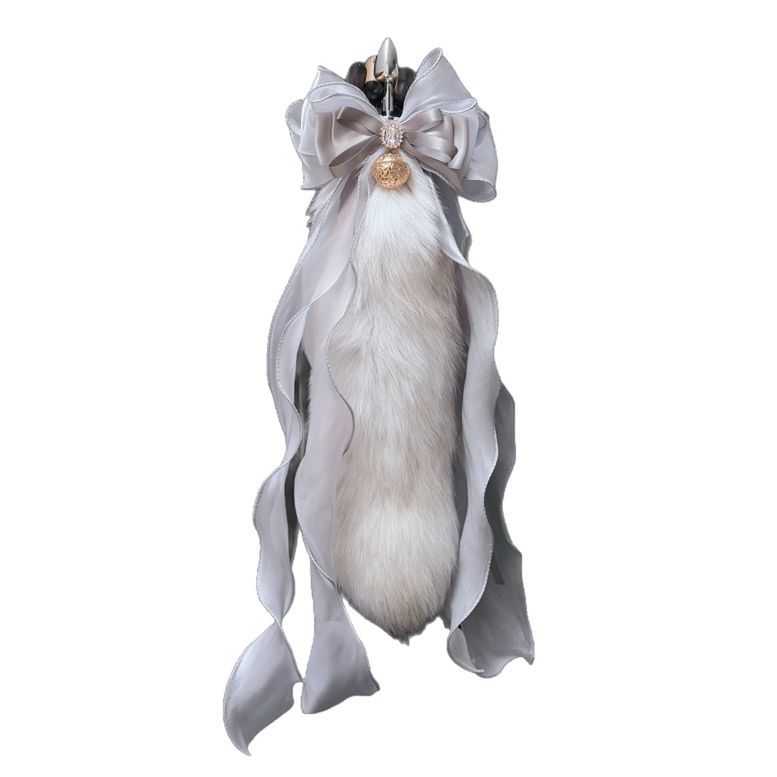 40CM silver gray fox real fur tail, 40CM large ribbon bow, 3.0CM Palace Bell.