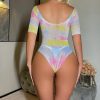 Gradient pink, sexy European/US-style bikini jumpsuit with short sleeves and a net wrap hip skirt. Offers a bold, alluring look with a figure-hugging silhouette. Unique gradient color and net detailing enhance visual appeal.