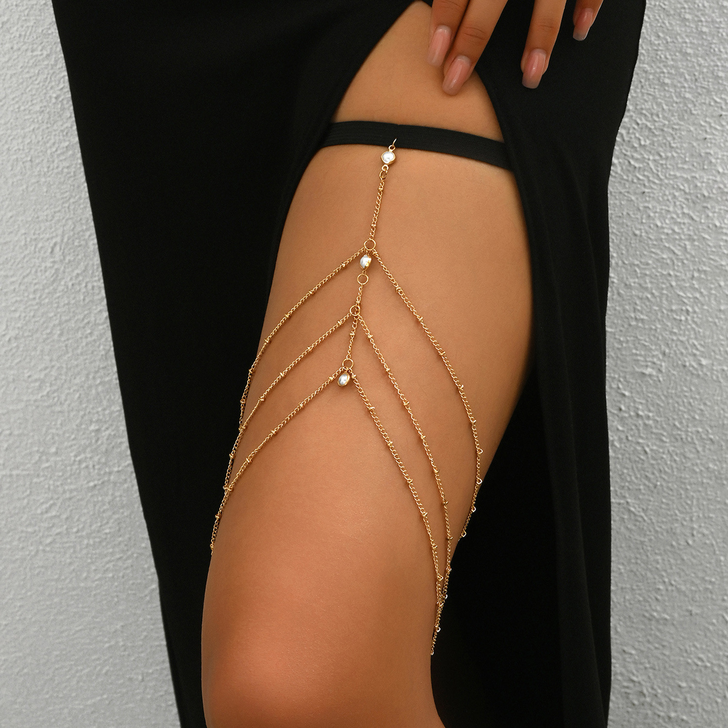 Trendy and versatile thigh chain adds a touch of edgy glamour to any outfit. Simple design makes it easy to pair with various styles, while the adjustable fit ensures comfortable wear. Elevate your look with this must-have fashion accessory.