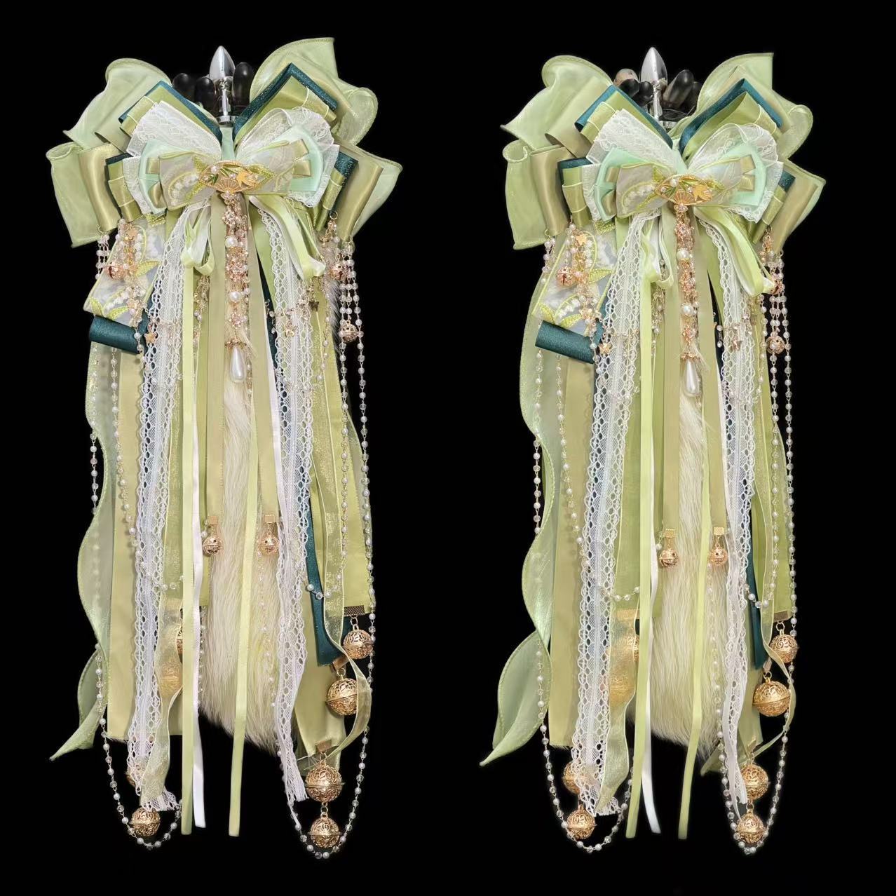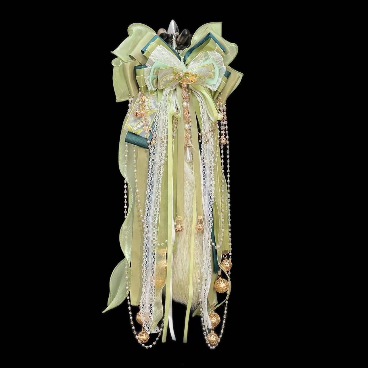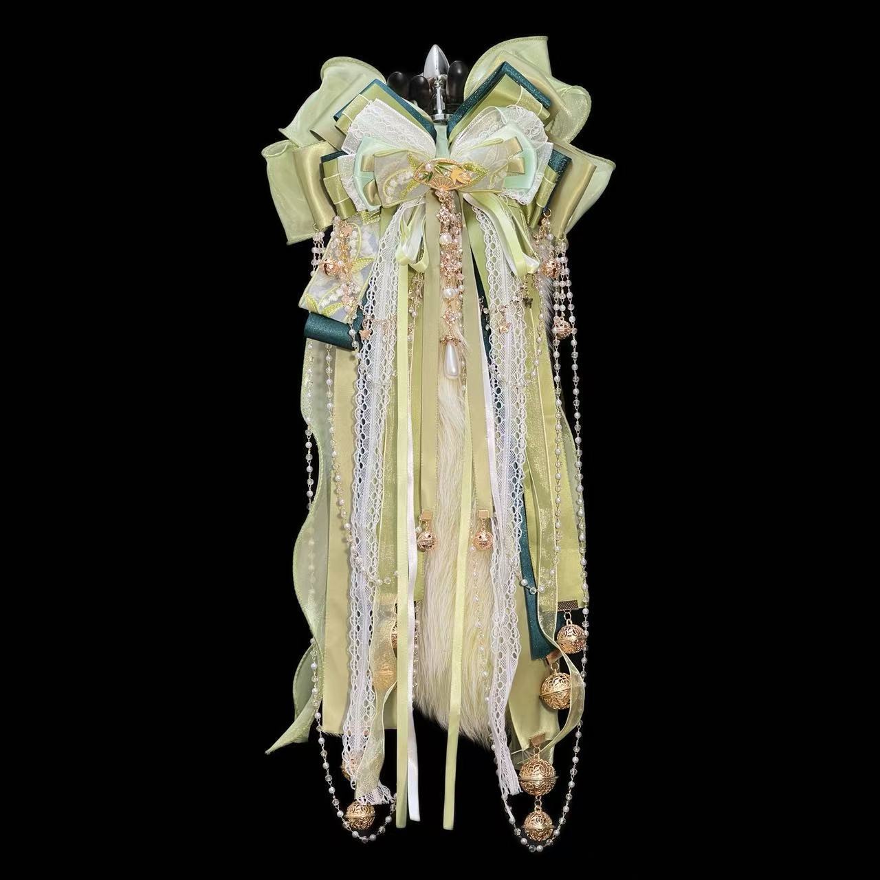 Handmade heavy industry Matcha green bow bandage removable, zircon, Shell Pearl, 1.2CM brass bell, 2.1 2.6CM Palace Bell, imitation pearl glass chain.
