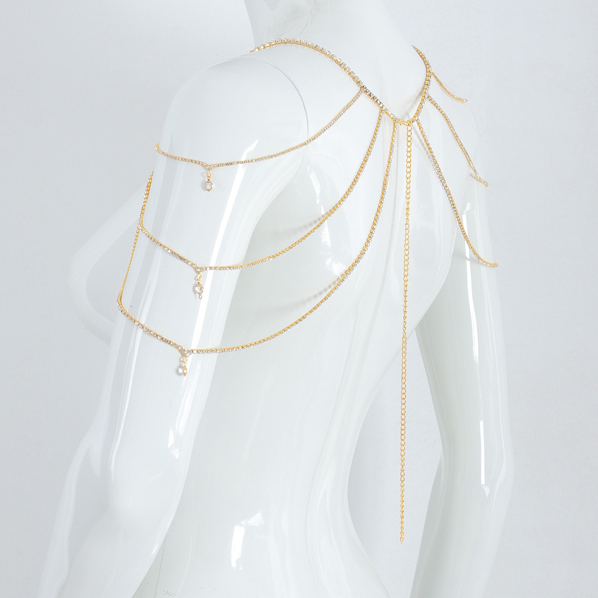Imagine the spotlight catching the shimmering rhinestones as you move, creating a mesmerizing cascade of light that draws every eye. This multi-layer chain is meticulously crafted to drape elegantly across your chest and shoulders, mimicking the luxurious feel of a shawl while adding a touch of edgy glamour.