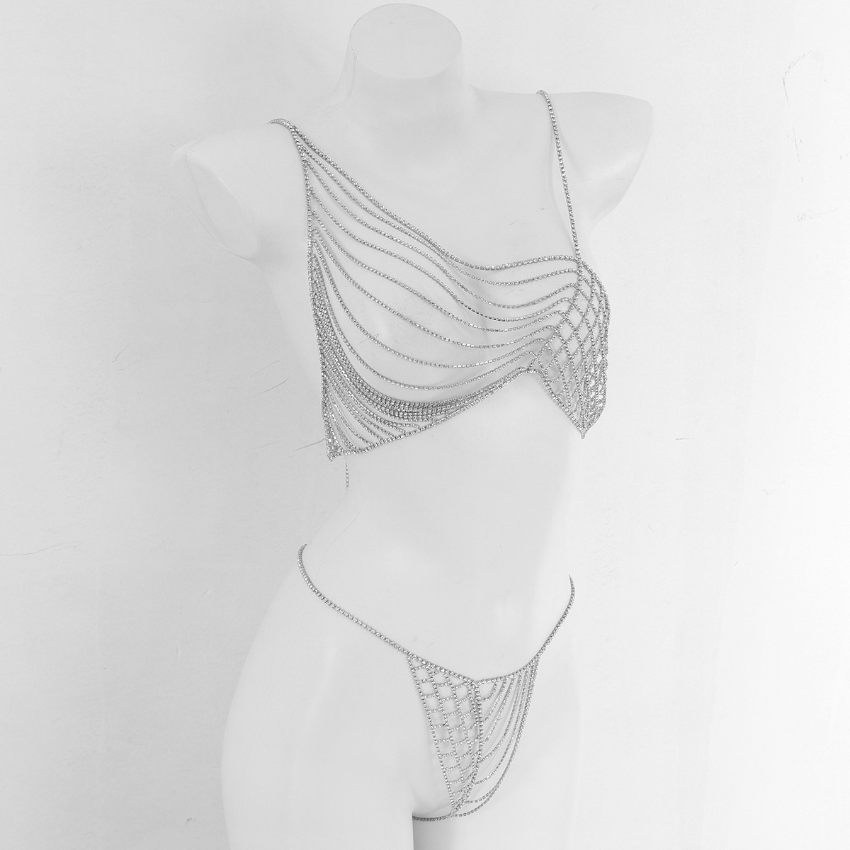 Dazzling rhinestone chest chain jewelry for women. Elevate your look with this sexy, European and American-inspired body chain, perfect for nightclubs, beaches, or adding a touch of glamour to any outfit. Transforms bikinis into statement pieces. Unique, eye-catching design.