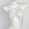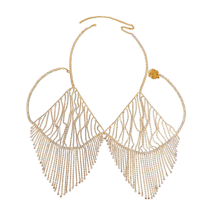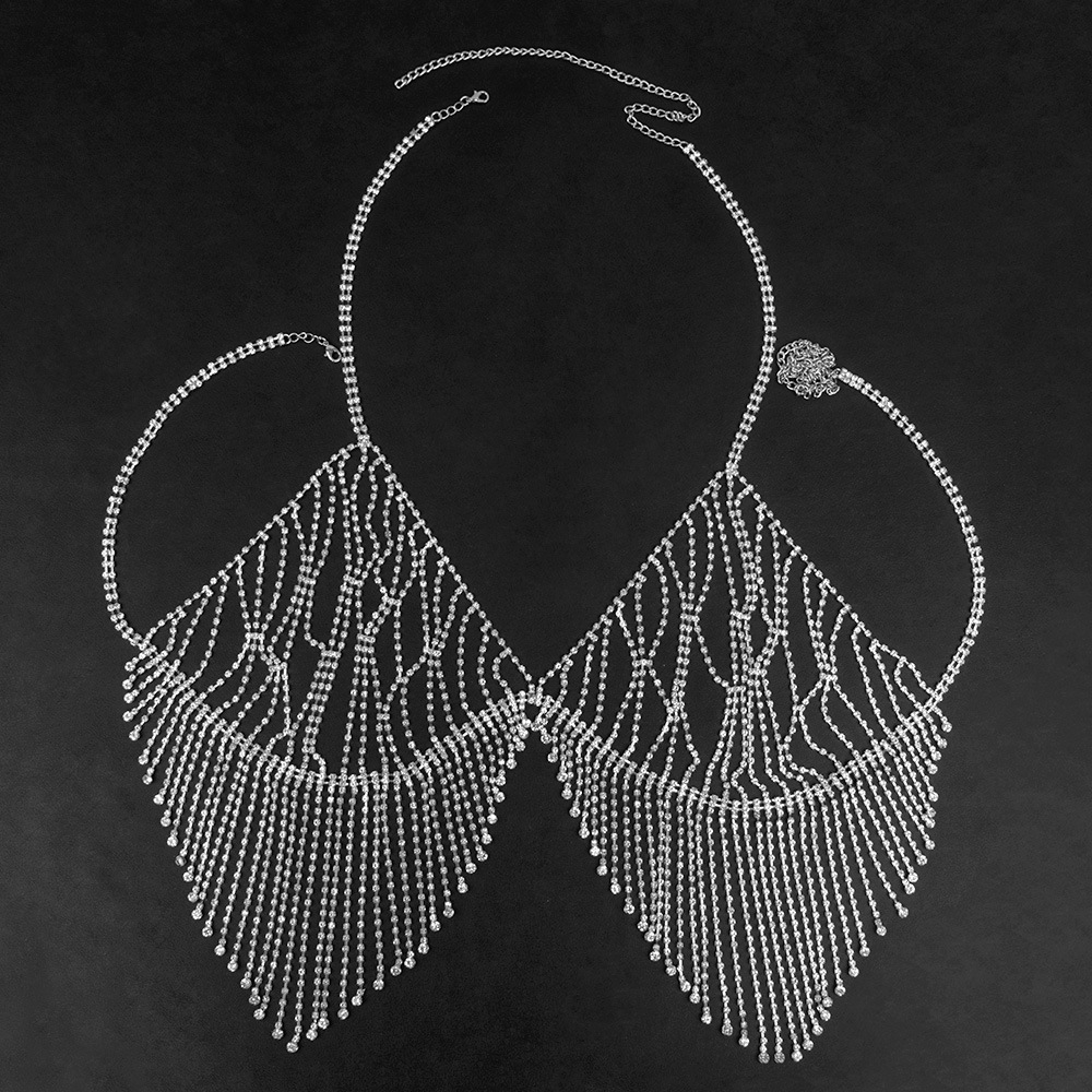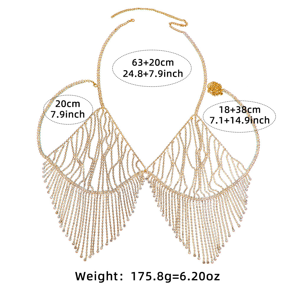 A dazzling rhinestone tassel chest chain, perfect for adding a touch of sexy glamour to any night out. This European and American-inspired body chain features a hollow design and full diamond bra-style construction, making it a unique and eye-catching accessory for parties and special occasions.