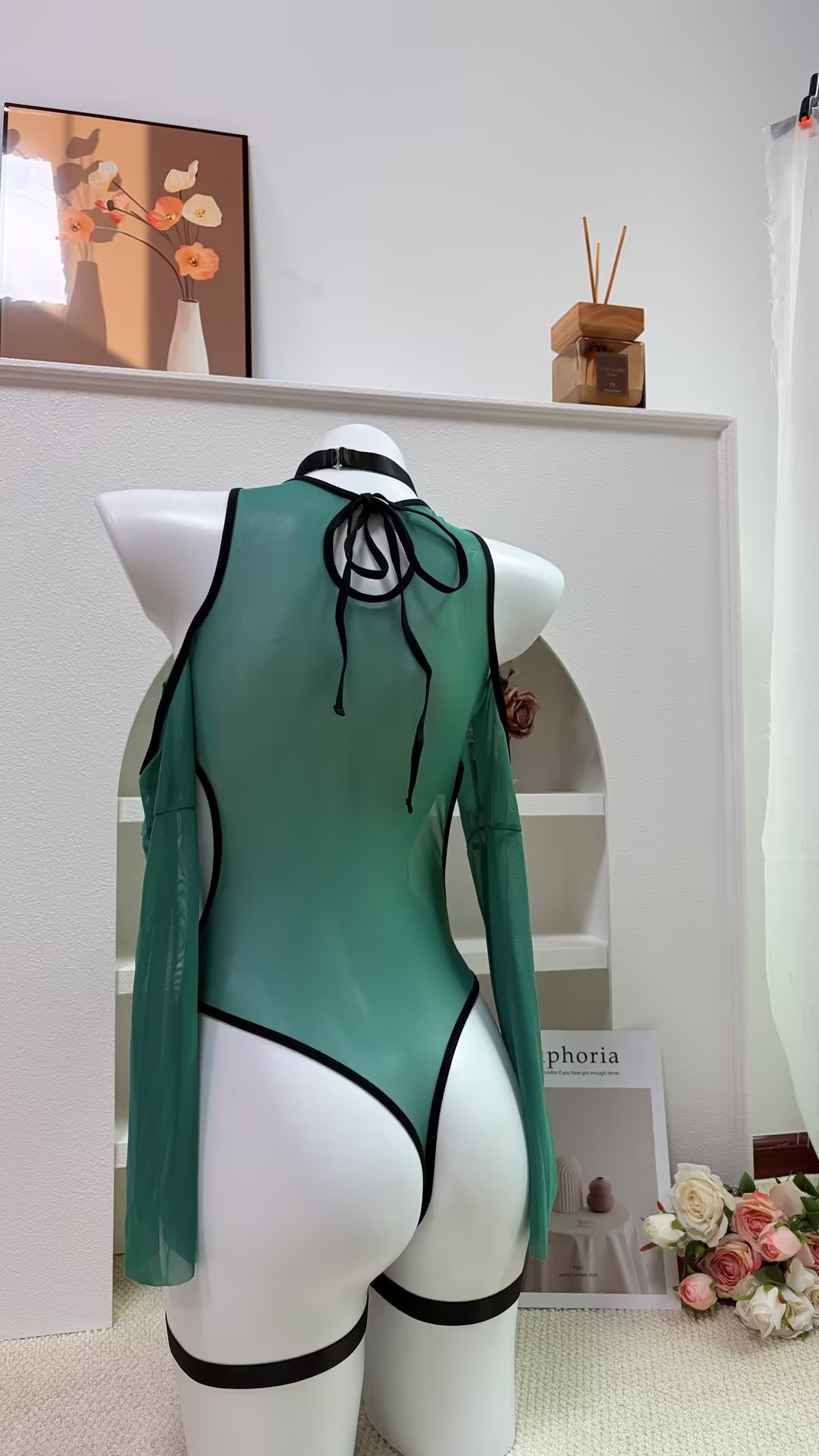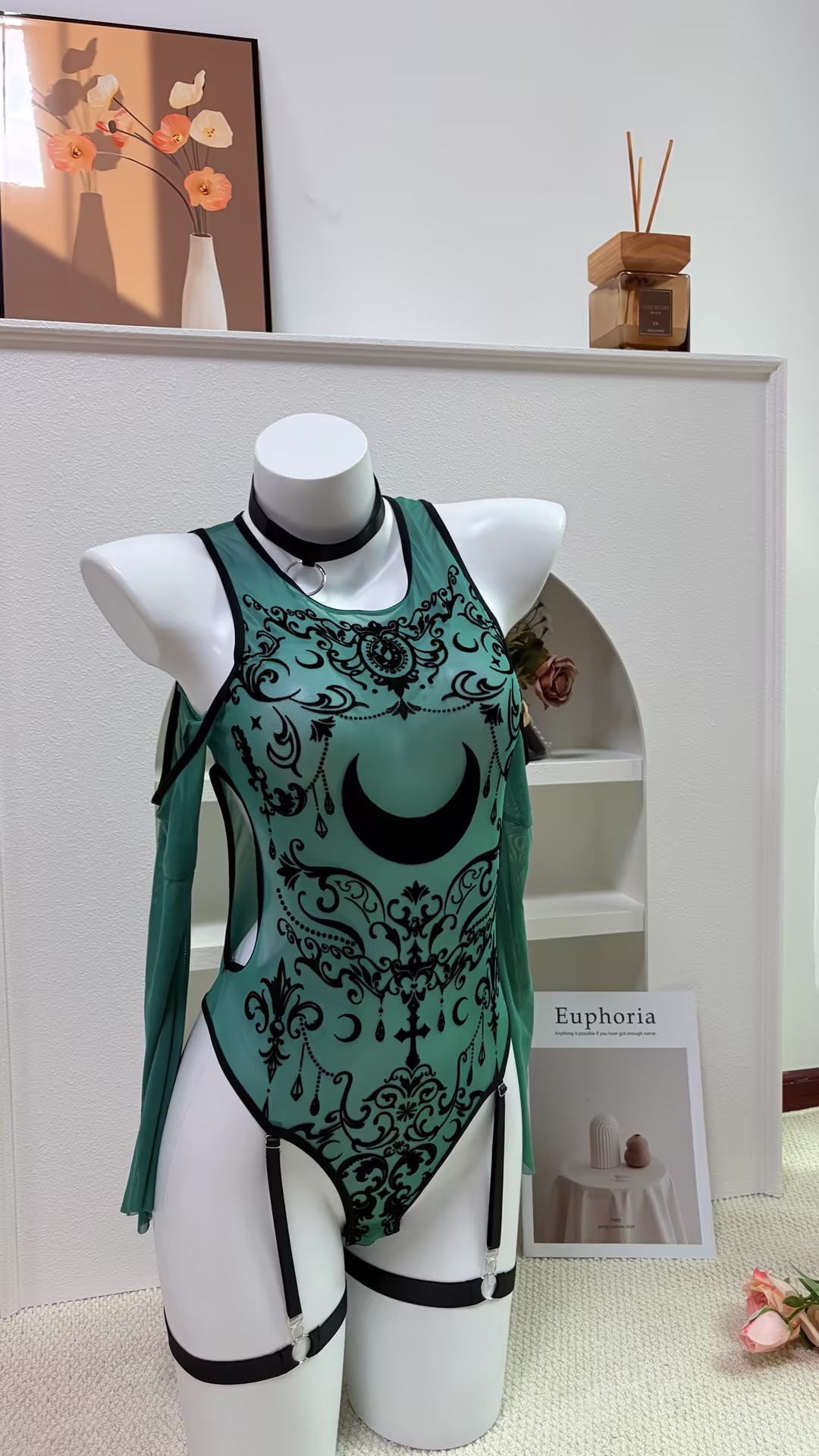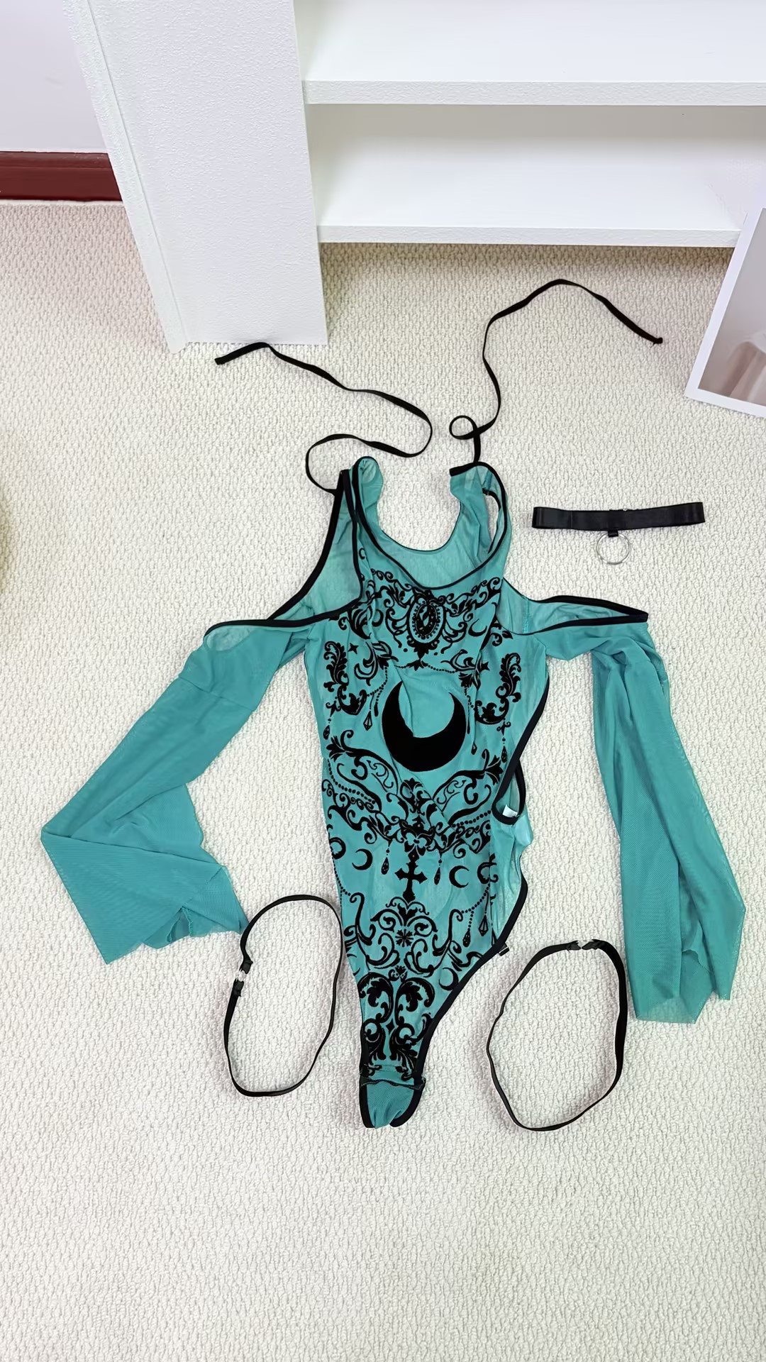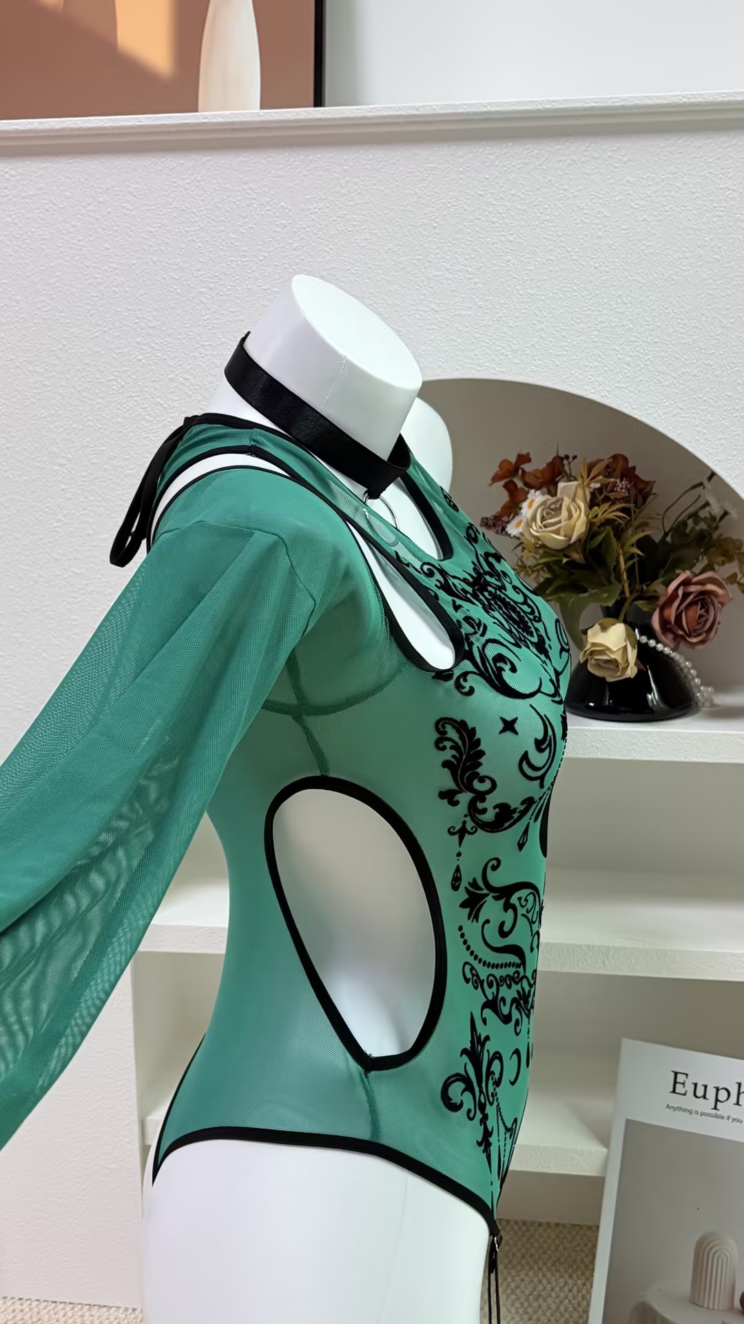 Sexy See-Through Print Off-Shoulder Lingerie One-Piece with Free Bottom