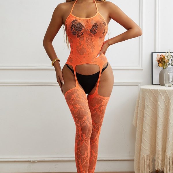Sultry orange jumpsuit featuring a lace-up neck, intricate jacquard pattern, and daring open crotch pantyhose design. This piece combines provocative elegance with a comfortable, form-fitting silhouette, offering a bold and unforgettable lingerie experience.