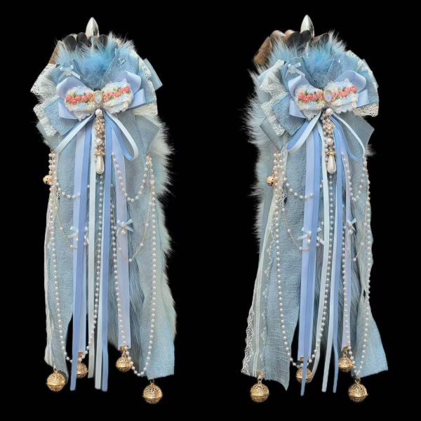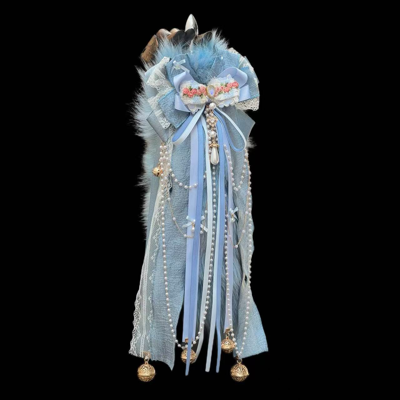 Handmade lake blue bowknot fixed non-removable, 1.2CM brass bell, 2.6CM Palace Bell, imitation pearl chain.
