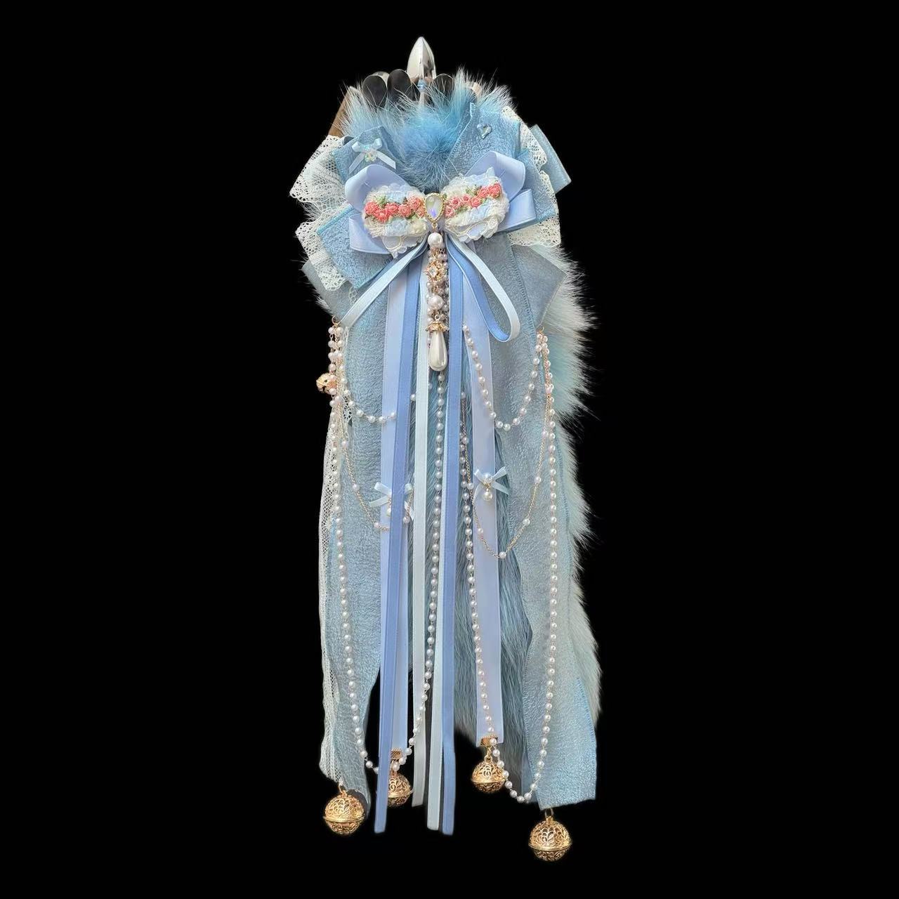 40CM Lake Blue Fox Tail – Real Wool Cosplay Prop with Bell Accent