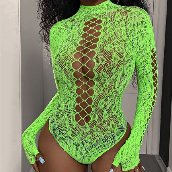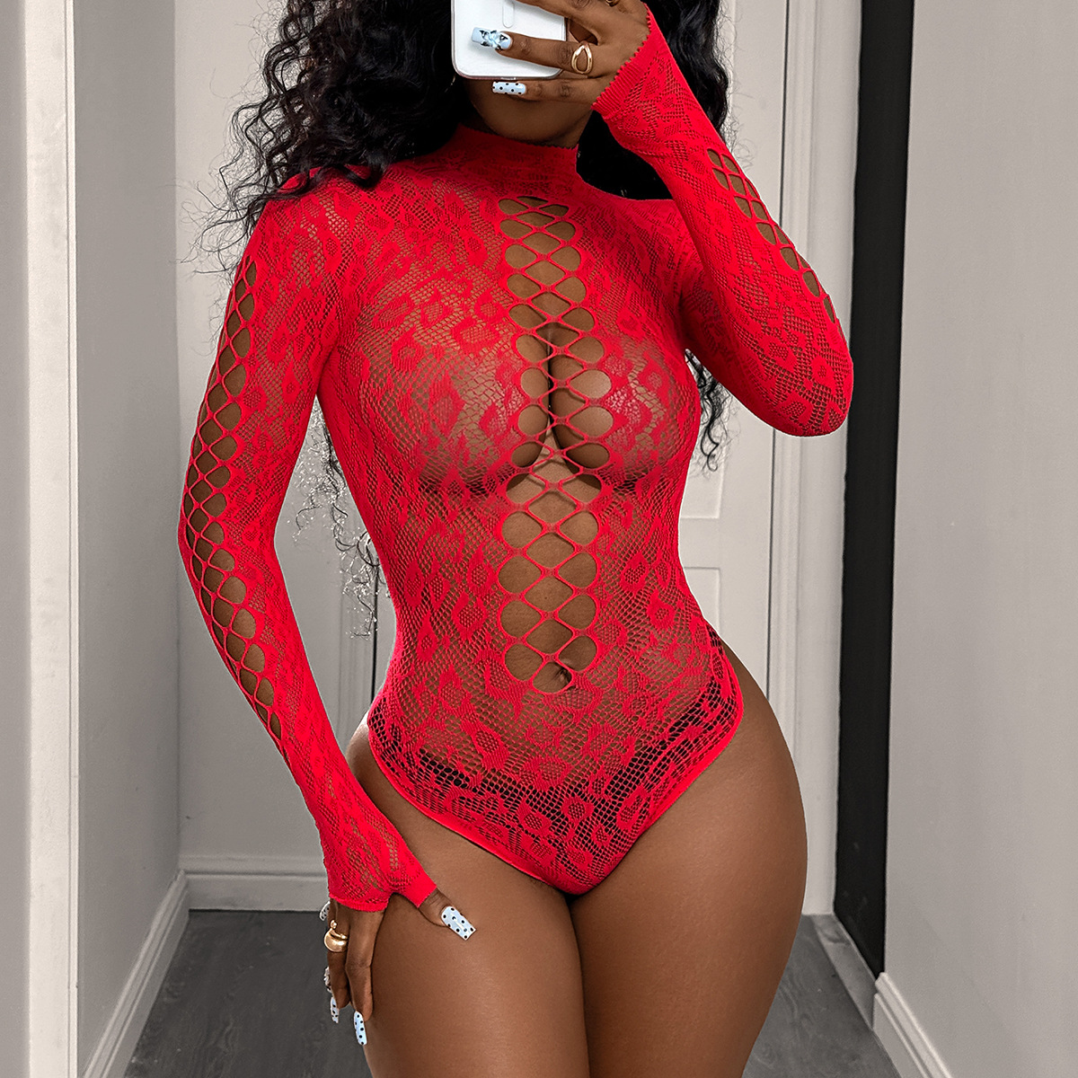Purple charm sexy lingerie sexy seduction hollow-out tight bikini long sleeve turtleneck mesh bodysuit W684