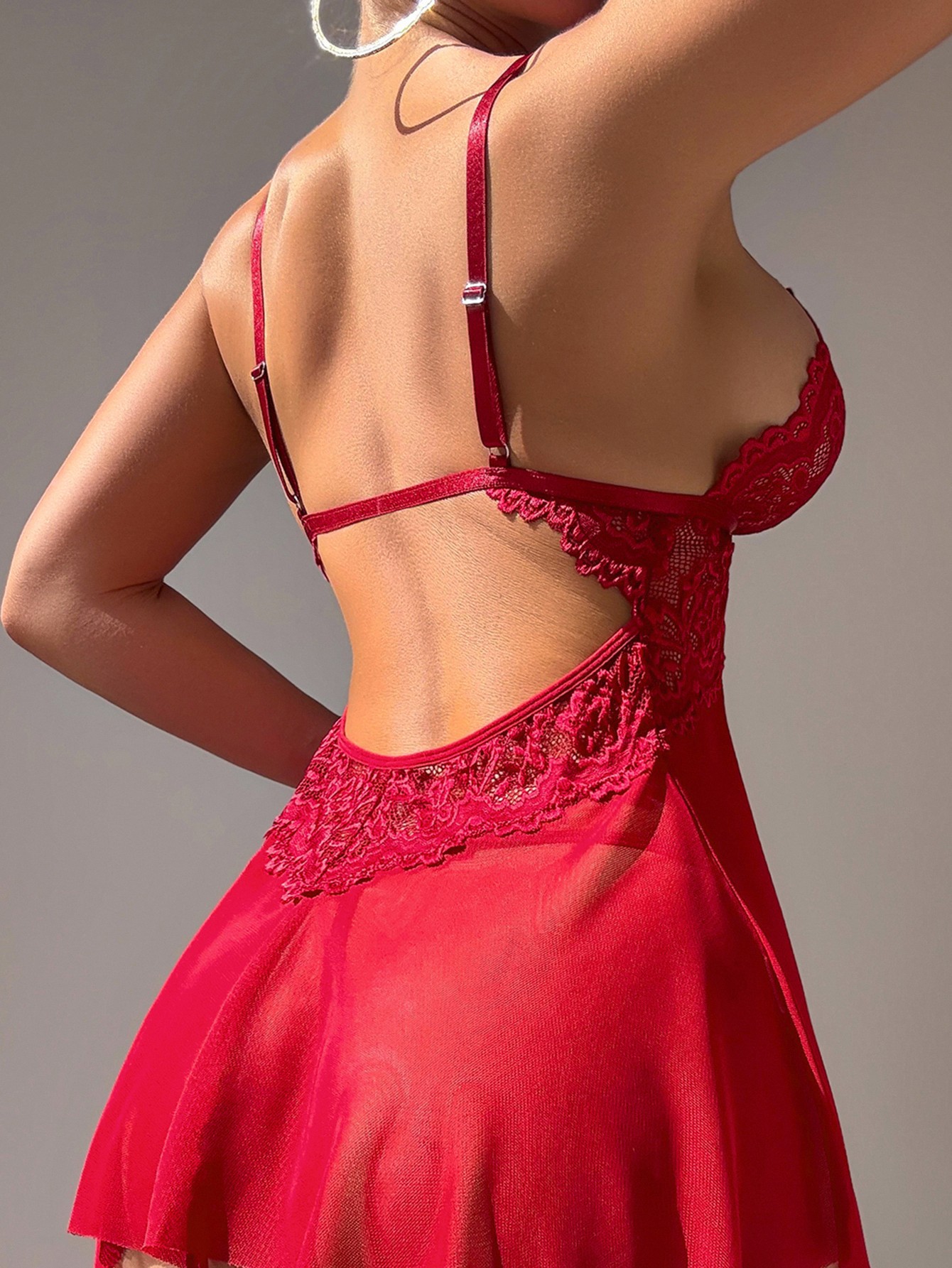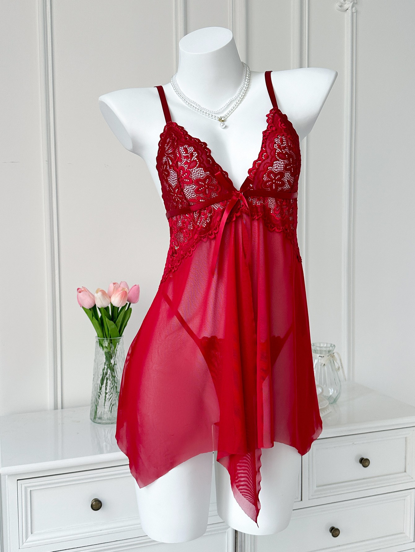Sexy Lace Bow Suspender See-Through Pleated Dress Lingerie