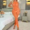 Sultry European-American lingerie: a mesh, hanging-neck, ripped-detail jumpsuit. Features long sleeves, a backless design, and a tight fit for a provocative silhouette. Unique selling point: combines edgy rips with delicate mesh for a daring yet sophisticated boudoir look.