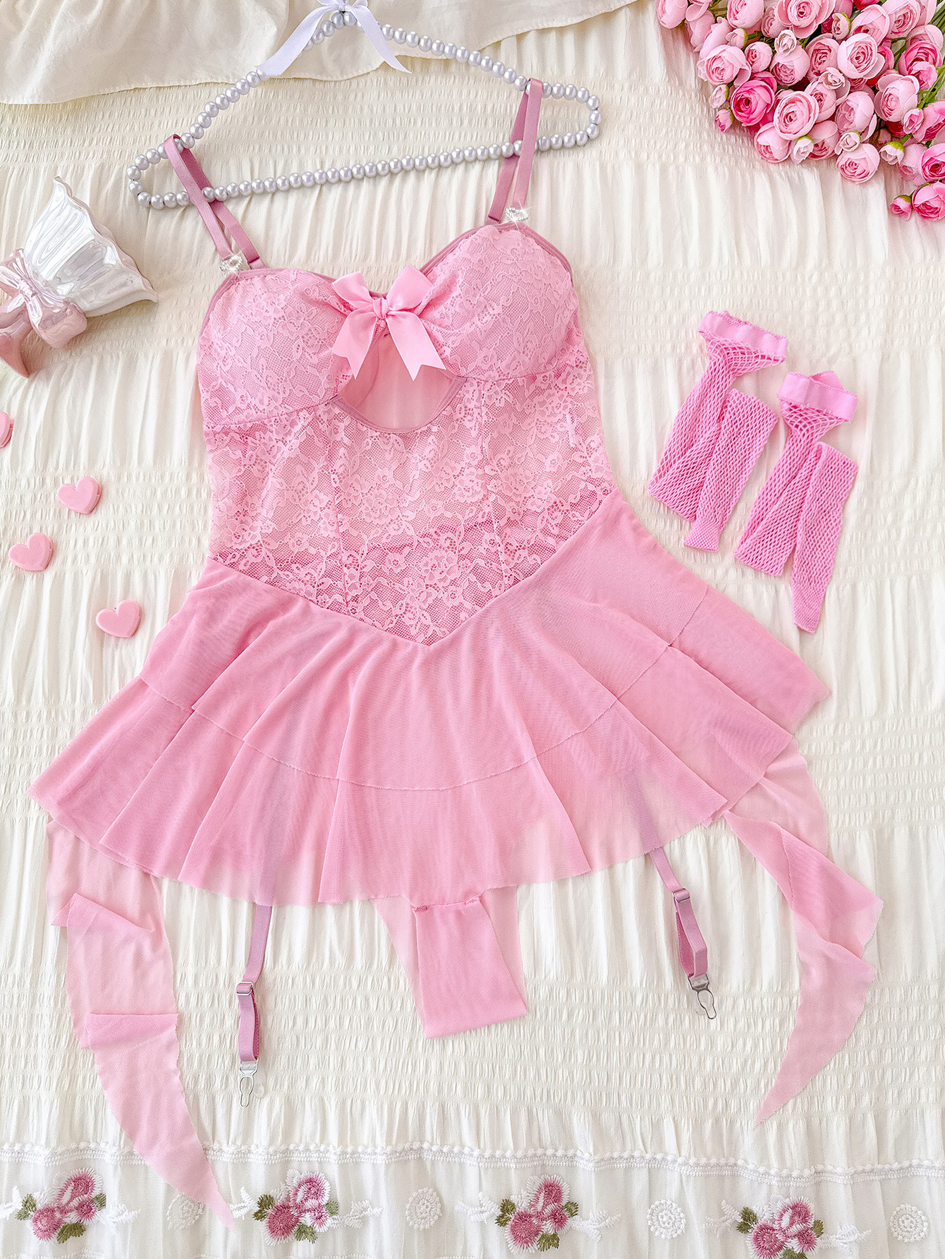 Sexy Lace Backless Sling Nightdress with Mesh Stockings Lingerie Set