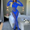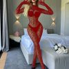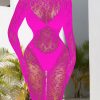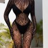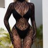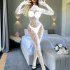 Sultry European/American-inspired lingerie featuring a long-sleeved, one-piece mesh design with integrated stockings and a closed crotch. Its sheer fabric offers a provocative, see-through perspective, emphasizing sensuality and creating a captivating silhouette.