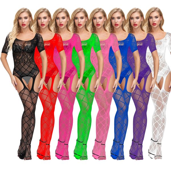 Seductive lingerie jumpsuit featuring a net stocking design with intricate jacquard patterns. Lace-up detailing and an open crotch offer provocative appeal. A unique and daring piece designed to enhance sensuality and confidence.